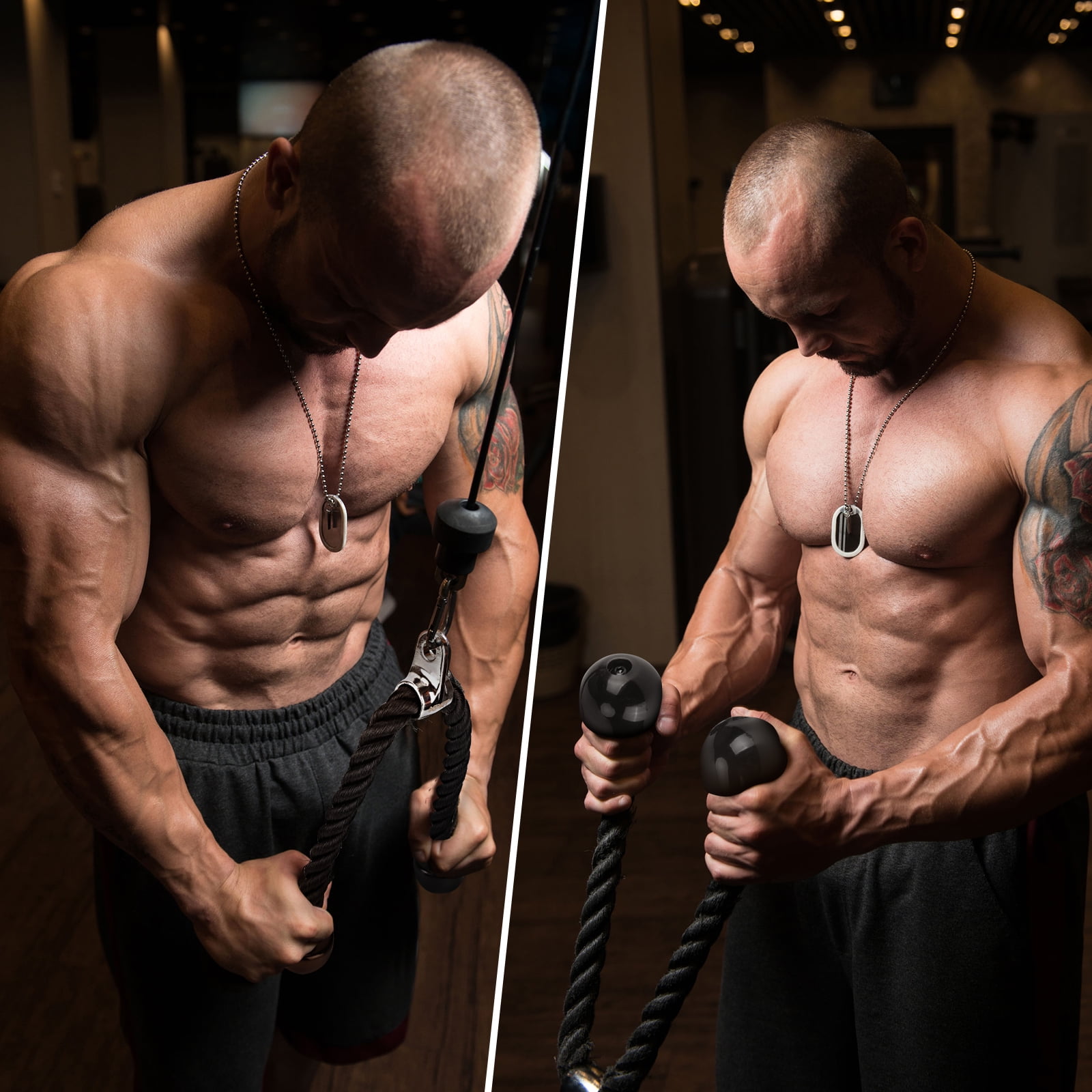 Tricep Rope: Versatile attachment for various training. Heavy-duty Nylon braided rope with sturdy solid endcaps prevent hands from sliding off the rope, 360-degree chrome swivel hanger. Support up to 800 lbs V Handle with Rotation also called Double D Handle: Chrome solid steel Handle with 360-degree swivel hanger, textured rubber coating on both handles provide secure grip and protection during training V-Shaped Bar: Anti-slipping ergonomic rubber coating on both ends of the solid V-shaped steel, 0.6-inch hole flat knob fits for all cable machines.