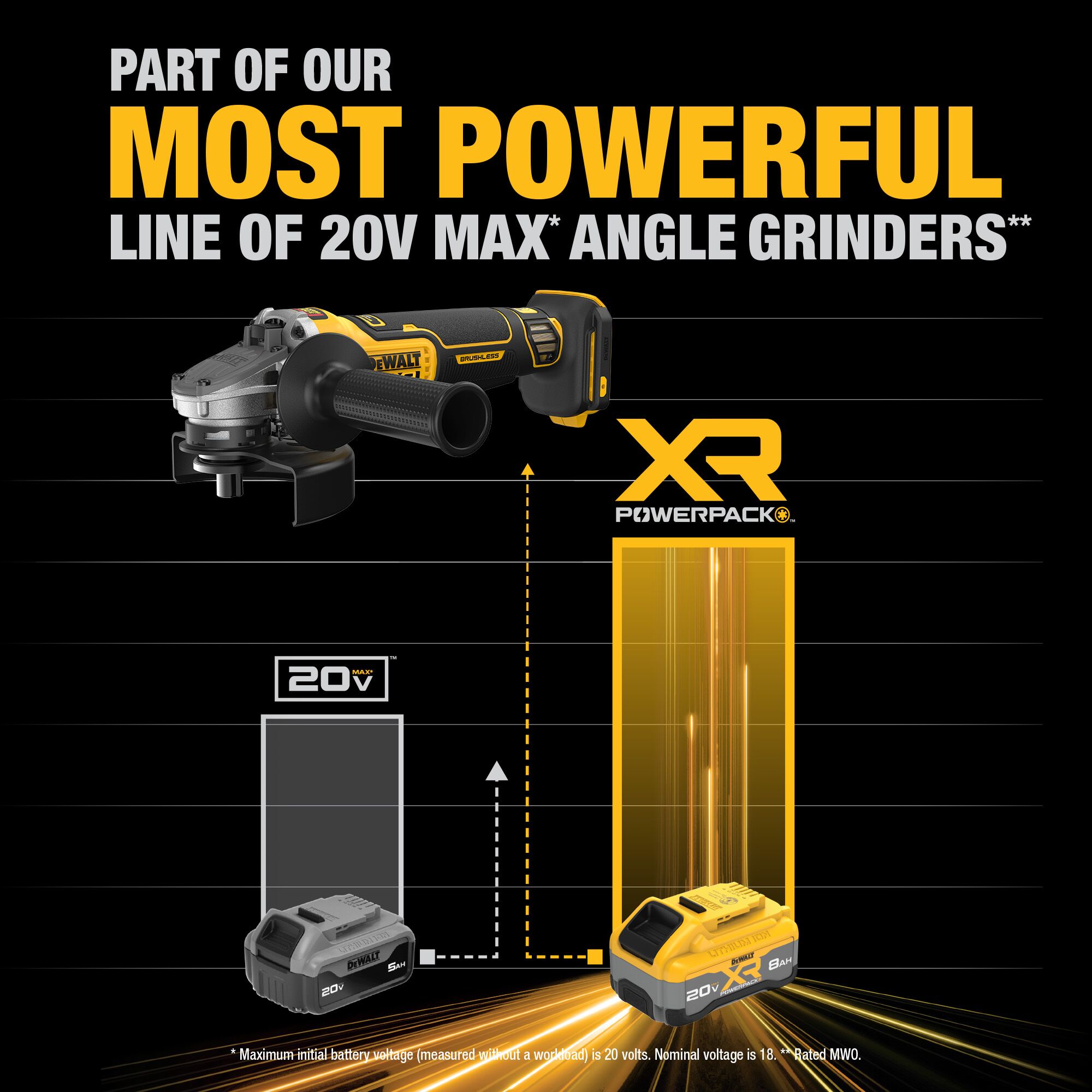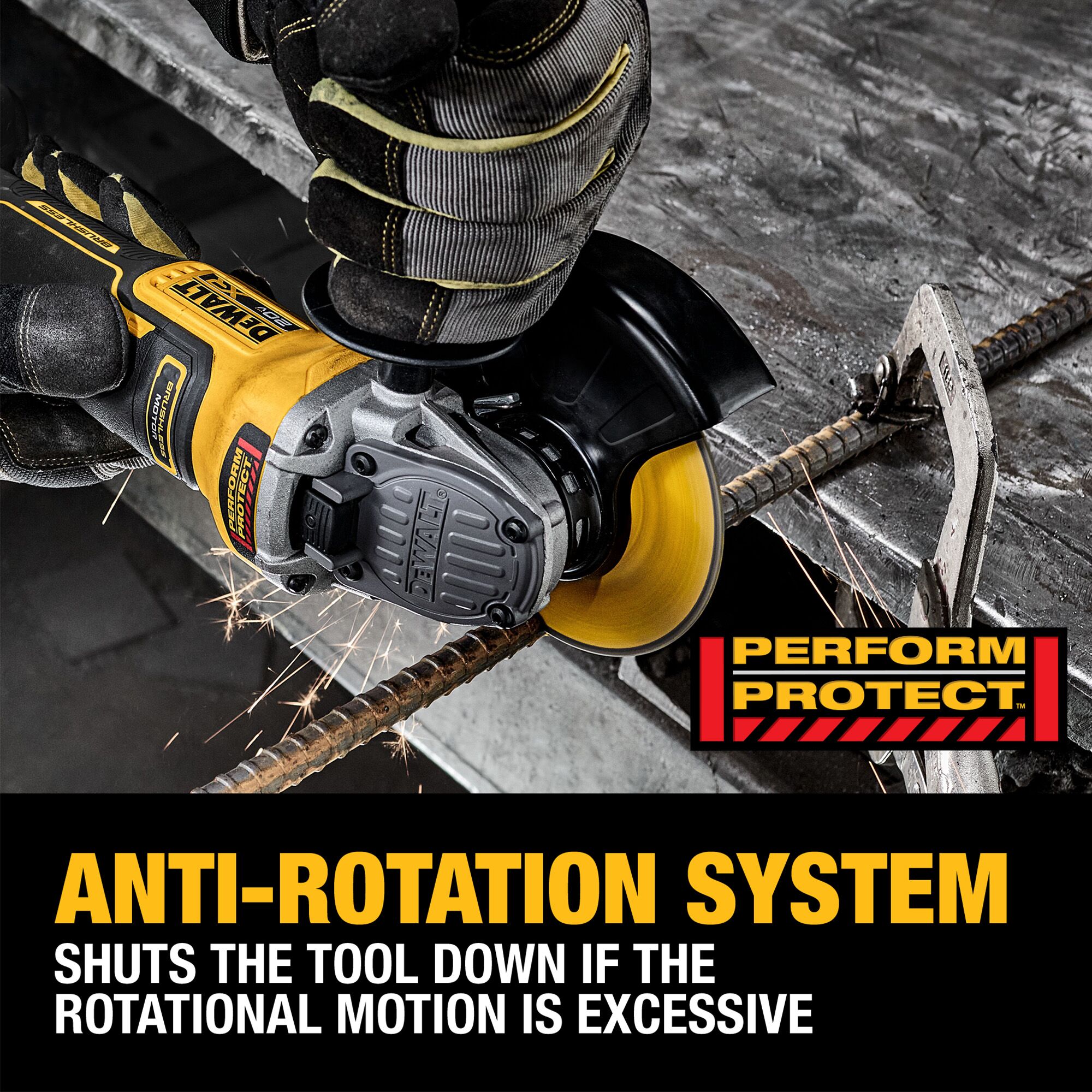 Complete a variety of applications with the 20V MAX* XR® 4-1/2 – 5-in Angle Grinder. As part of our most powerful line of 20V MAX* Angle Grinders*, this tool is equipped with PERFORM & PROTECT™ features including the ANTI-ROTATION SYSTEM. Engineered with a brushless motor that delivers up to 1,590 MWO and 9,000 RPM (no load), this 20V MAX* XR® tool delivers confidence for pros who expect excellence.