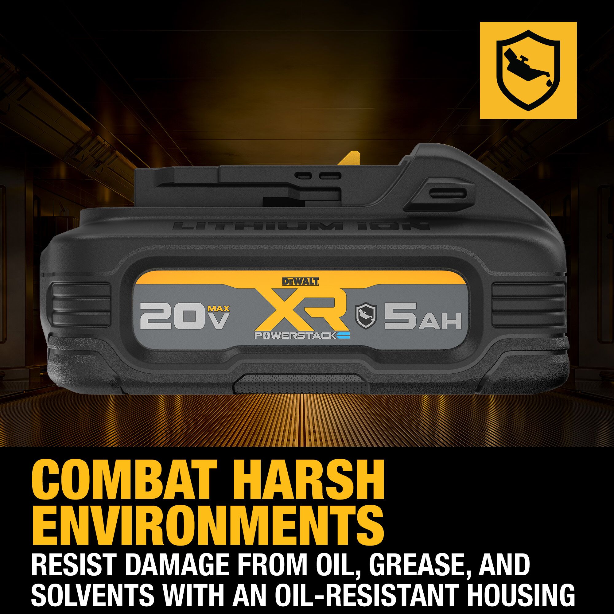 The 20V MAX* XR® POWERSTACK™ Oil-Resistant 5Ah Battery delivers 50% more power** and a longer lifespan**. Engineered with pouch cell technology, our best performing 20V MAX* 5Ah battery† powers through tough jobs, day in and day out. XR® POWERSTACK™ batteries are a part of our best performing line of 20V MAX* batteries†† and are compatible with 20V MAX* tools.