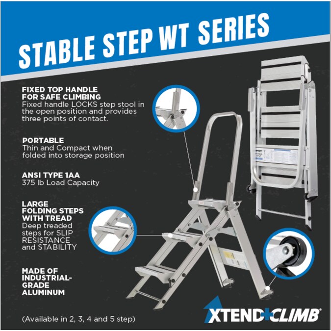 Xtend+Climb® Construction Series WT2 2-step stool ladder is the perfect industrial grade tool in various environments. This sturdy step stool ladder is crafted of lightweight, industrial-grade aluminum. Featuring a unique combination of extra wide and deep 8-inch steps with treads. The WT series is the perfect multi functioning step ladder, highly functional and storable suitable for any job site or project that requires extra durability. This step ladder is designed for comfort while ascending and descending the ladder, feeling like walking up and down stairs. Designed with non-slip steps ensures excellent balance retention, providing stability during use. These staircase steps serve as an ideal solution for temporary staircases, such as when framing a house or welding stairs. The wide, rubberized feet offer a secure grip on grates and other surfaces, preventing any potential sliding that smaller ladders might encounter. Xtend+Climb® makes highly functional, storable step stools suited for unique needs around the home, office, or work site. Available in 3-step. 4-step, and 5-step. -SAFE – ASHNI/OSHA certified and meticulously designed to achieve a higher level of safety -STORABILITY – Folds compact and can be stored almost anywhere in your home, office, or work site -PORTABILITY – Ultra lightweight, this sturdy step stool is crafted of lightweight aluminum -EASY TO USE – Simply lightweight and foldable -ECO FRIENDLY – Sensible alternative to a heavy and bulky step stool, designed with minimal plastic accents
