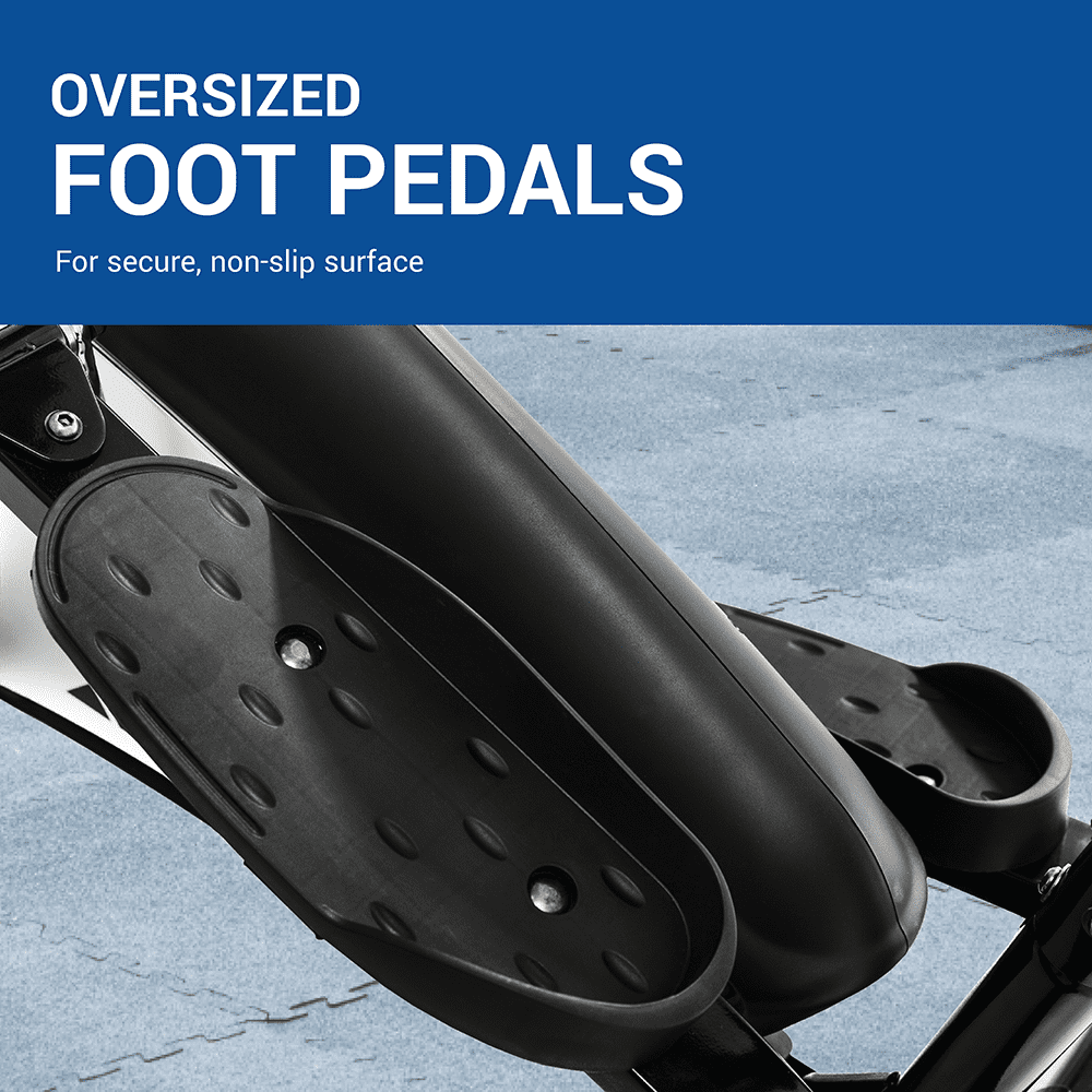 The XTERRA Fitness EU100 Hybrid Elliptical Upright Bike combines a full body elliptical workout with the seated comfort of an upright bike. It offers a smooth, non-impact, total-body workout in a compact design. Simply stand on the pedals to experience the elliptical trainer with a 13” stride length, 11 lb flywheel, belt drive system, and friction-free magnetic resistance. By sitting, you can change the intensity of your workout and target alternate muscle groups. This 2-in-1 combo workout combines two great pieces of equipment into one. The EU100 allows you to challenge yourself with 8 levels of resistance while you keep track of your workout data with the easy to use console. It provides feedback on your time, speed, distance, calories, and pulse, along with an odometer to keep track of your progress. Make your workouts more effective by easily monitoring your heart rate with the handlebar mounted hand pulse sensors. For improved comfort the EU100 provides a large contoured and padded seat that is adjustable not only up and down, but also forward and back for users of all sizes. It also comes with multi-grip soft padded handlebars along with oversized pedals. Start enjoying the convenience of total body conditioning in your home today with the XTERRA Fitness EU100 Hybrid Elliptical Upright Bike.