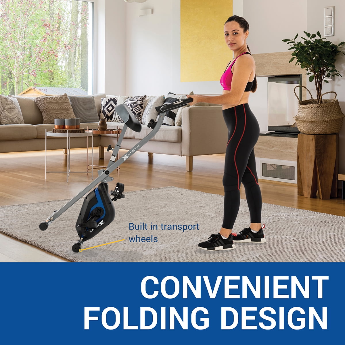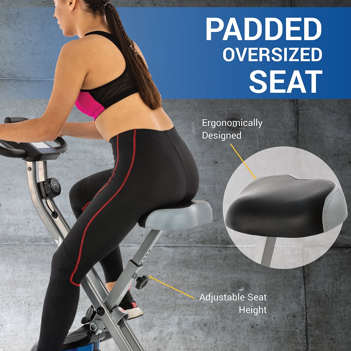 PERFORMANCE Solid X-frame design with thick steel tubing and a silent belt drive system 3.1 lb precision balanced flywheel with friction-free magnetic resistance 8 levels of manual resistance are easily controlled through the large dial tension knob TECHNOLOGY Easy-to-use LCD monitor displays important metrics including time, speed, distance, calories, and pulse Hand pulse sensors on the handlebars allow you to closely monitor your heart rate COMFORT Large adjustable padded seat Oversized adjustable foot pedals Built-in accessory tray ACCESSIBILITY Convenient folding frame design Transportation wheels for mobility Comfortably fits users from 4’10” to 5’10” Weight limit of 250 lb MORE DETAILS Resistance range: 8 levels Assembled dimensions: 31.7″ L x 18.1″ W x 42.7″ H Folded dimensions: 18″ L x 18″ W x 51″ H Weight limit: 250 lb WARRANTY 1 Year Frame 90 Days Parts