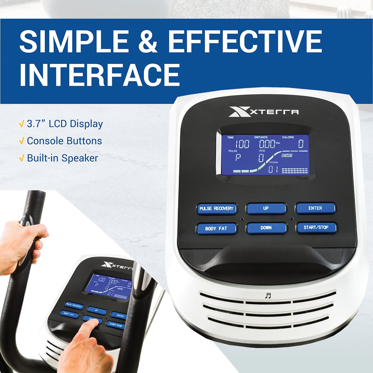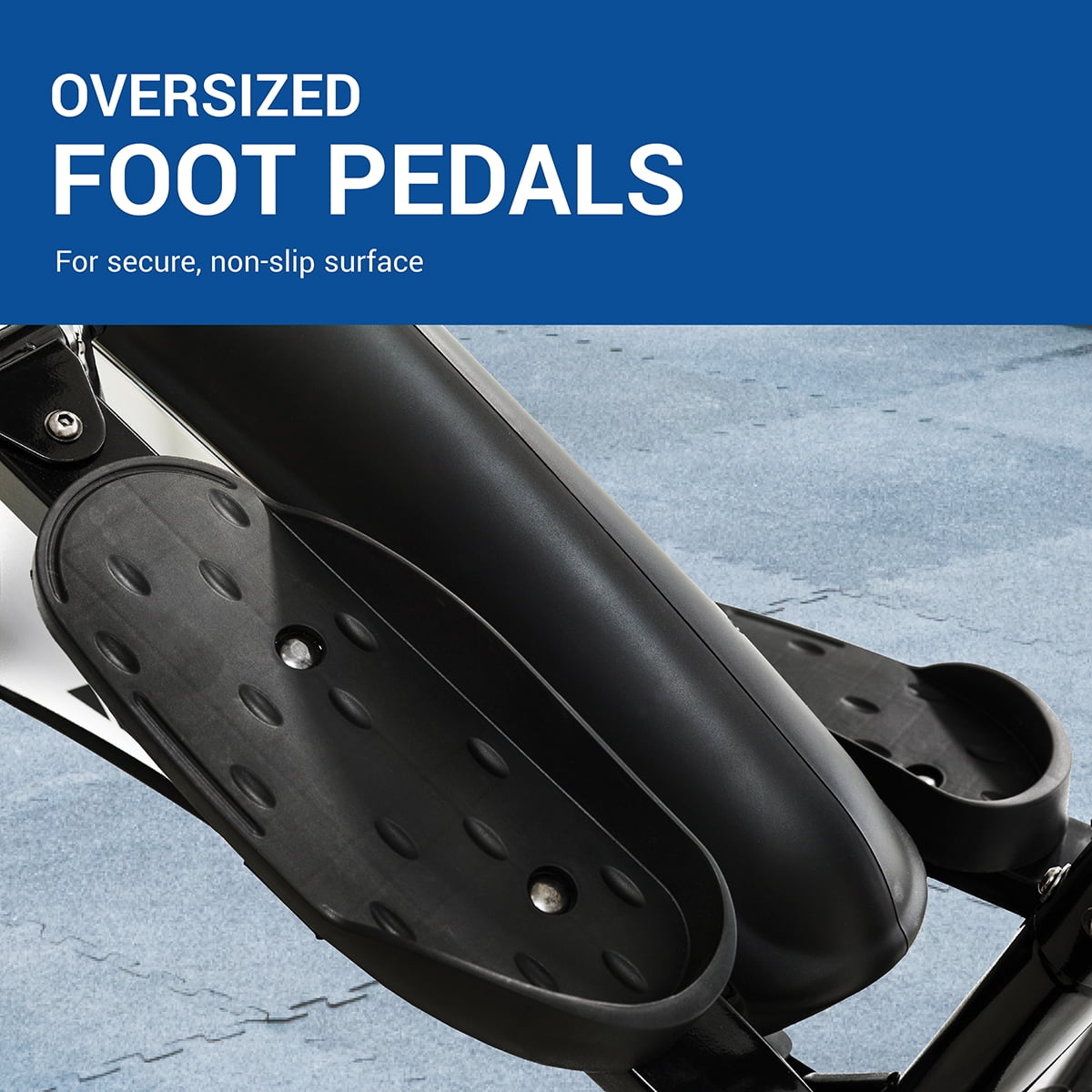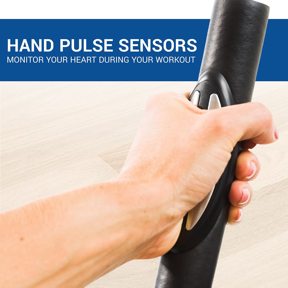 PERFORMANCE Sturdy frame is built with high-quality materials for ultimate durability to help you stick to your workouts day after day 8.8 lb precision balanced flywheel 8 levels of friction-free magnetic resistance TECHNOLOGY Simple and effective interface includes an easy-to-use LCD monitor Clearly displays your most important workout metrics including Time, Speed, Distance, Calories, and Pulse Hand pulse sensors located on the handlebars adjacent to the seat allow you to keep track of your heart rate and stay on top of your fitness goals COMFORT Large adjustable padded seat with comfort molded back Recumbent sitting position Oversized adjustable foot pedals Built-in tablet holder enables you to read or stream video ACCESSIBILITY Built with a convenient step-through frame design for maximum accessibility Compact footprint and built-in transport wheels mean this exercise bike can go wherever you need it most Comfortably fits most users from 4’10” to 5’10” tall Accommodates users up to 250 lb MORE DETAILS Power requirements: 2 AA Batteries (included) Assembled dimensions: 48.4″ L x 24.8″ W x 42.5″ H Recommended User Height: 4’10” to 5’10” Weight limit: 250 lb WARRANTY 1 Year Frame 90 Days Parts