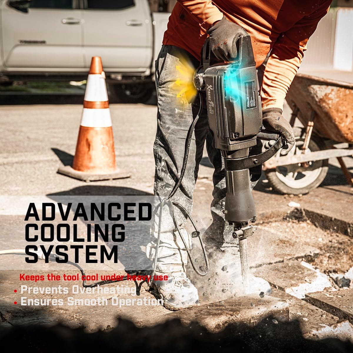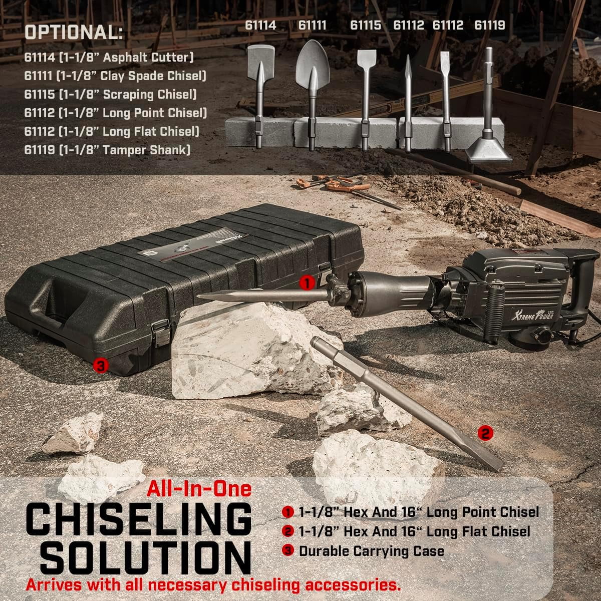 Specifications: Color: Gray Power Type: Electric Voltage: 110V/60Hz Motor Power: 2200 Watts Chuck Size: 1-1/8 In. Chuck Type: Hex No Load Speed: 1900RPM Speed: 1800 Impacts Per Minute Package Contents: 2200 Watt Electric Demolition Jack Hammer 16″ Bull Point Chisel 16″ Flat Chisel Protective Gloves Protective Goggles Oil Bottle 3 x Hex Keys Wrench Carrying Case with Handle The XtremepowerUS Electric Demolition Jackhammer delivers 1800 impacts per minute at 55 ft/lbs, capable of breaking even the toughest surfaces. Since no air compressor is required, this is one of the most portable jackhammers available.