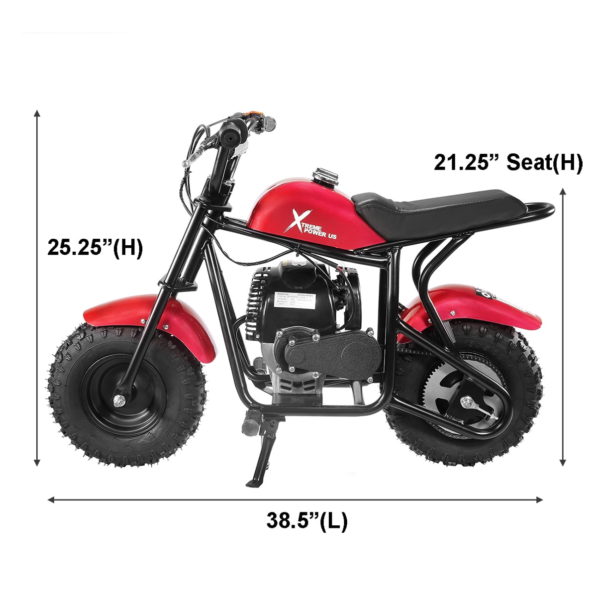 Specifications: Engine: 40cc 4-Stroke OHV Engine Start: Pull Start Fuel: Unleaded Petrol Maximum Speed: Up to 20mph Brake: Rear Disc Recommended Age: 13+ Max User Weight Capacity: 165 lbs Kickstand: Yes Seat Size: 10″(L) x 5″(W) Seat Height: 21-1/4″ Overall Dimension: 24″(W) x 38-1/2″(L) x 28-1/4″(H) Certificate: CE, EPA, RoHS Package Contents: 40cc Pocket Dirt Bike Manual The XtremepowerUS 40cc Mini Pocket Dirt Bike is the perfect starter bike for teens and adults. With a strong steel frame, grippy knobby tires, and a smooth-riding suspension, this gas-powered bike delivers the right mix of speed and control for backyard trails or dirt paths.