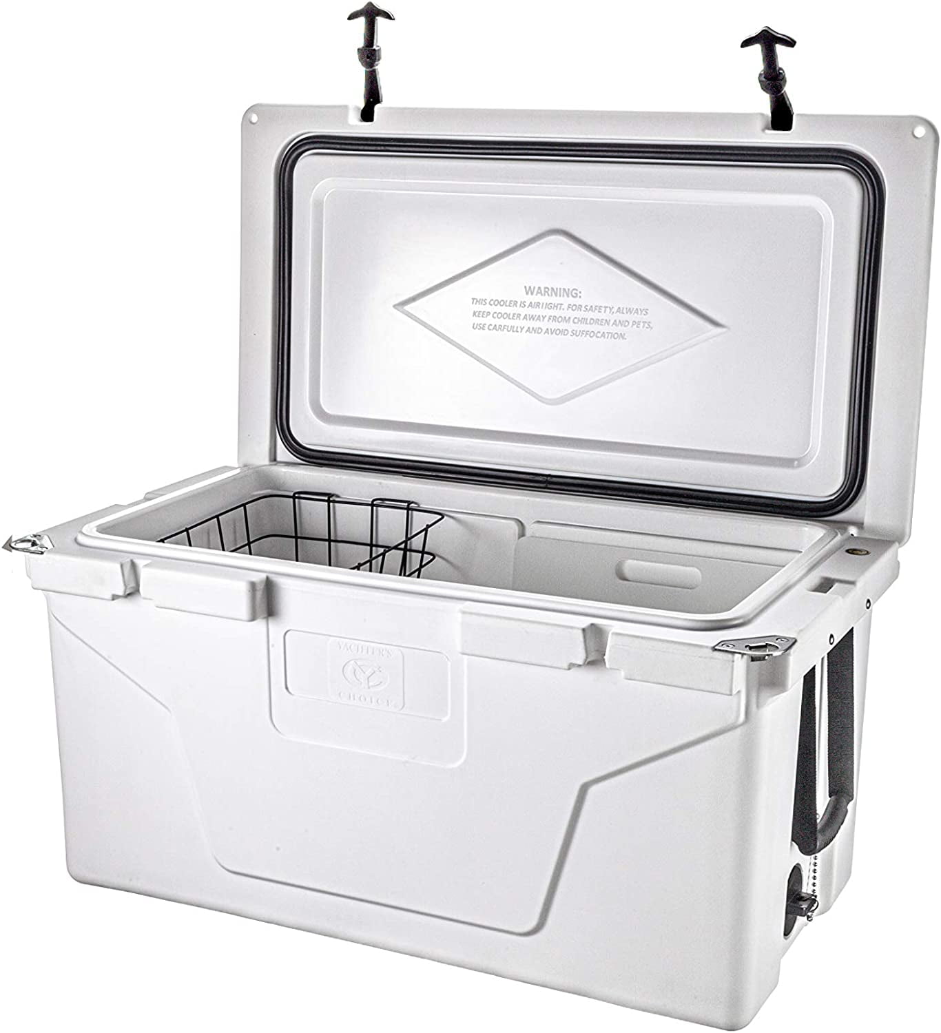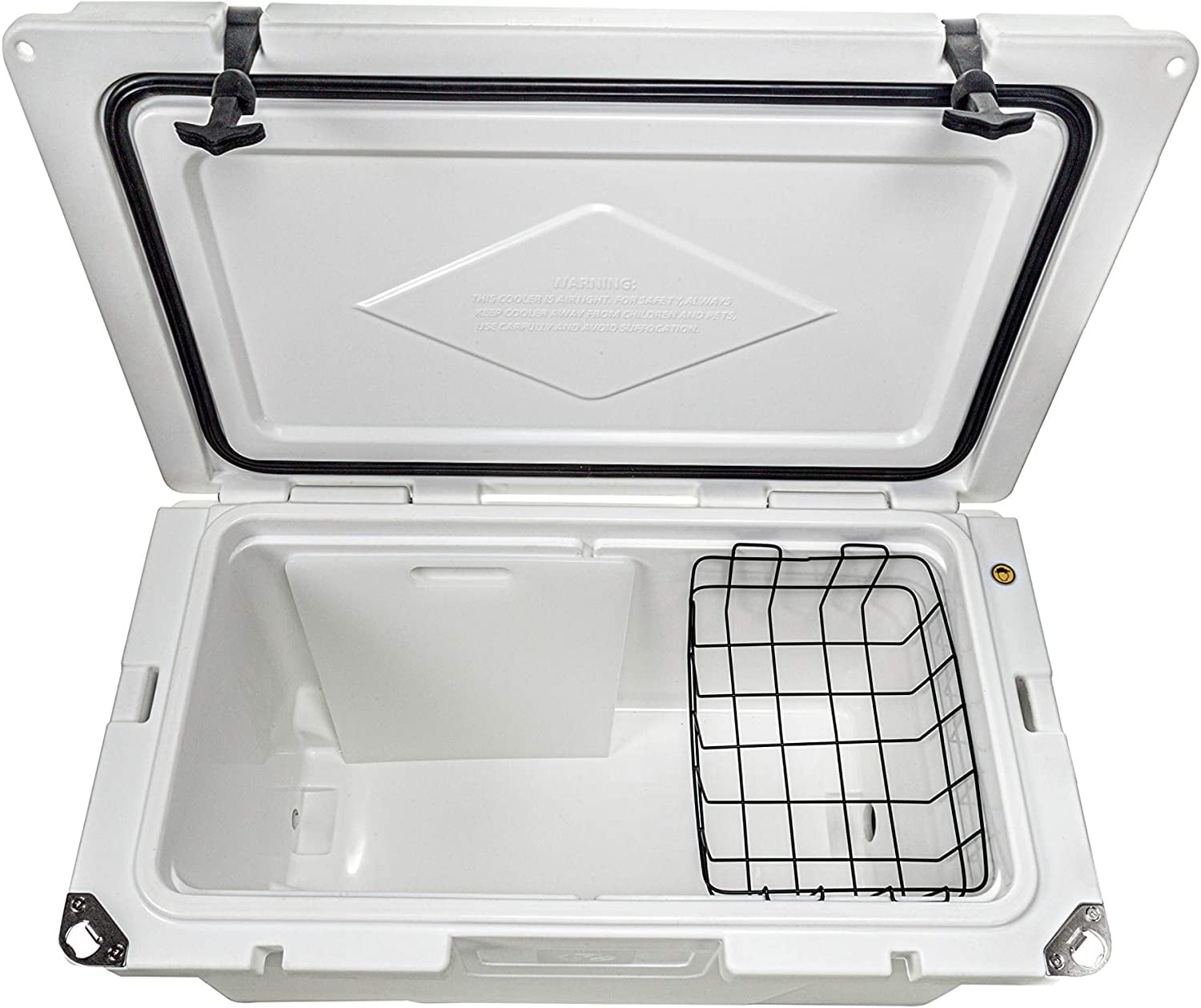 Yachter’s Choice 50 Qt Hard-Sided Cooler with Basket, White Lightweight and easy to carry Rapid drain plug for quick emptying Heavy-duty rubber latches for secure closure Freezer-style lid gasket to keep contents cold Built-in bottle opener for convenience Non-slip feet for stability on various surfaces Basket for dry food storage (50007, 50008 and 50009 models only) Divider doubles as a cutting board (50007, 50008 and 50009 models only)