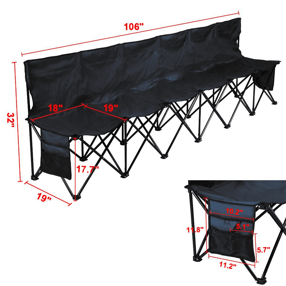 The wonderful 6 seat foldable bench is made of premium iron pipe with diameter of 16mm. Each seat holds up to 200 lbs, making the bench suitable for both youngsters and adults.The Sports Bench features sturdy construction, strong steel frame, durable 600D oxford double layer fabric and comfortable high back rest. The folding chair comes with its own bag for easy transportation and storage.Comes with a carry bag that makes it easy to carry and transport.