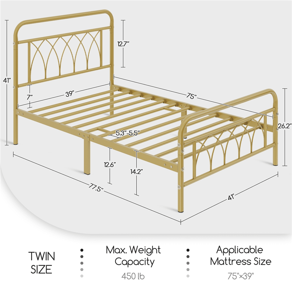 Yaheetech Metal Platform Bed with Headboard and Footboard, Twin Size, Antique Gold: Color: Antique Gold Material: Steel Overall dimension: 77.5’’ L × 41’’ W × 41’’ H Applicable mattress size: 75 x 39” (L x W) Max. weight capacity: 450 lb Slat spacing: 5.3-5.5” Ground clearance: 12.6’’ Vertical clearance from bottom of headboard to slats: 5.7” Net weight (assembled product weight): 39.2 lb Gross weight (product in the box): 44.8 lb