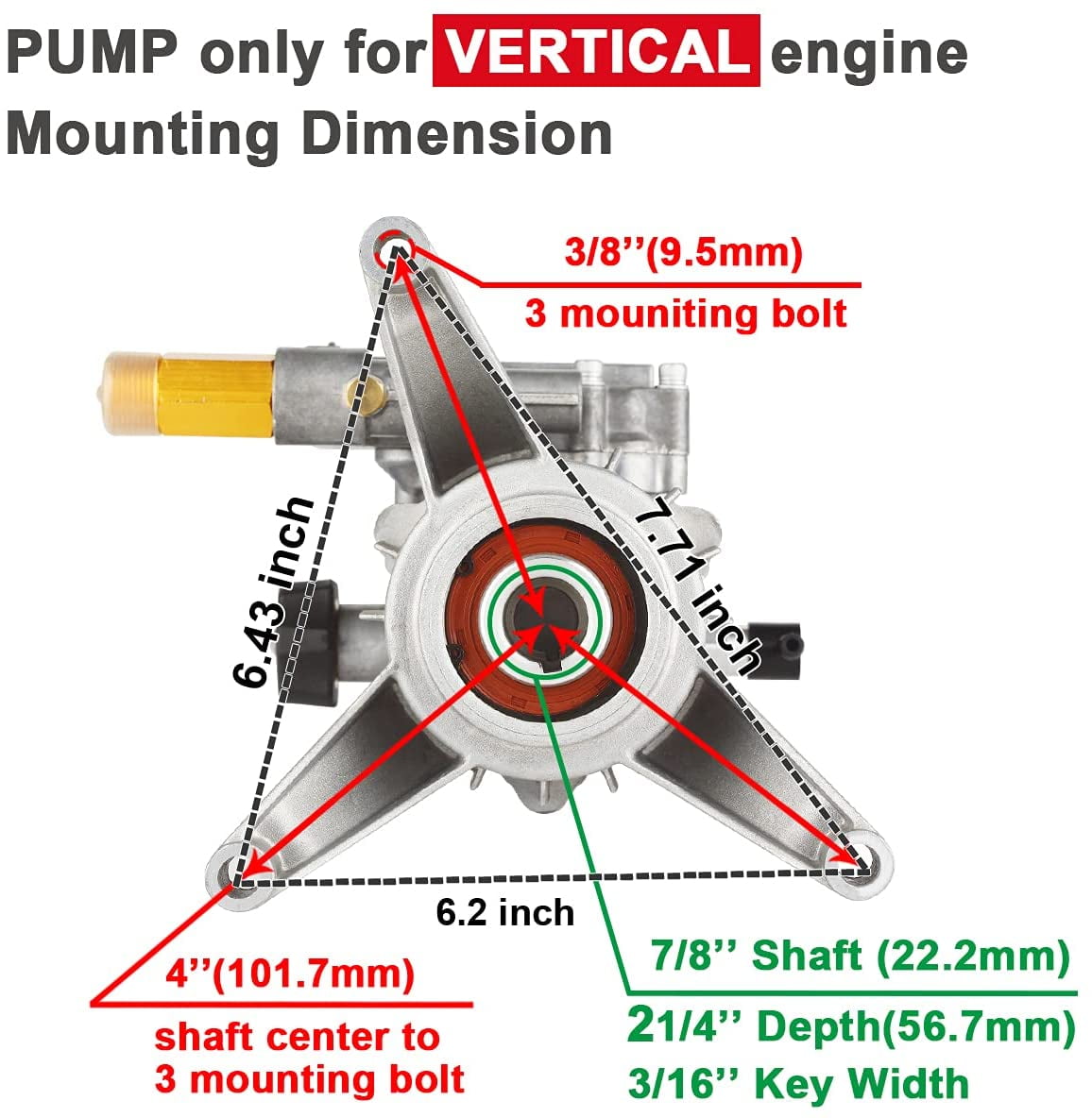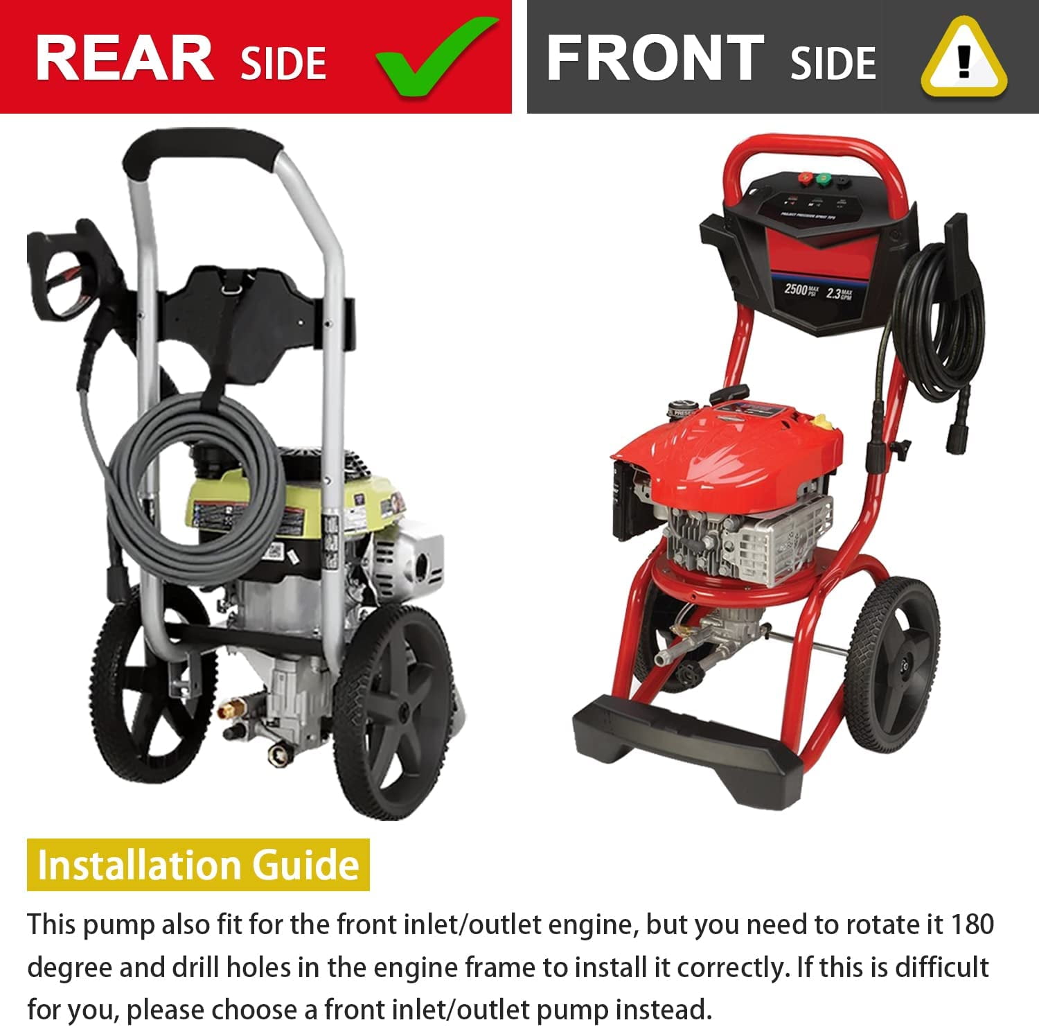 ????Reborn Your Power Washer YAMATIC Vertical Pressure Washer Pump 7/8″ Shaft MAX 3000 PSI / 2.5 GPM / @3400 RPM, Save money by replacing your pump instead of buying a new pressure washer. Top performance at 2800-3000 PSI and replacement for most Rear Outlet 180-196cc at 6.5-7hp engine RYOBI, Honda, Briggs and Stratton, Subaru, PowerStroke, Craftsman, Simpson, Homelite, and Many other brands. ????Extended Durability Pressure Washer Pump High-performance double seal system prevents leakage, upgraded technical surfacing piston and bearing, get 120 hrs running time, longer than OEM power washer pump. And the thermal relief valve (TRV) protects the pump from overheating while in bypass mode. ????Maintenance-Free Pressure Washer Pump This pump features a maintenance-free crankcase so you never have to change the gasoline. This easy-to-install kit is great for power washers that can support 3000 PSI at 2.5 GPM to wash walls, fences, sidewalks, vehicles, and more. ⚠ This pump also fit the front inlet/outlet engine, but you need to rotate the pump 180 degree and drill holes in the frame to install the pump. If this is difficult for you, please choose a front inlet/outlet pump directly. ????Easy Start Pressure Washer Pump Built-in for simple & quick cold starts to make the startup a breeze, no need to release pressure before starting engine. Each kit includes a siphon tube with filter, mounting bolts, shaft key, and instruction booklet to get your machine back in action as quickly as possible, Set up in 5-10 minutes! ????COMPATIBILITY – Replacement for►Homelite: 308653052, 308653006, 308653093, 308653078, 308653008, 308653036, 308653035, 308653026, 308653058. ►Ryobi: RY802900, RY802800, RY802723, RY8C2700, RY802700A. ►PowerStroke: PS80946, PS80931. ►Husky: HU80709, HU80911, HU80709A, HU80911A. ►Craftsman: 580.752960, 580.752052, 580.752191, 580.752880. ►Briggs & Stratton: 311553gs, 020441-0, 020442-0. ►Simpson: ms60773, msv3024. Package Includes: 1 x Pump 1 x Chemical injector hose 3 x Flange bolts 2 x Keys 1 x User manual