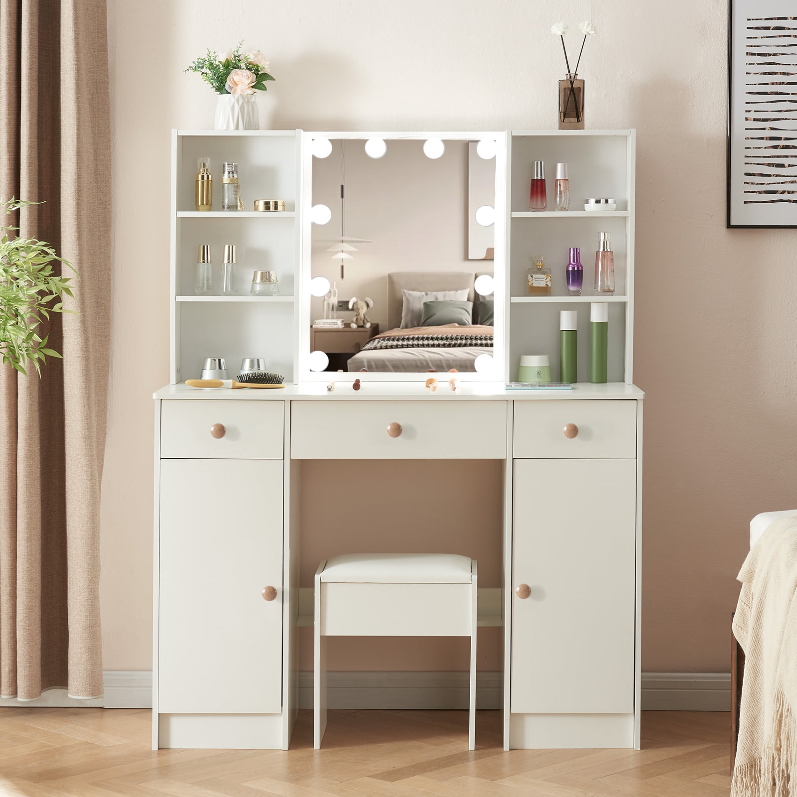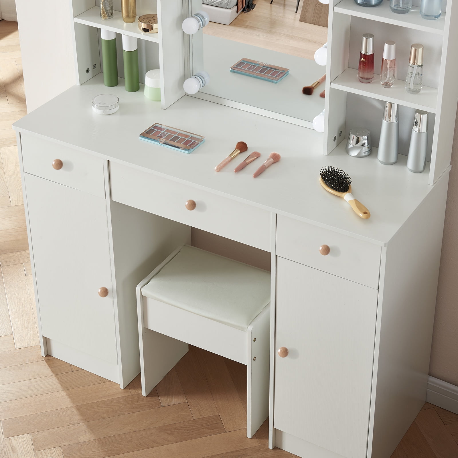 Yamissi Lighted Makeup Vanity Table w/ Mirror and Stool, Modern Makeup Dressing Table, Vanity Desk Set with 3 Drawers and 6 Shelves for Bedroom, White