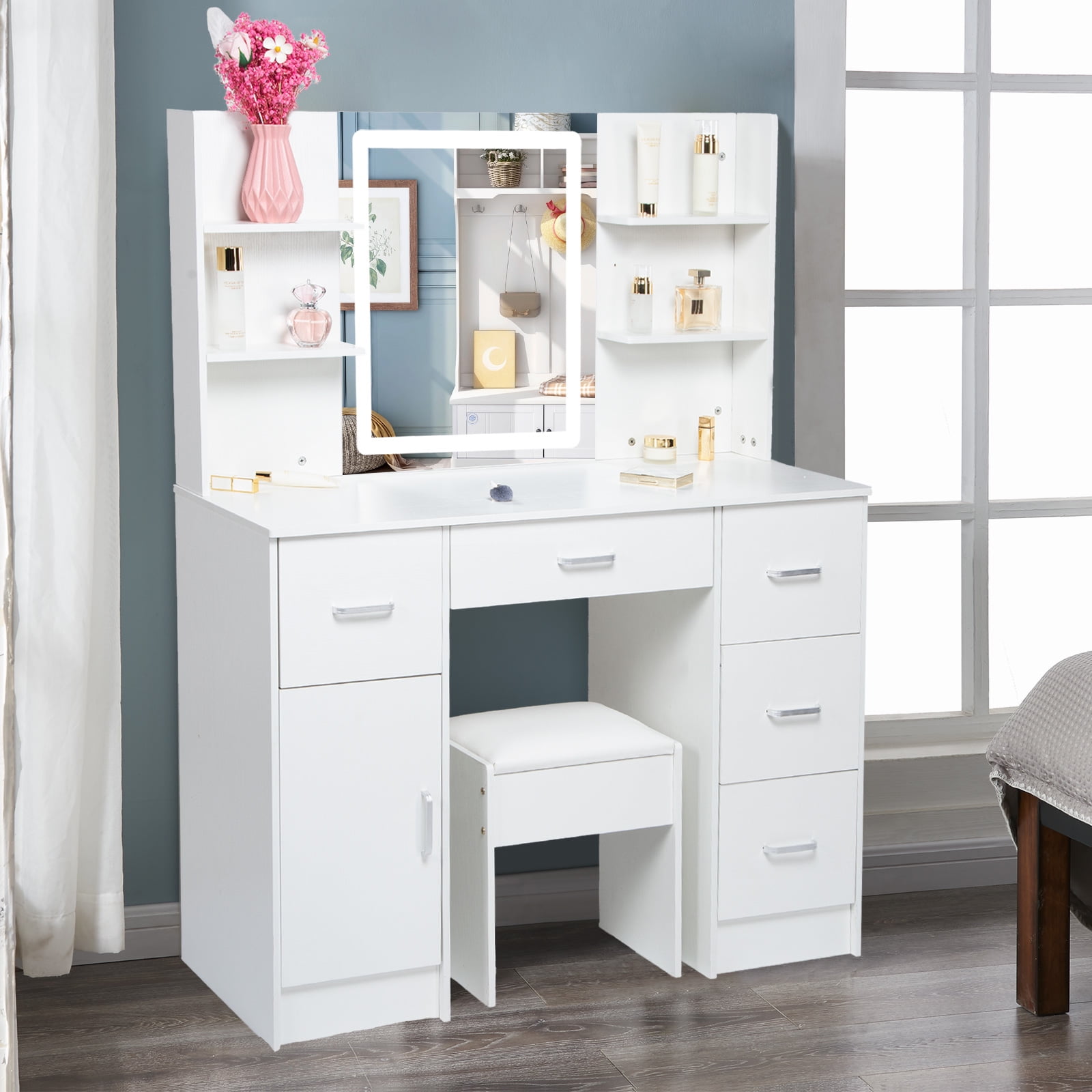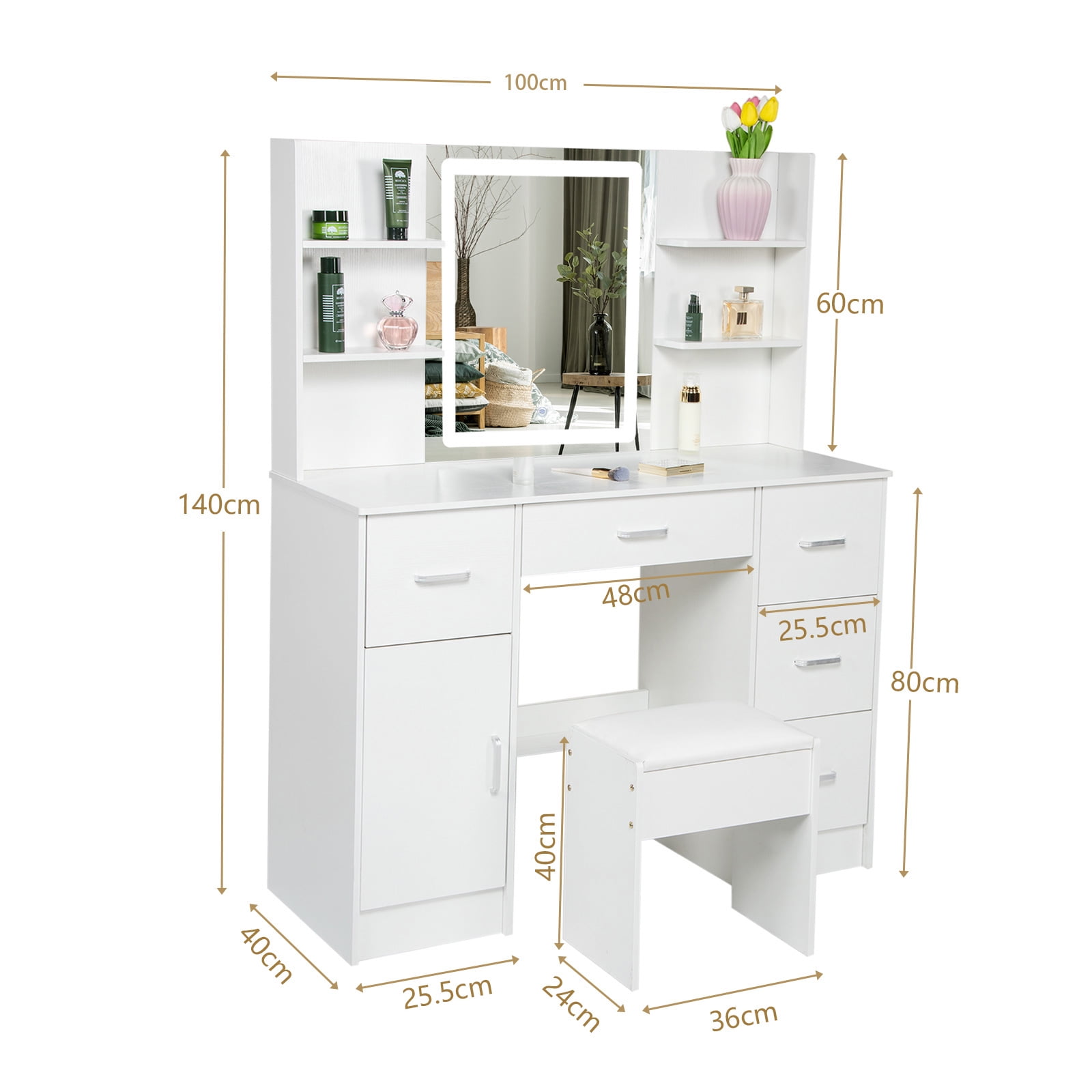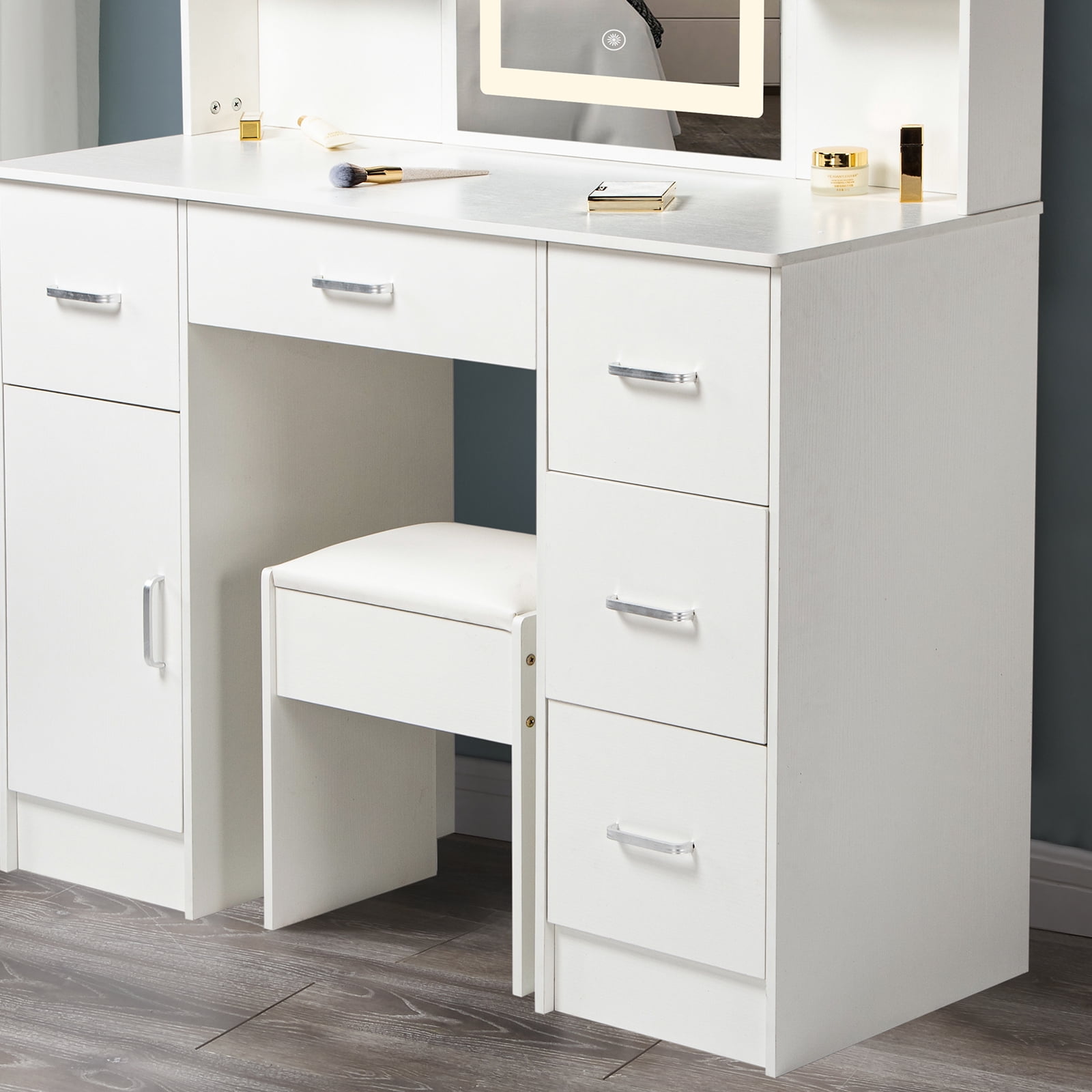 Stylish and Functional: This makeup vanity set combines modern design with practicality, providing a stylish and functional addition to any space Ample Storage Space: The Yamissi vanity set features a spacious vanity desk and multiple drawers, offering plenty of room to organize your makeup, accessories, and beauty essentials Illuminated Mirror: Equipped with built-in LED lights, the vanity mirror provides optimal lighting for flawless makeup application, ensuring you always look your best Comfortable Seating: The included vanity stool offers a comfortable and cozy place to sit while getting ready, allowing you to focus on perfecting your makeup and hair Versatile Usage: Whether it’s for adults or kids, this versatile vanity set can be used as a dressing table, makeup station, or study desk, catering to various needs and preferences Elegant White Finish: The white vanity set exudes elegance and sophistication, adding a touch of glamour to your bedroom, bathroom, or dressing area Warm Tips: Please contact us first if you have any issues or concerns after your purchase. We are here to help and find a solution for you, rather than immediately requesting a return. Your satisfaction is our priority, and we are committed to resolving any problems promptly.
