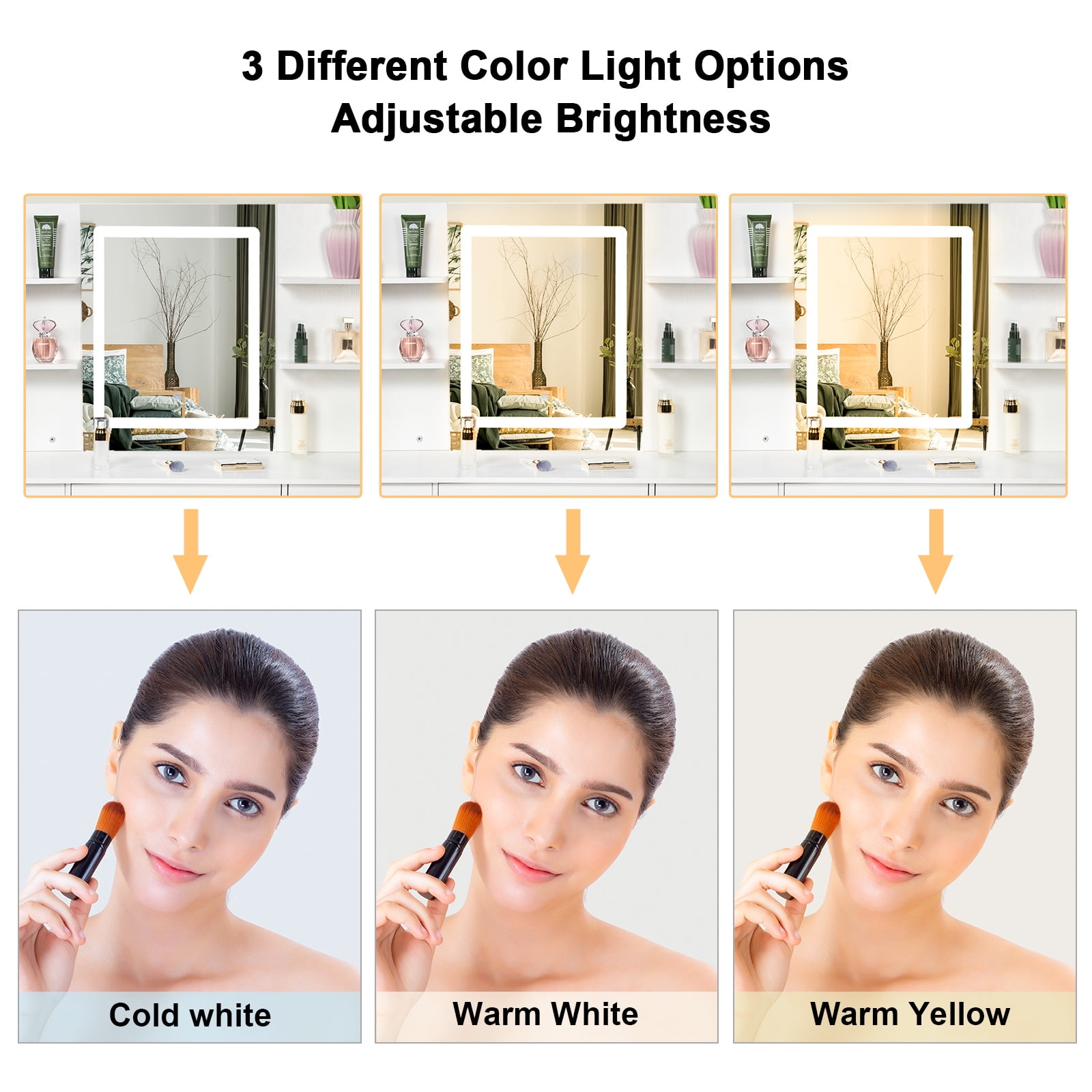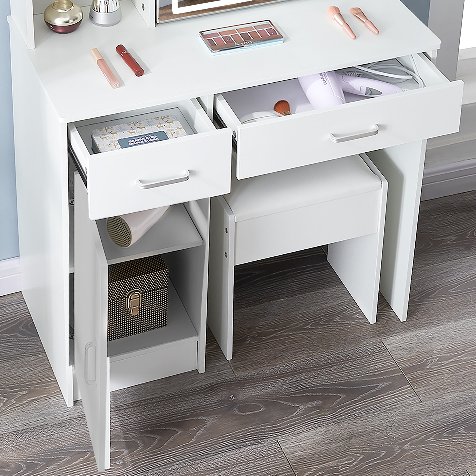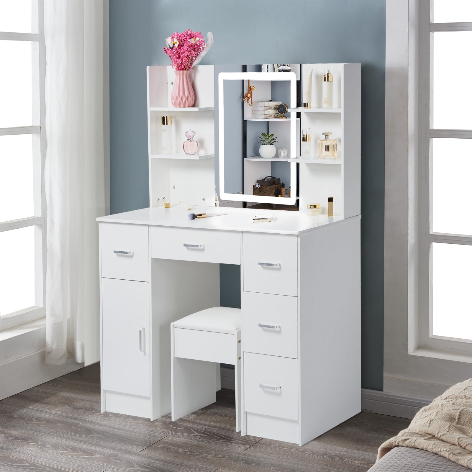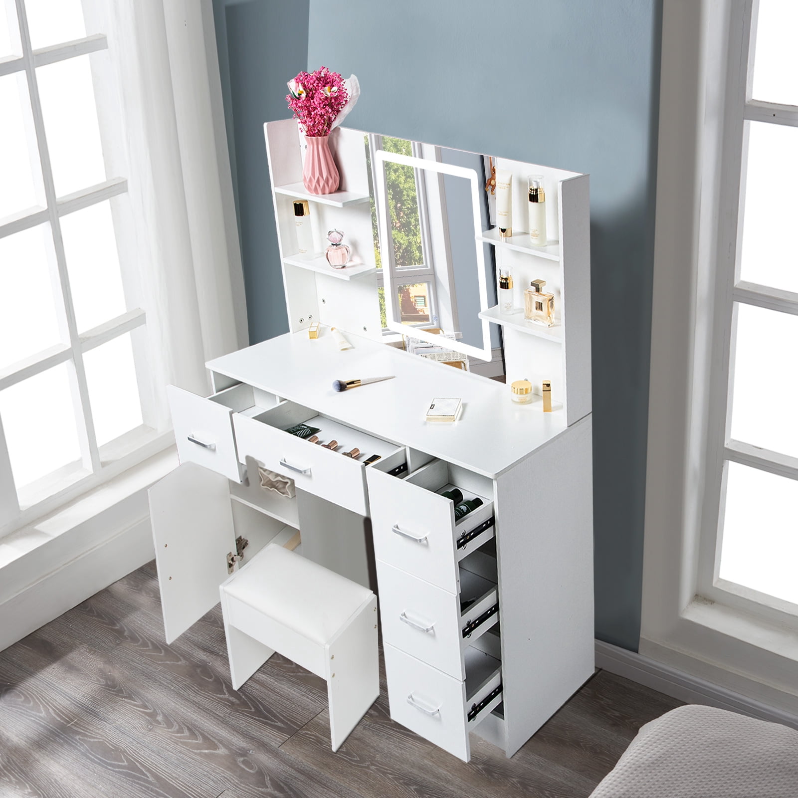 Stylish and Functional: This makeup vanity set combines modern design with practicality, providing a stylish and functional addition to any space Ample Storage Space: The Yamissi vanity set features a spacious vanity desk and multiple drawers, offering plenty of room to organize your makeup, accessories, and beauty essentials Illuminated Mirror: Equipped with built-in LED lights, the vanity mirror provides optimal lighting for flawless makeup application, ensuring you always look your best Comfortable Seating: The included vanity stool offers a comfortable and cozy place to sit while getting ready, allowing you to focus on perfecting your makeup and hair Versatile Usage: Whether it’s for adults or kids, this versatile vanity set can be used as a dressing table, makeup station, or study desk, catering to various needs and preferences Elegant White Finish: The white vanity set exudes elegance and sophistication, adding a touch of glamour to your bedroom, bathroom, or dressing area Warm Tips: Please contact us first if you have any issues or concerns after your purchase. We are here to help and find a solution for you, rather than immediately requesting a return. Your satisfaction is our priority, and we are committed to resolving any problems promptly.