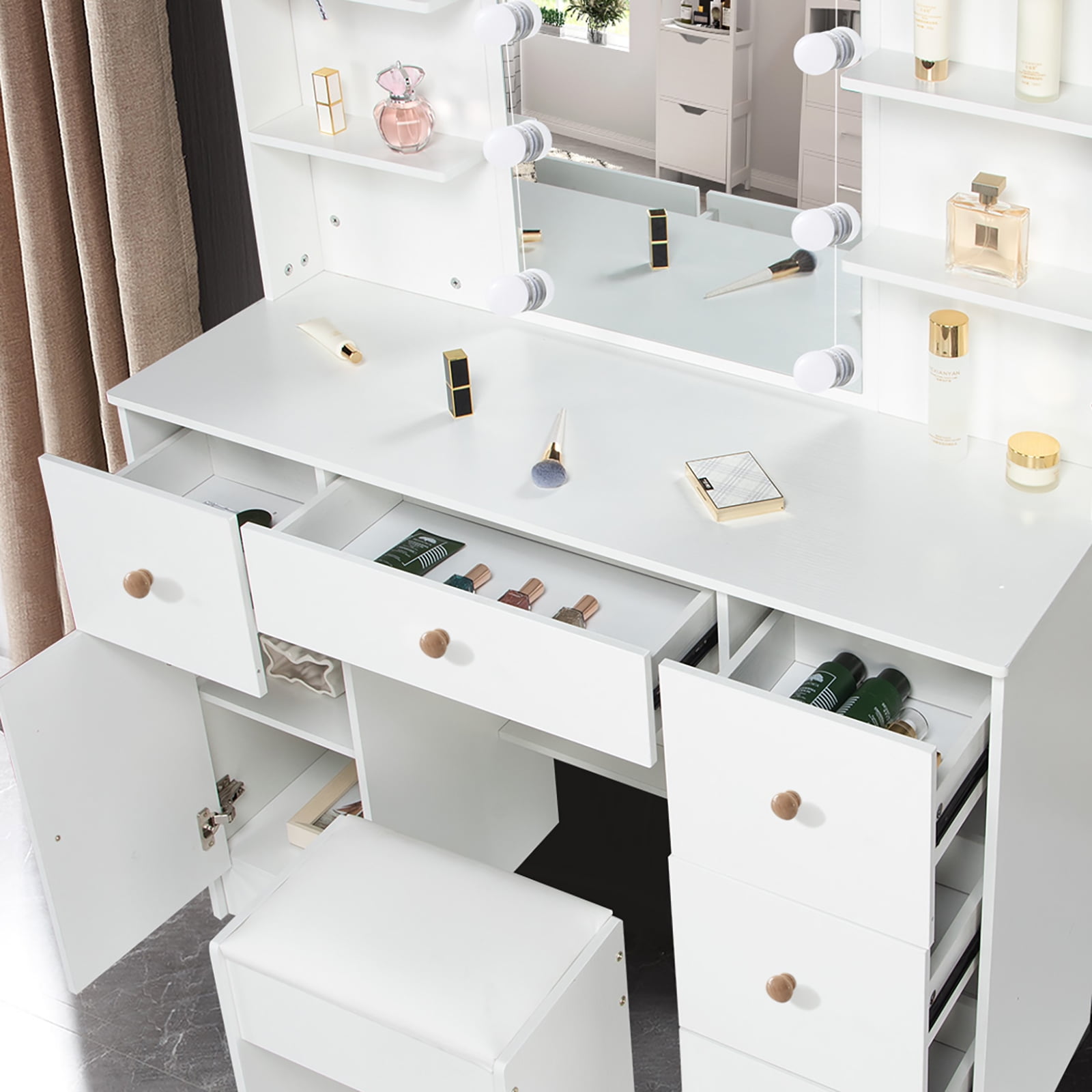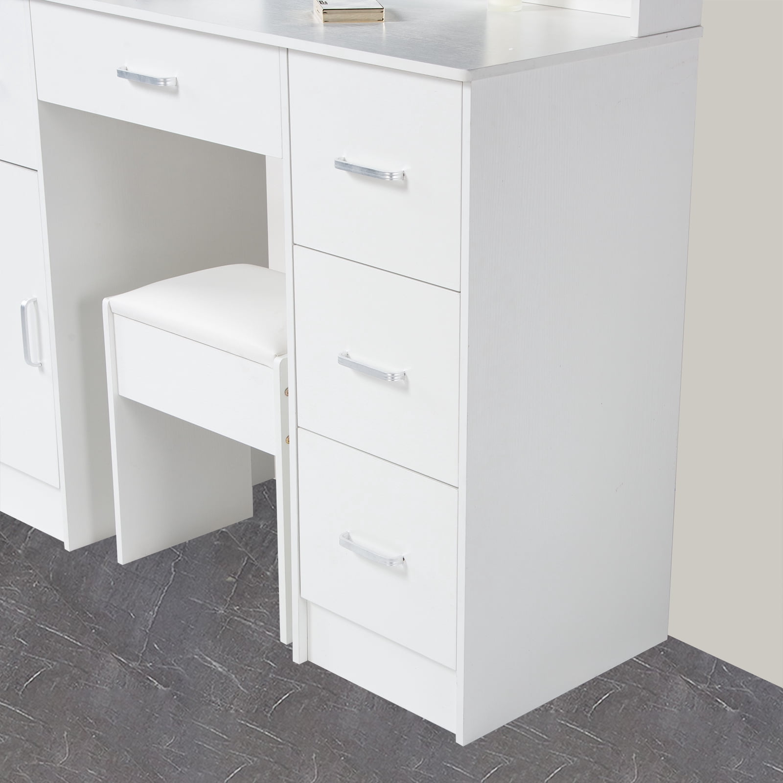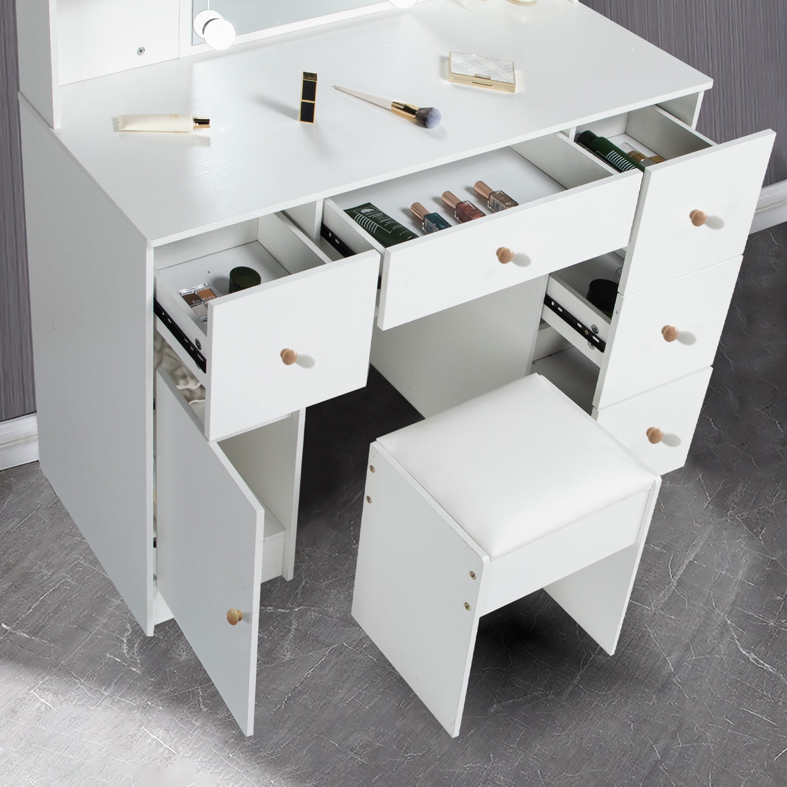 This vanity desk with 5 drawers, 6 shelves and a storage cabinet, enough storage space. Each drawer is equipped with slide rails, and it won’t fall when using. Dresser with mirror, reasonable design and layout, small but perfect. 10 Dimmable LED bulbs with brightness adjustments and 3 color temperature modes satiate different makeup needs. Hollywood light bulbs add a sense of glamor and style. Quality MDF material ensure the vanity table durable and sturdy, and easy to clean. All accessories have a detailed manual included, so it is easy for you to assemble. Package Included: 1 x White Vanity, 1 x Stool, 1 x 10Pcs LED Light Bulbs, 1 x Instructions