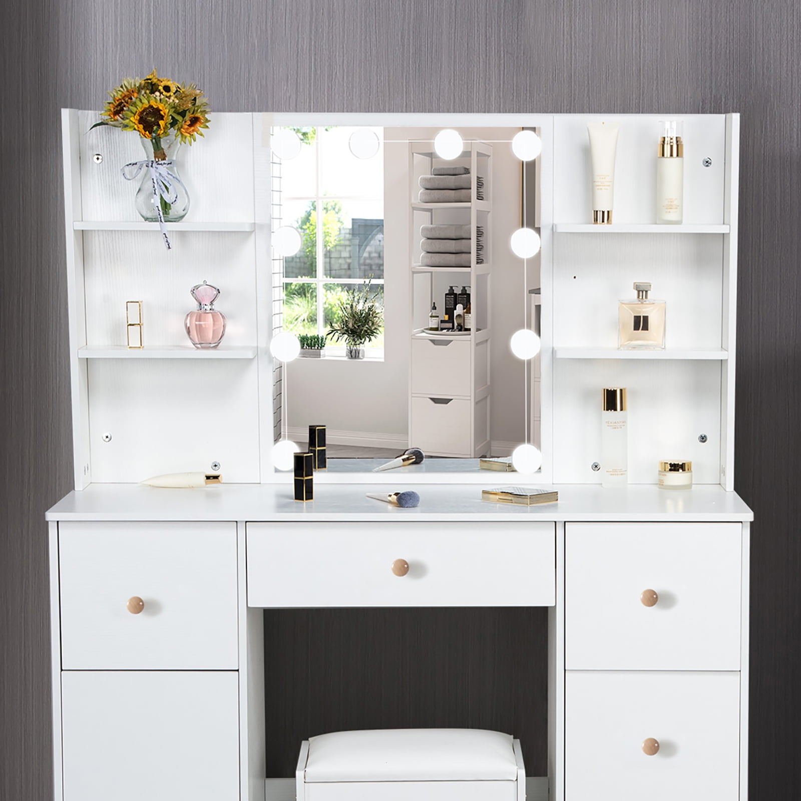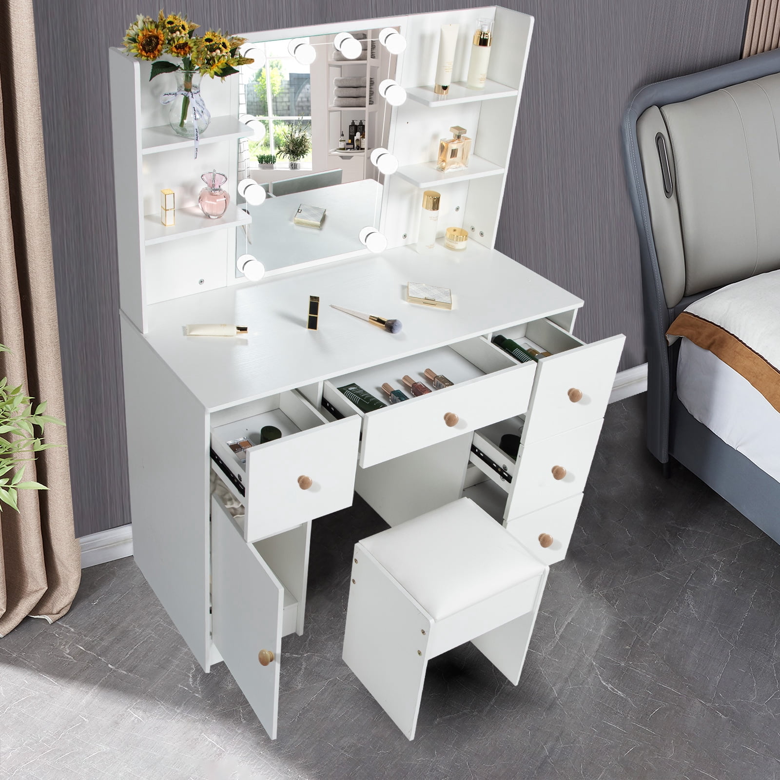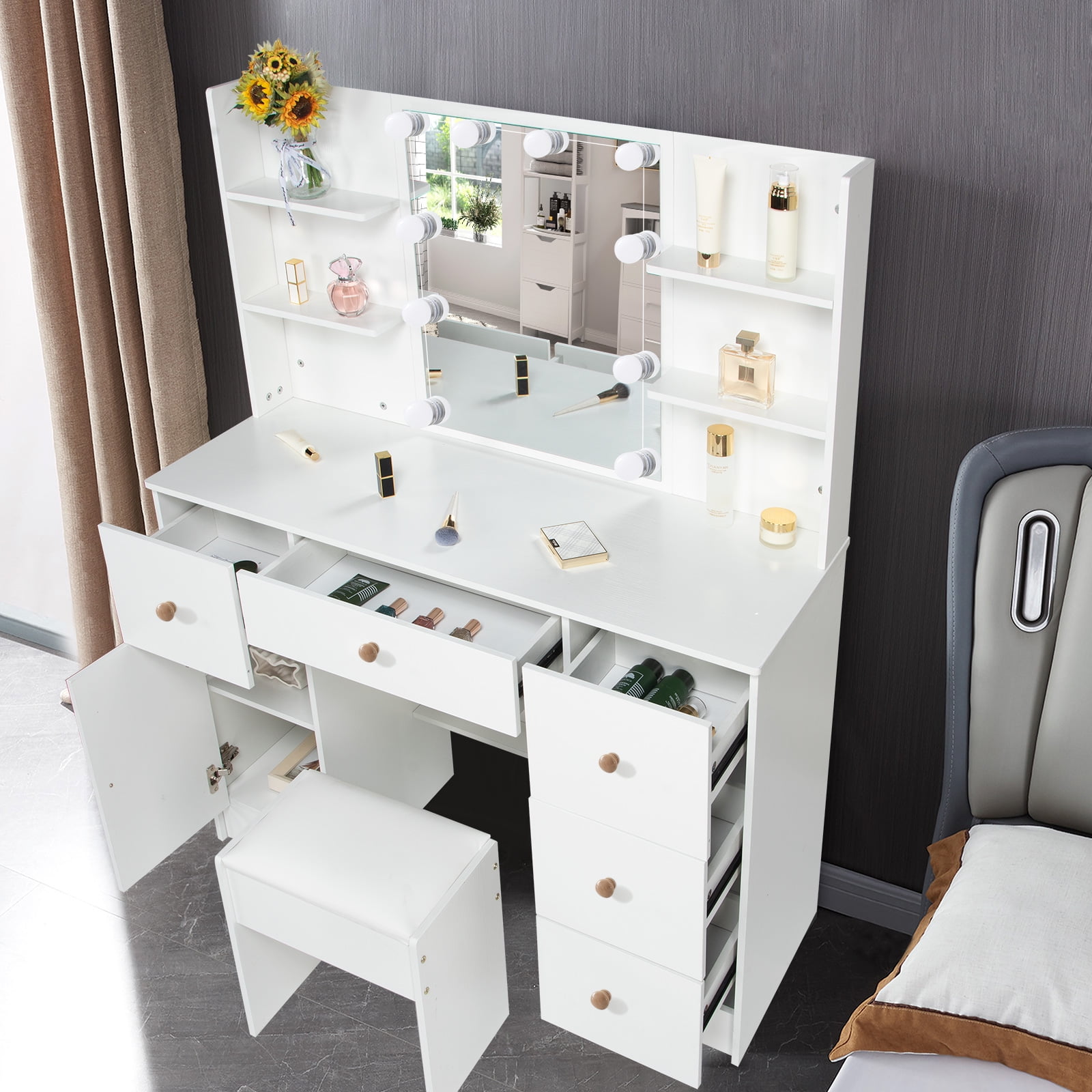 This vanity desk with 5 drawers, 6 shelves and a storage cabinet, enough storage space. Each drawer is equipped with slide rails, and it won’t fall when using. Dresser with mirror, reasonable design and layout, small but perfect. 10 Dimmable LED bulbs with brightness adjustments and 3 color temperature modes satiate different makeup needs. Hollywood light bulbs add a sense of glamor and style. Quality MDF material ensure the vanity table durable and sturdy, and easy to clean. All accessories have a detailed manual included, so it is easy for you to assemble. Package Included: 1 x White Vanity, 1 x Stool, 1 x 10Pcs LED Light Bulbs, 1 x Instructions