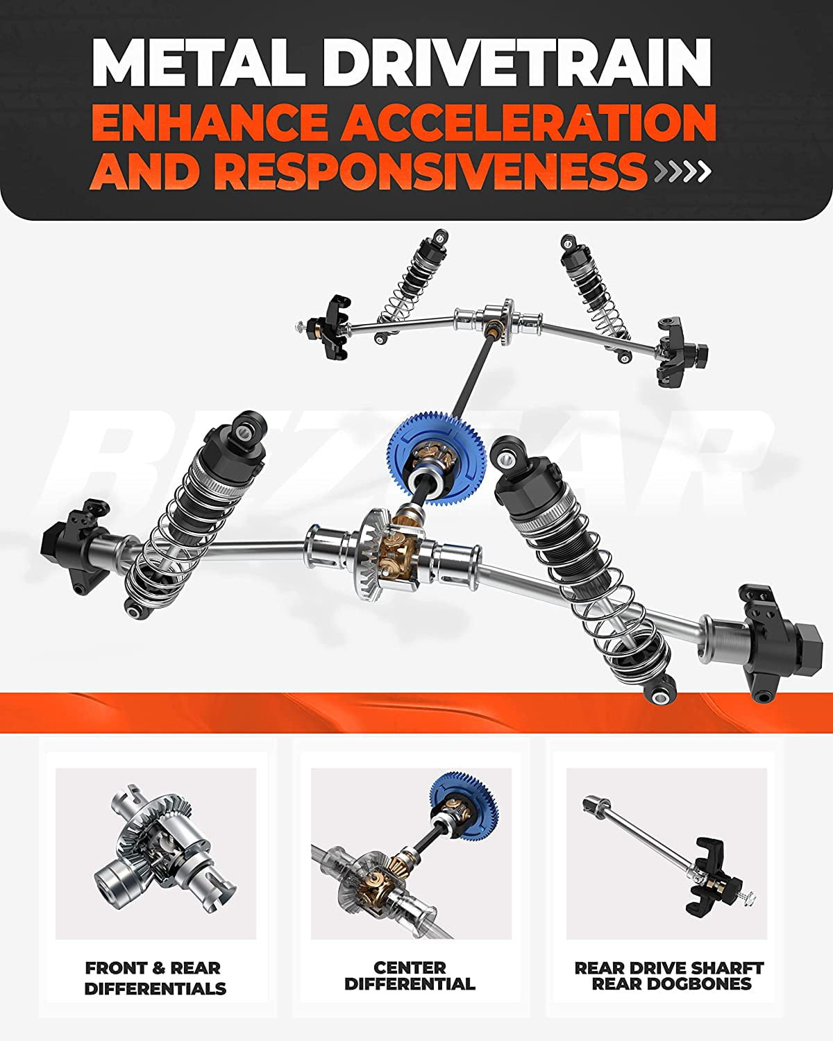 Upgraded to a full-metal drivetrain, the powder metallurgy technology makes this RC crawler more robust and durable in fierce racing. HM101 RC car comes with three differentials including the front & rear and extra center differentials. Equipped with a powerful 550 brushed motor, this 4WD RC truck is capable of producing a larger horsepower. The speed limit is up to 26+ MPH.An extra green car shell is also included for your replacement.