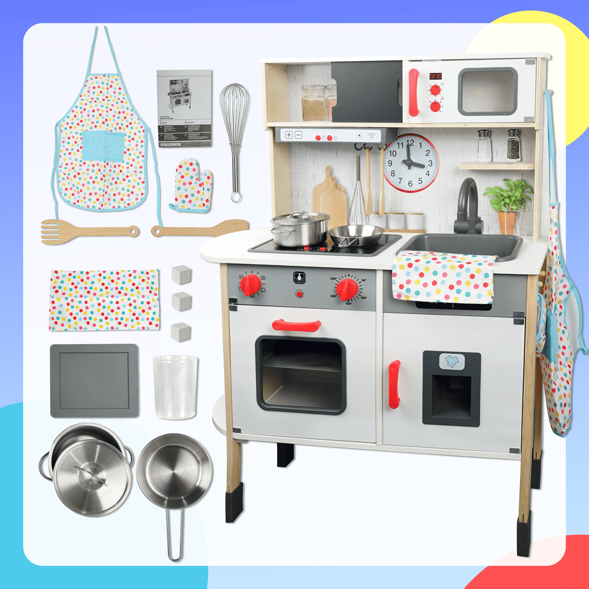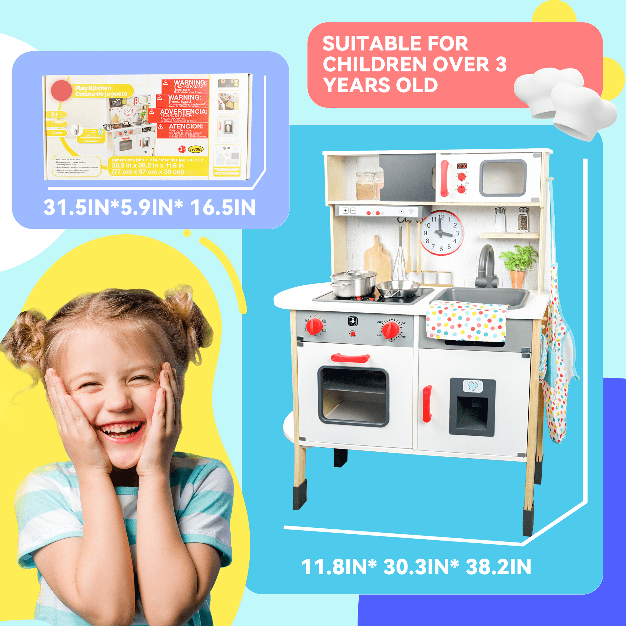 Vivid Play Kitchen – The lights above the stove can be turned on, the oven lid is openable, and the ice cubes will drop down when rotating the knob. Abundant Kids Kitchen Accessories – The accessories came with the kids play kitchen are frying pan, pot with universal lid, fork, and apron. Screen-free Enlightenment Toy – The play food set for kids kitchen will exercise kids hands-on ability when assmeble the kids toys. Please refer to the user manual and use the electric screwdriver to minimize your assembly time. Durable to Use – The wood Kitchen Play Set for childs kids 3-8 is made of natural solid wood on a smooth surface. Safe for kids to play with.