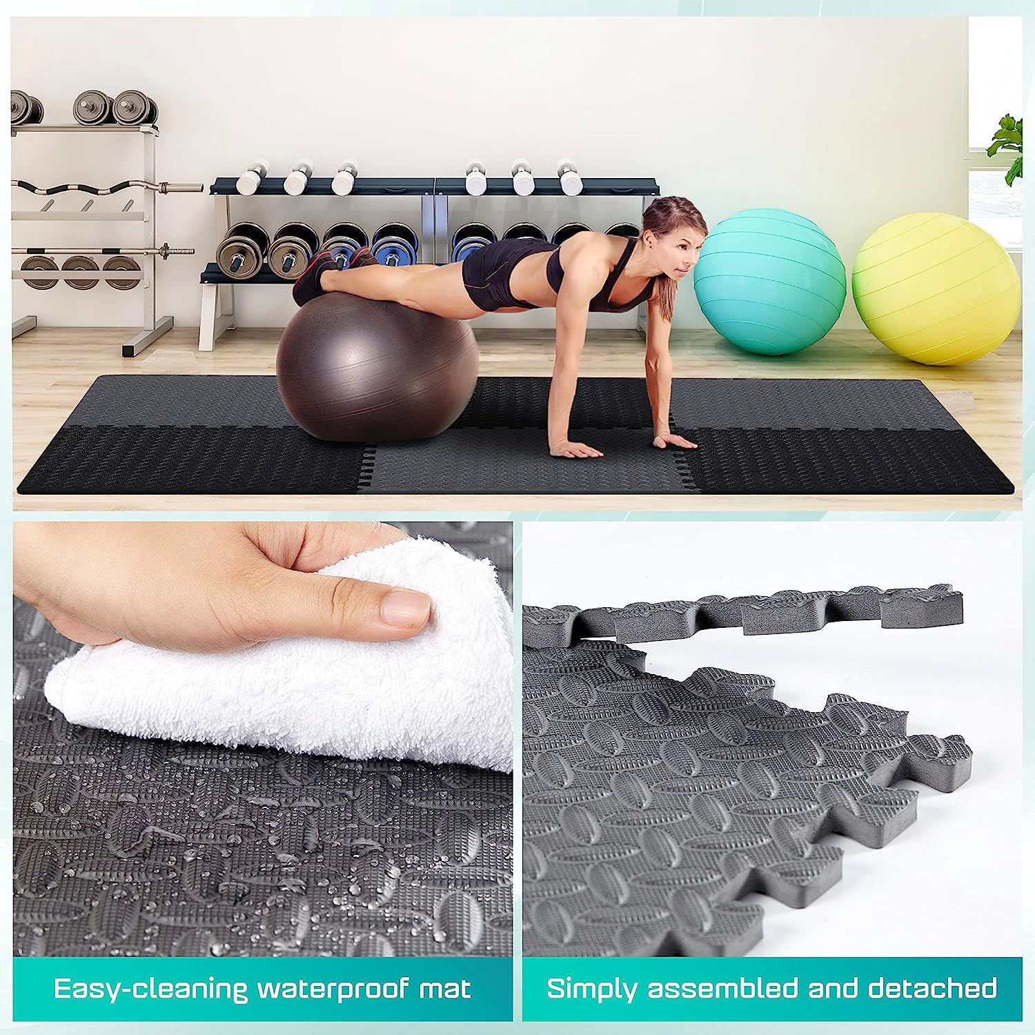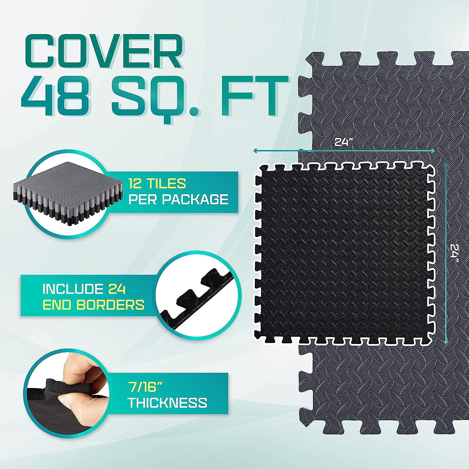 12 TILES COVER 48 SQ. FT: Include 6 Black tiles and 6 Gray tiles. Each tile measures 24”L x 24”W x 7/16”thick – Thick from the highest point of the texture DURABLE & NON SLIP: The non-skid textured & shock-absorbing surface provides a soft feeling when exercising on, best for comfortable workout area – a combination of high-density EVA foam mat & exercise mat for excellent support and cushion EASY 5 MINUTE ASSEMBLY: Lightweight puzzle pieces can be connected and disassembled easily in less than 5 minutes. Great for home gym, fitness gym, garages coverage or play areas PROTECTIVE WORKOUT FLOORING: Give yourself shock-absorbing comfort when doing Yoga, Pilates, or weightlifting Yes4All Interlocking Mats can also be used to create a soft & anti-slip floor while camping or playing EASY TO CLEAN: The water-resistant & noise-reducing design is easy to clean. The moisture-resistant technology & high-quality material make the mat easy to wash with soap & water 12 TILES COVER 48 SQ. FT: Include 12 tiles. Each tile measures 24”L x 24”W x 7/16”thick – Thick from the highest point of the texture DURABLE & NON SLIP: The non-skid textured & shock-absorbing surface provides a soft feeling when exercising on, best for comfortable workout area – a combination of high-density EVA foam mat & exercise mat for excellent support and cushion EASY 5 MINUTE ASSEMBLY: Lightweight puzzle pieces can be connected and disassembled easily in less than 5 minutes. Great for home gym, fitness gym, garages coverage or children’s play areas PROTECTIVE WORKOUT FLOORING: Give yourself shock-absorbing comfort when doing Yoga, Pilates, CrossFit or weightlifting. Yes4All Interlocking Mats can also be used to create a soft & anti-slip floor while camping or playing EASY TO CLEAN: The water-resistant & noise-reducing design is easy to clean. The moisture-resistant technology & high-quality material make the mat easy to wash with soap & water