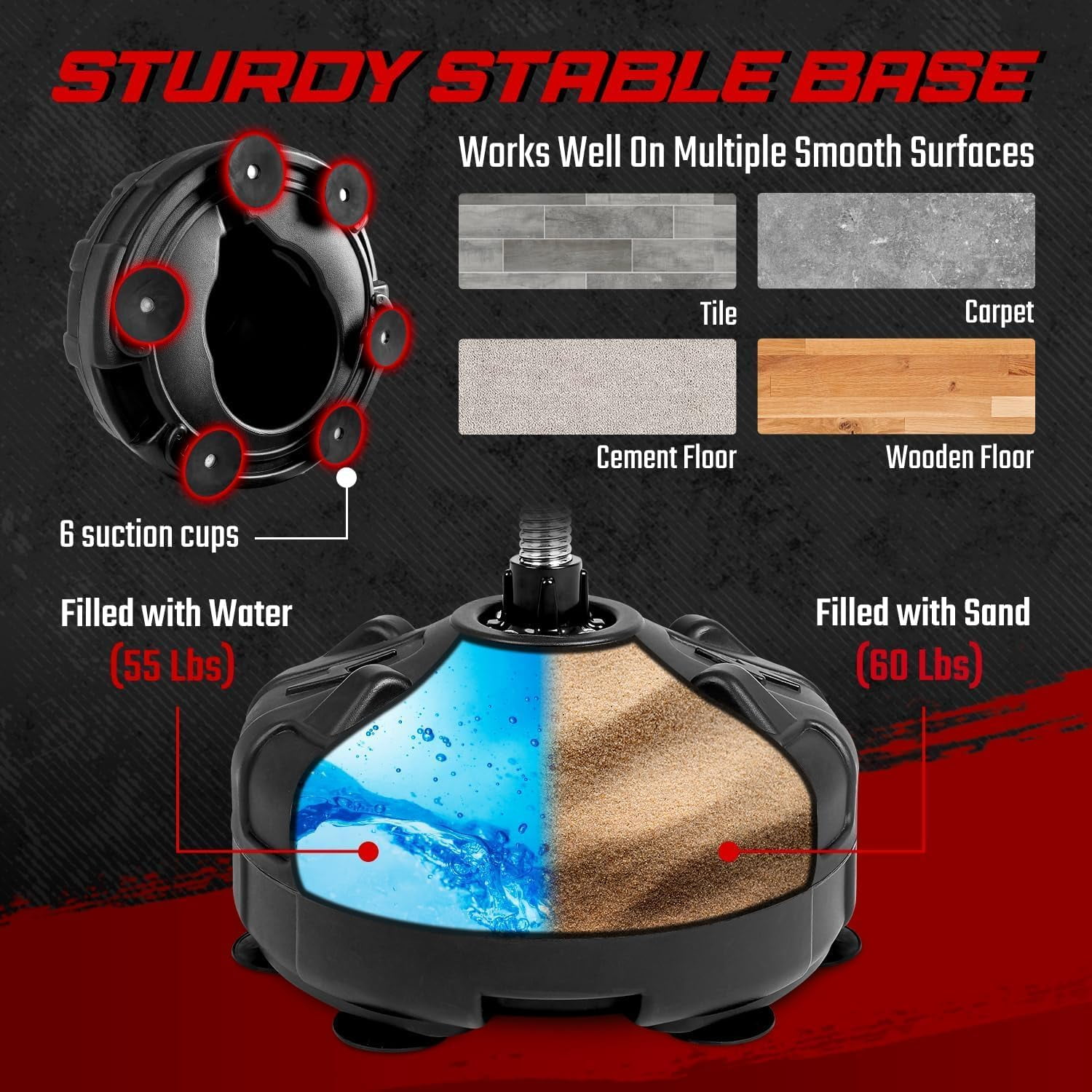 Durable Material: Constructed with high-quality PU foam and a sturdy steel spring collar, this pedestal punching bag withstands tough punches while providing a quick and powerful rebound Adjustable Height for All Ages: Height can be adjusted from 55 inches to 622 inches, making it suitable for both men and women to practice boxing and build physical strength at home Durable and Stable Large Base: Features a 6 suction cup design for stability on various surfaces, including tiled, wooden, cement floors, and carpet The base can be filled with water or sand for maximum stability, supporting up to 55 lbs or 60 lbs respectively Must-Have Item for Home Boxing: Ideal for beginner boxers, this cobra punching bag provides a durable and versatile training tool for enhancing punching and kicking skills Suitable for Stress Relief: Designed for adult training, this boxing reflex bag helps improve speed and accuracy of hand-eye coordination while practicing punches for karate and physical education, effectively reducing stress