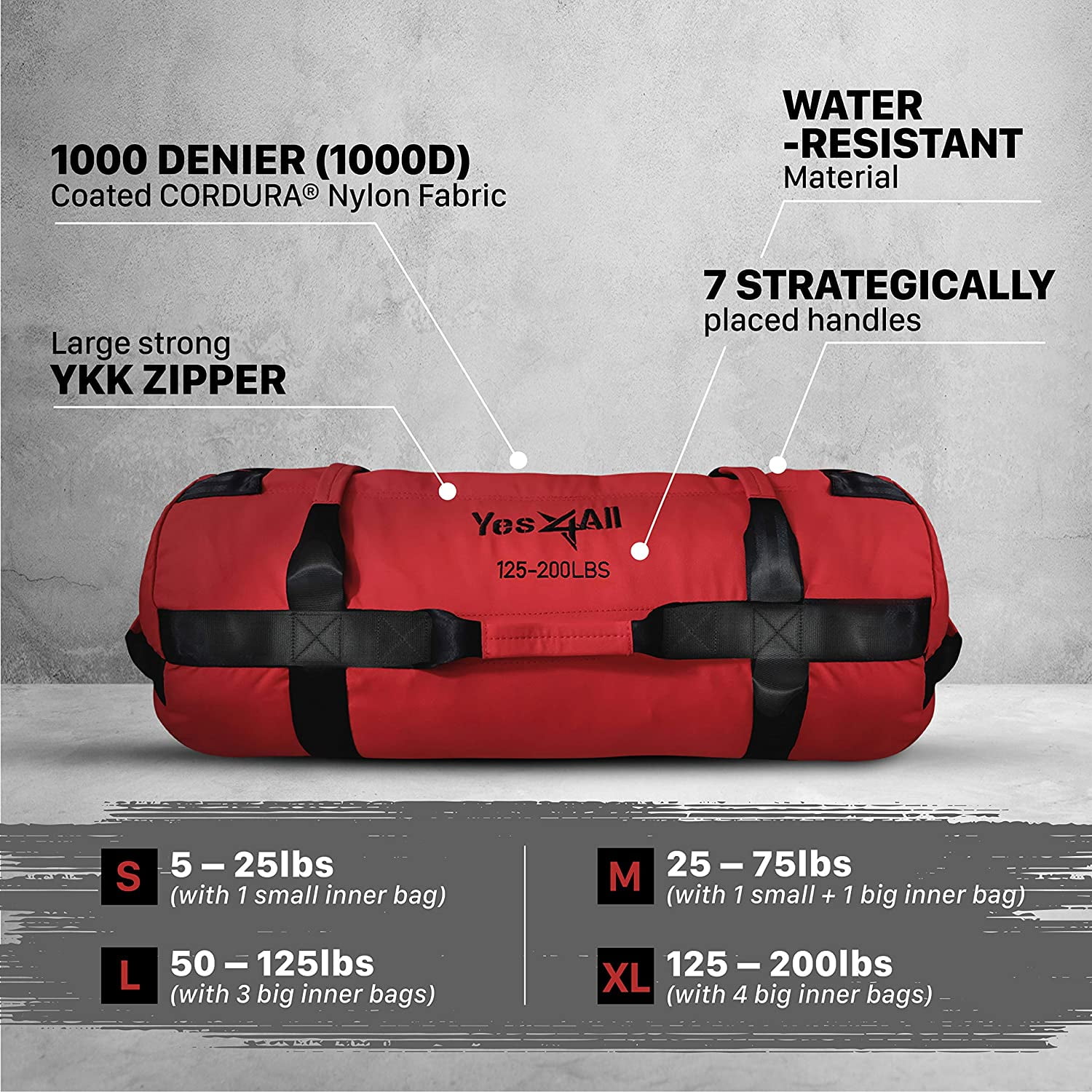 REAP A MULTITUDE OF BODY STRENGTHENING BENEFITS: By having to control the changing center of mass constantly, training with sandbags helps condition & build stability, strength, and performance in other sports. MULTI-FUNCTION TRAINING GEAR: Employ the sandbags to engage your core and target multiple muscle groups in numerous exercises: Lunges, Deadlift, Squat, Burpee, Snatch, Spider, Overhead press, Hammer curl and many more. JUST THE RIGHT SANDBAG: Yes4All Sandbags come in a variety of colors and capacities so you can choose the exact bag for your level of fitness and training goals: S (5-25 lbs), M (25-75 lbs), L (50-125 lbs) & XL (125-200 lbs). THOUGHTFUL & ENHANCED DESIGN: Made of 1000 Denier (1000D) Coated CORDURA Nylon Fabric, strong stitching and zipper closure to ensure durability and performance. Strategically placed handles offer opportunities for various workout moves. FULL PRODUCT SET INCLUDES: S – 1 small inner bag (5-25 lbs), M – 1 small & 1 big inner bag (25-75 lbs), L – 3 big inner bags (50-125 lbs) & XL – 4 big inner bags (125-200 lbs).