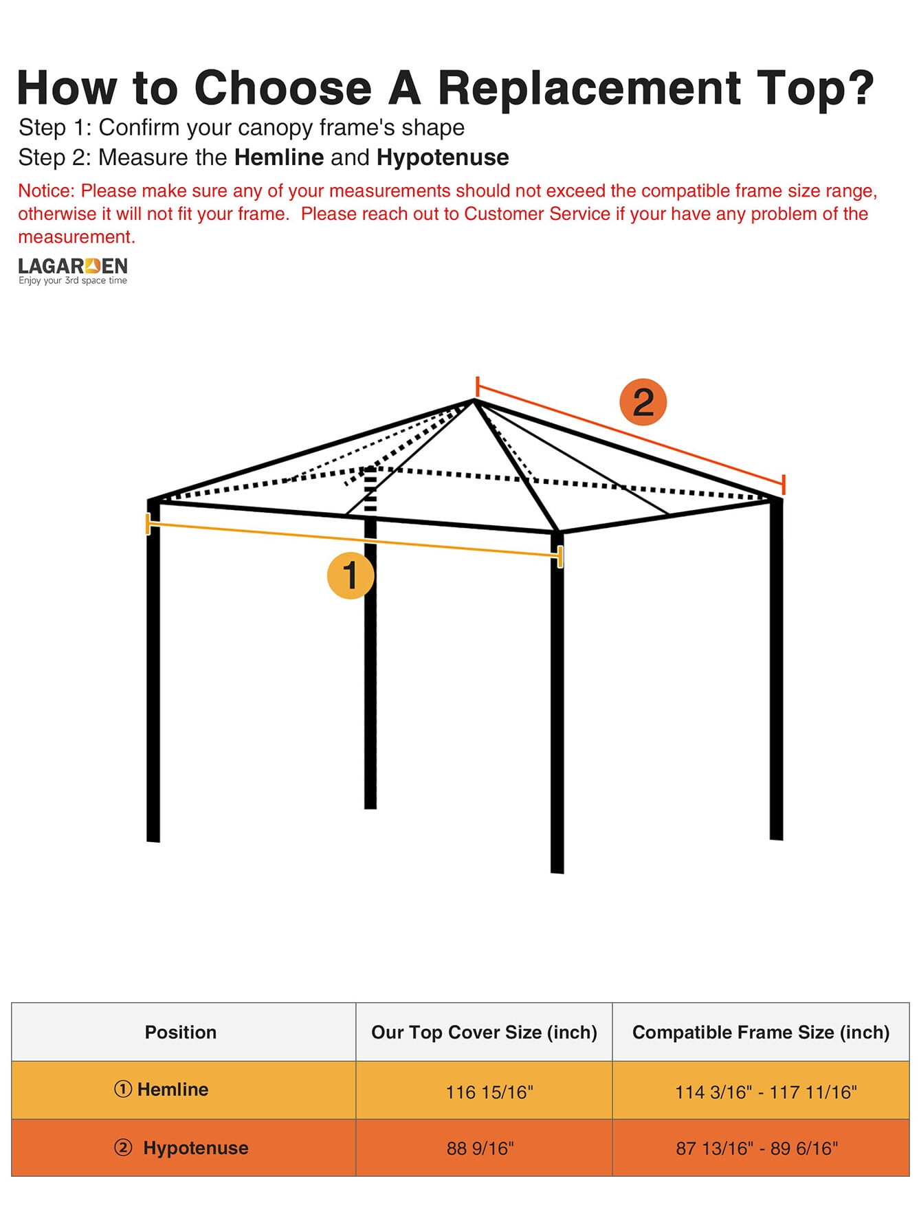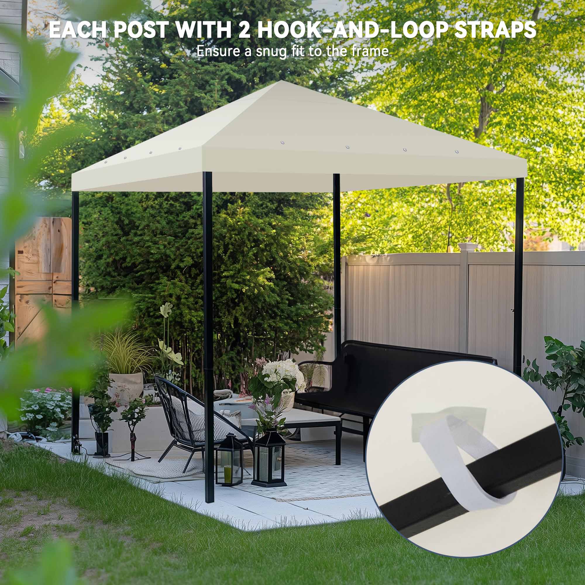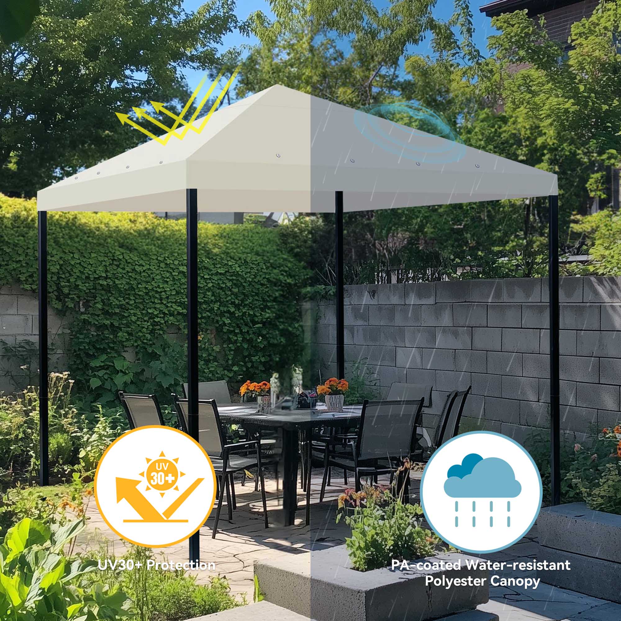 Universal 1-Tier Replacement Canopy Top for 9.7×9.7 ft one-tier gazebo frames, gives you a perfect outdoor shade to enjoy leisure time UV30+ Protection – Made of 200 g/sqm polyester with PA coating & UV30+ protection to block out harmful sunray Tool-free Installation – Hook & loop fasteners for easily fixing canopy onto frame Reinforced Corners & Vent Hole – Reinforced corners for better protection; 16 grommets for ventilation & drainage Measuring Tips – Measure the hemline & hypotenuse of the frame