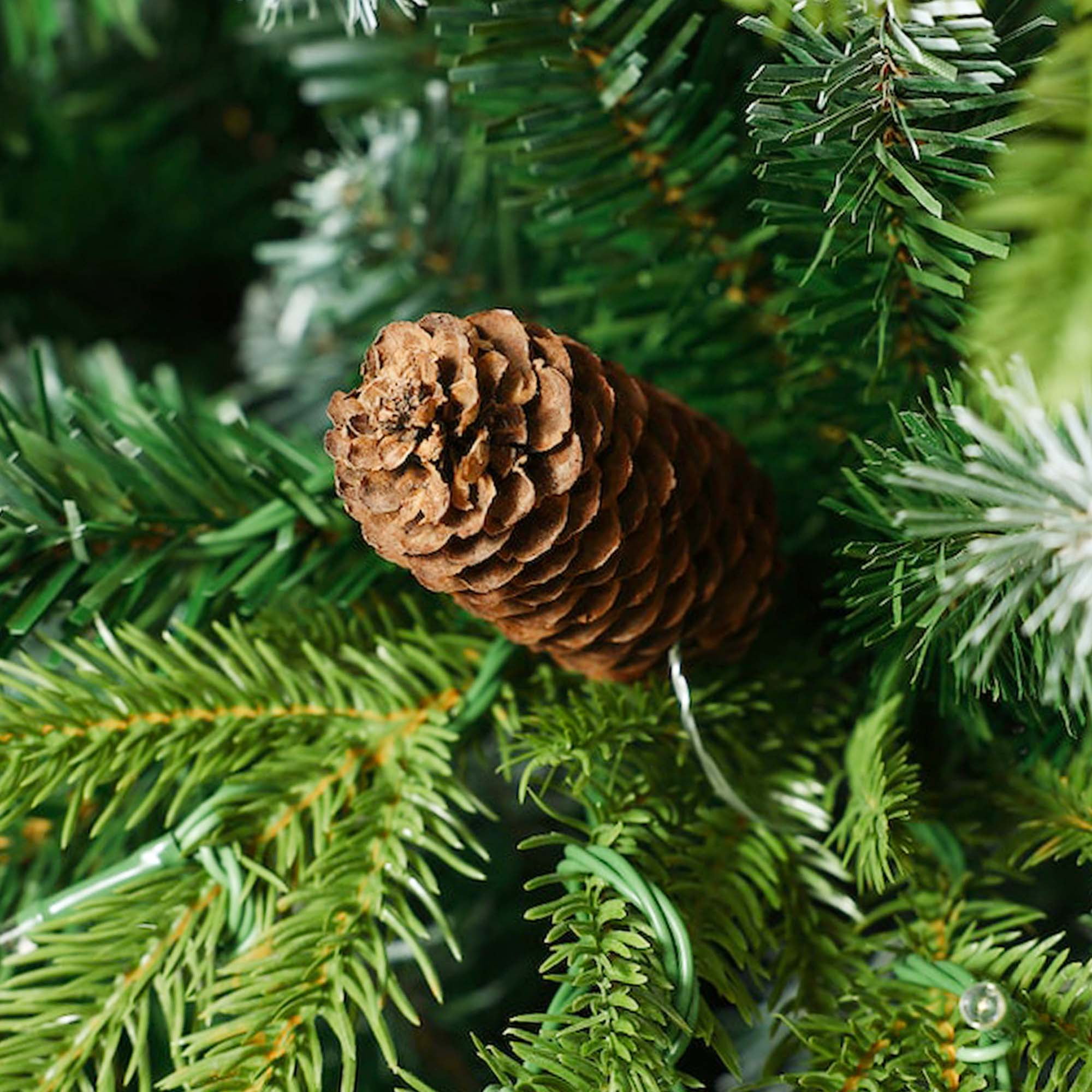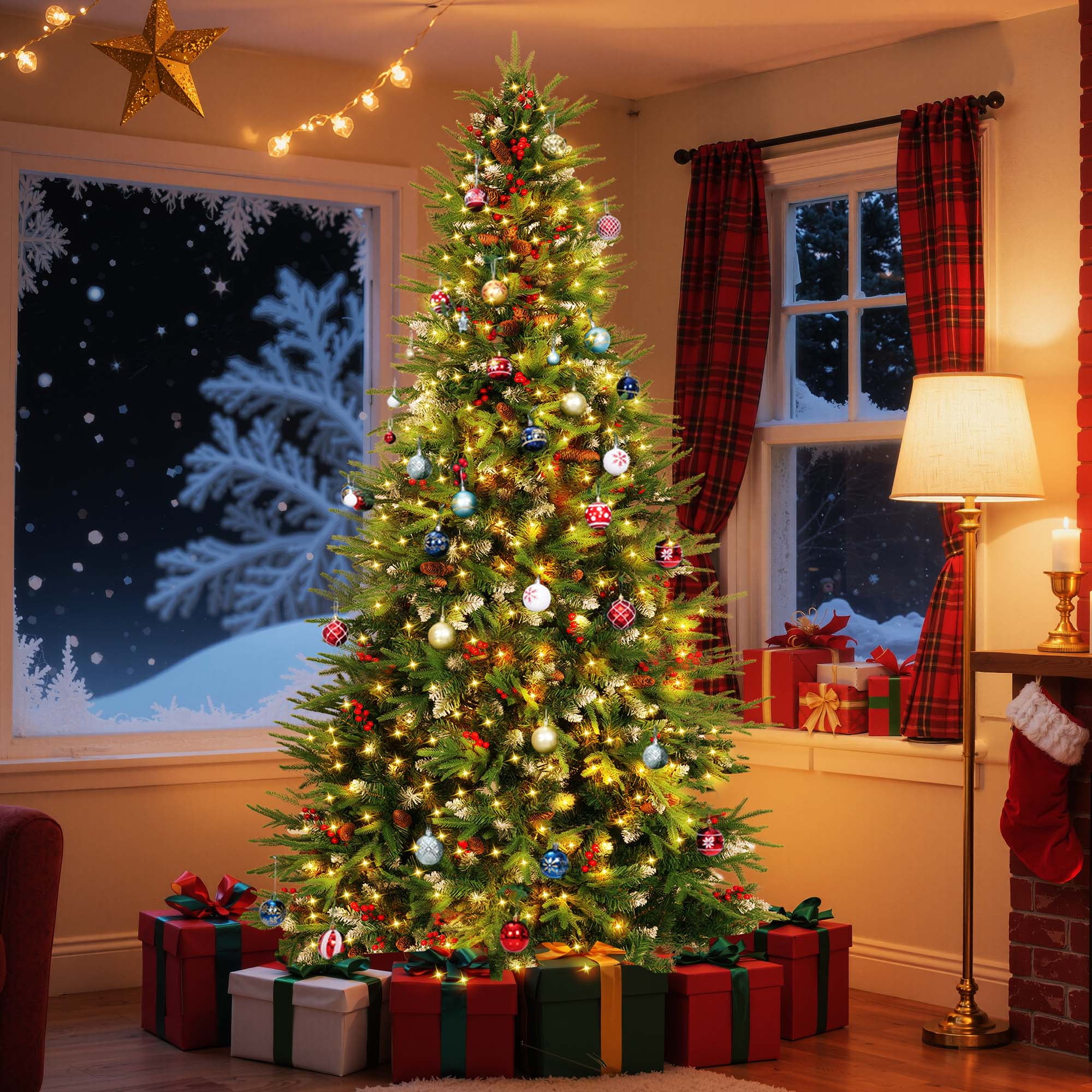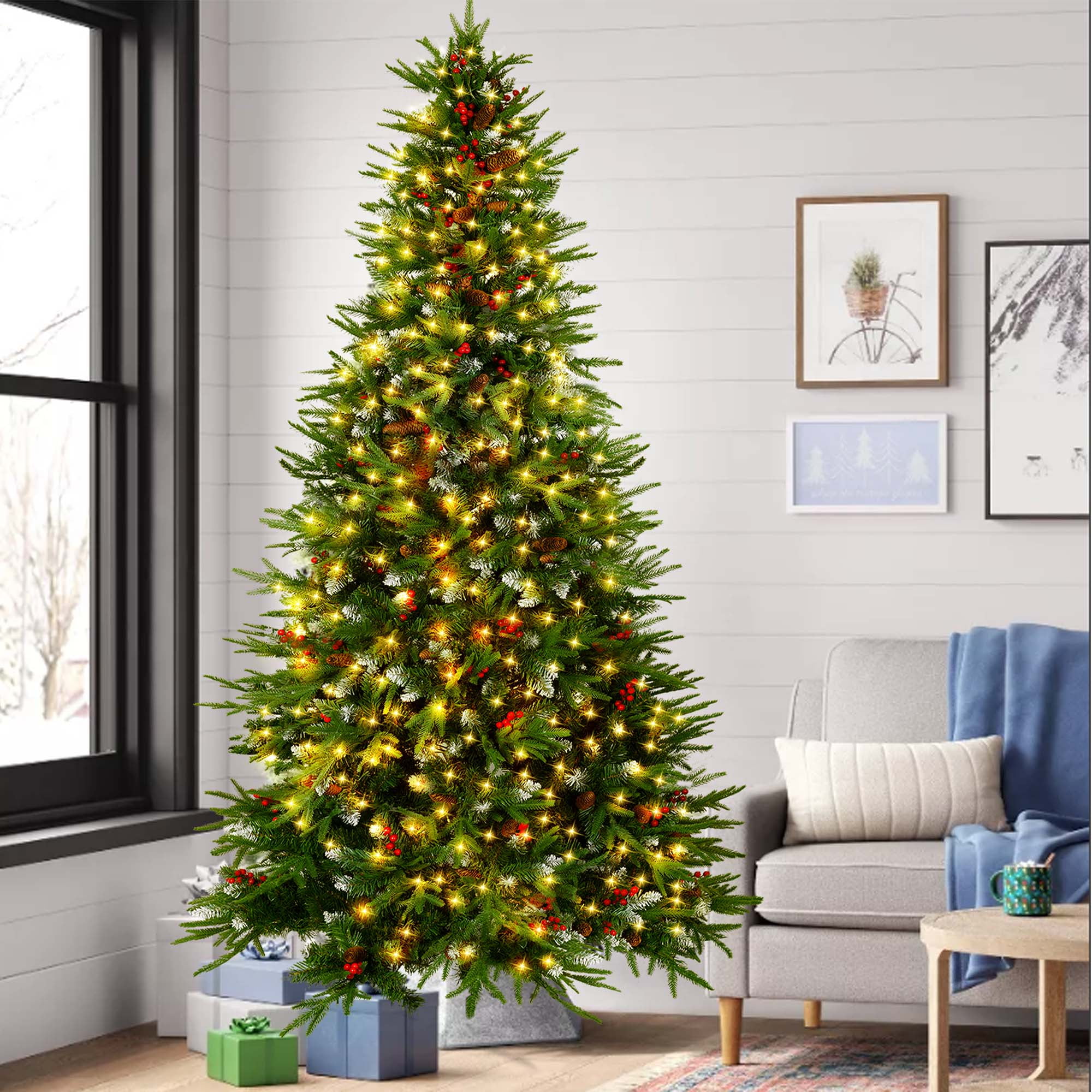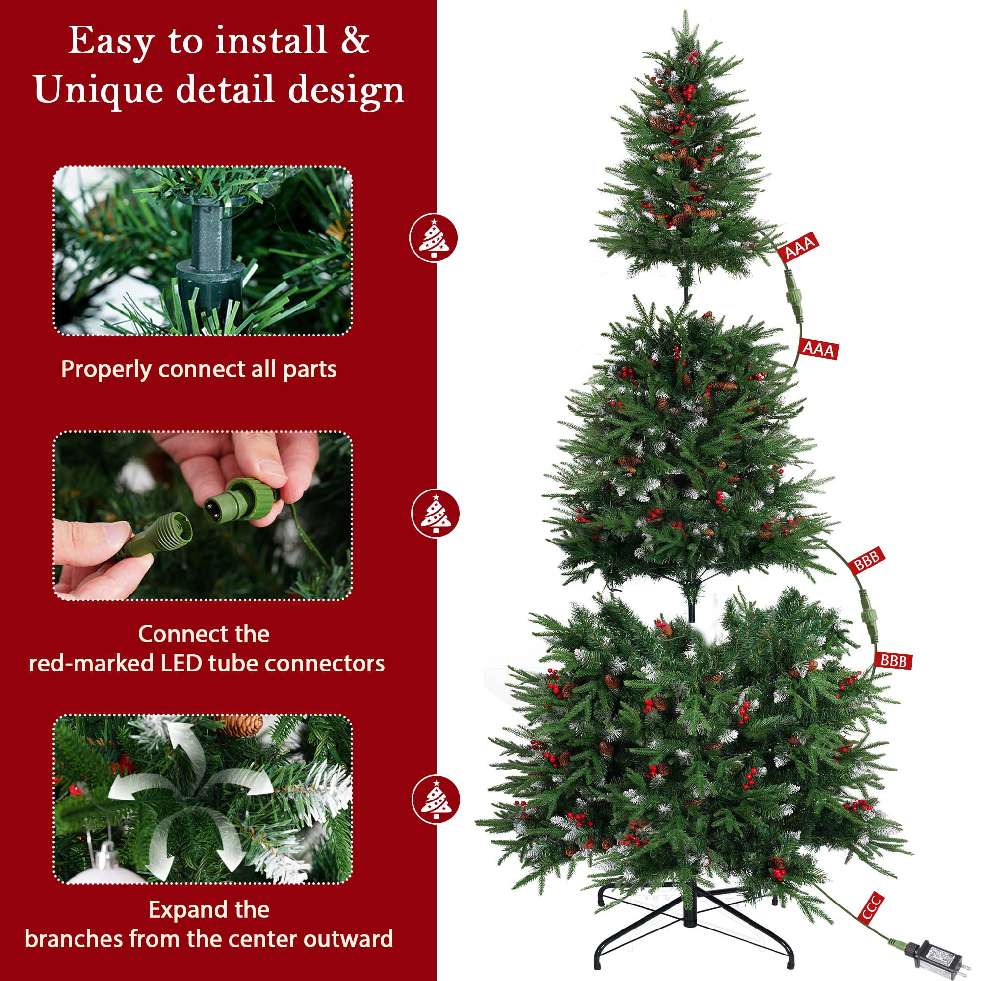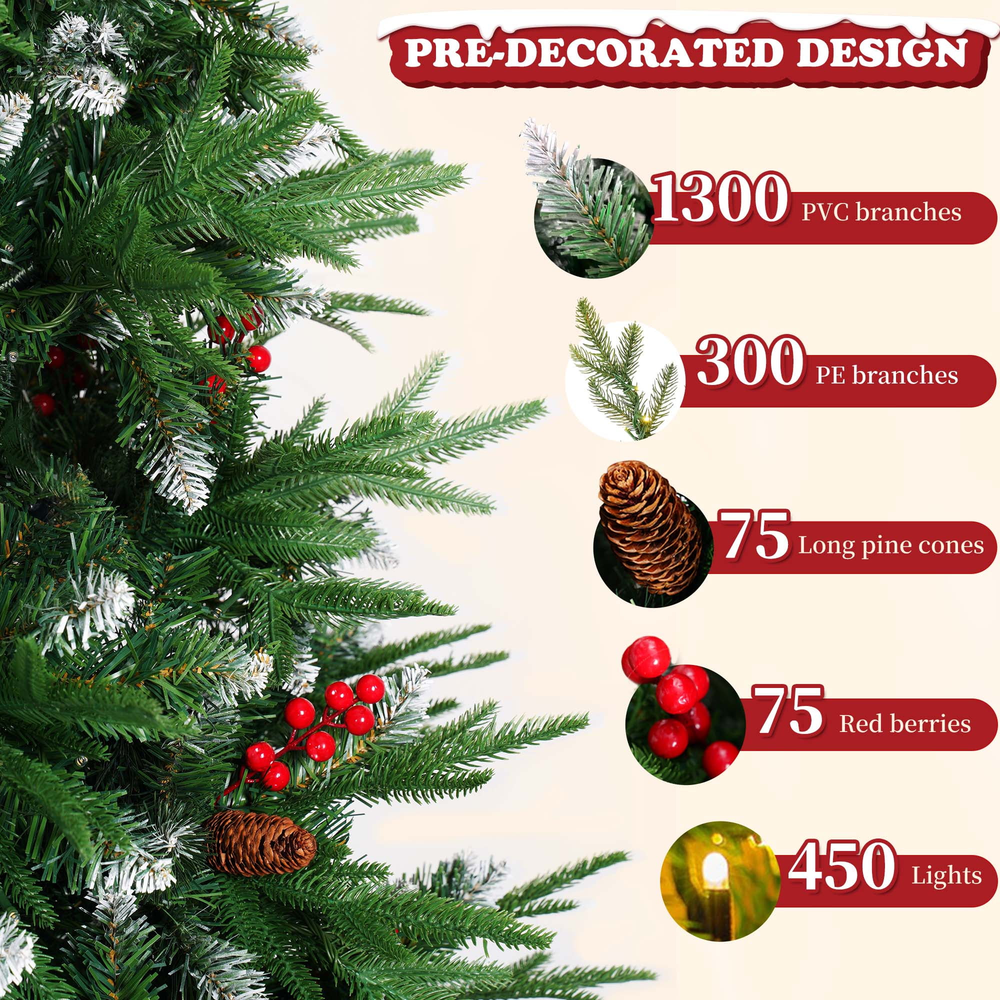 This tree features 1600 branches, made up of 1300 high-quality realistic PVC and 300 PE pieces. It has a full, natural appearance with lifelike texture and shape. 1300 PVC branches are coated with a snowy white effect, adding a romantic winter atmosphere. Equipped with 75 pinecones and 75 red berries pre-decorated among the branches, offering a simple and elegant look that enhances natural texture and festive atmosphere Pre-installed with 450 LED lights and built-in 8 lighting modes for easy switching, creating a festive Christmas atmosphere. The metal frame structure is sturdy and stable, ensuring the tree stands firmly. Its simple design allows for easy assembly, making setup quick and effortless—even for first-time users. Features a hinged structure where branches are pre-attached to the trunk. Each branch automatically falls into place and opens up, making setup quick and forming a natural pine tree shape. Includes a dedicated storage bag for easy organization and protection, keeping the Christmas tree dust-free and safe for long-term storage and repeated use. Three Size Options:Each size comes with warm white lights, a large storage bag, and a variety of decorative accessories. – 6FT Christmas Tree:800 Branches(600PVC+200PE), 300 LED Lights,55 Long Pinecones,55 Red Berries,1 Large Storage Bag(48*15*20 IN) – 7.5FT Christmas Tree:1600 Branches(1300PVC+300PE), 450 LED Lights,75 Long Pinecones,75 Red Berries,1 Large Storage Bag(48*15*20 IN) – 9FT Christmas Tree:2000 Branches(1550PVC+450PE), 700 LED Lights,90 Long Pinecones,90 Red Berries,1 Large Storage Bag(65*15*30 IN)