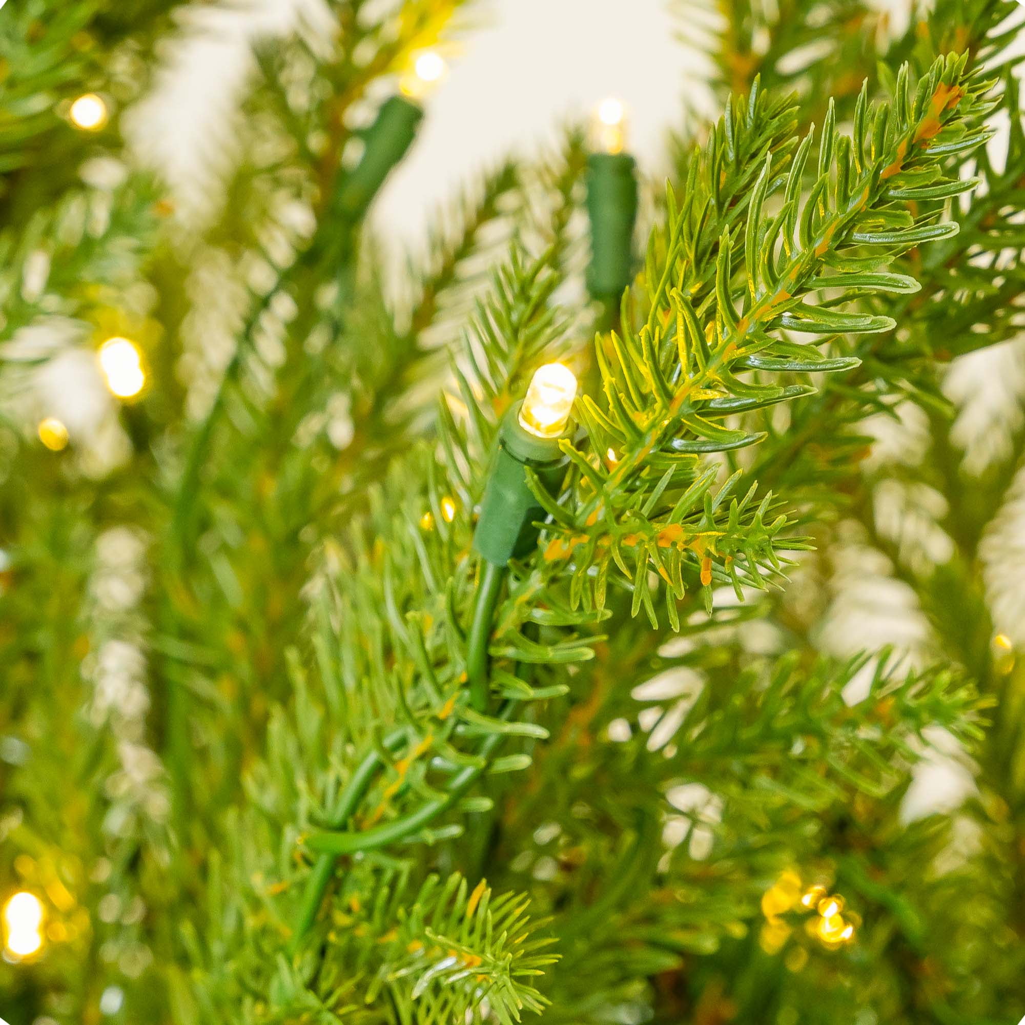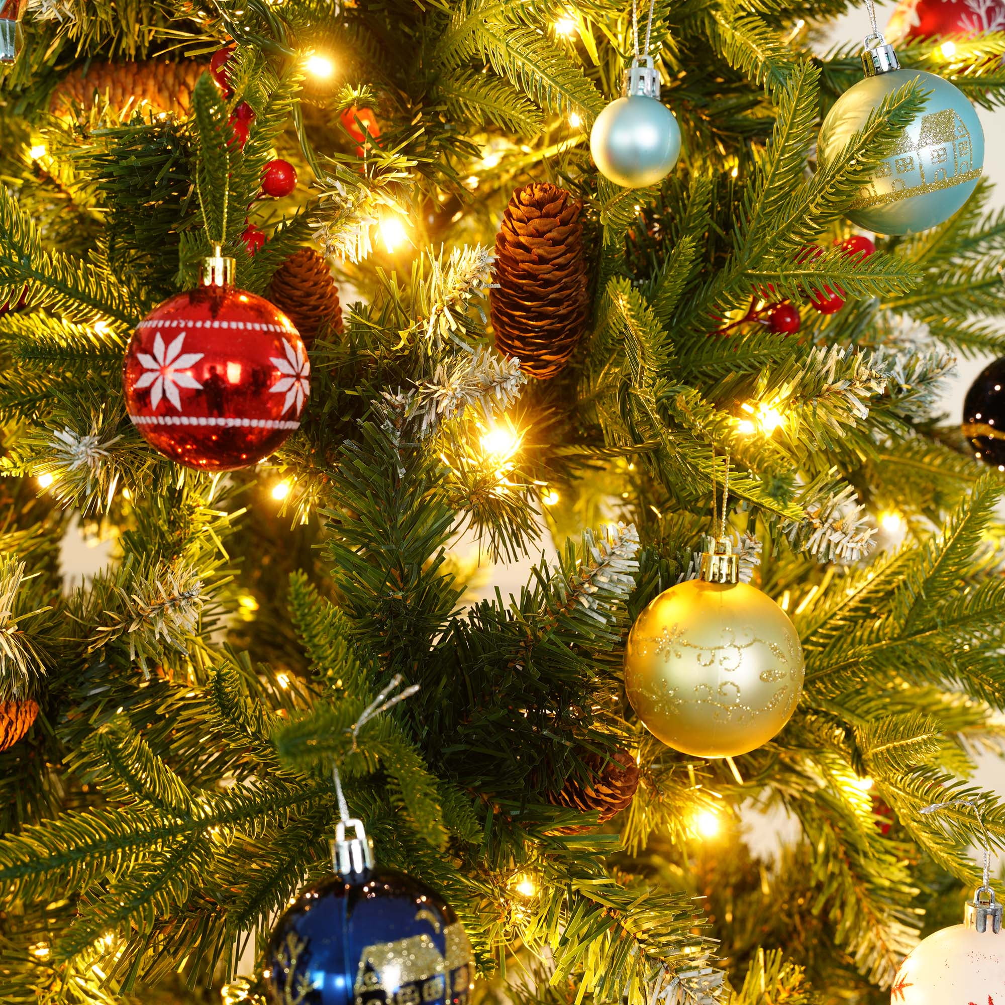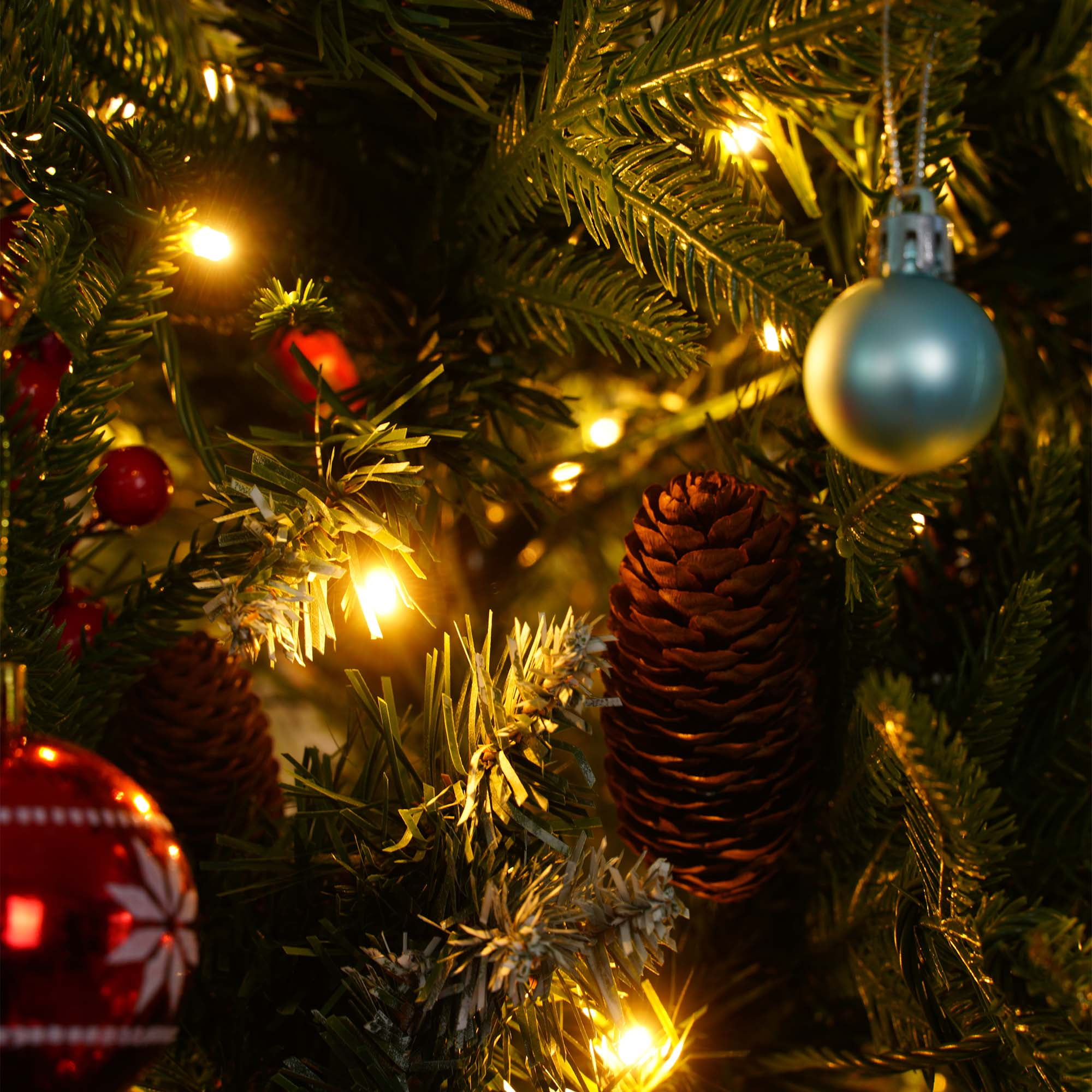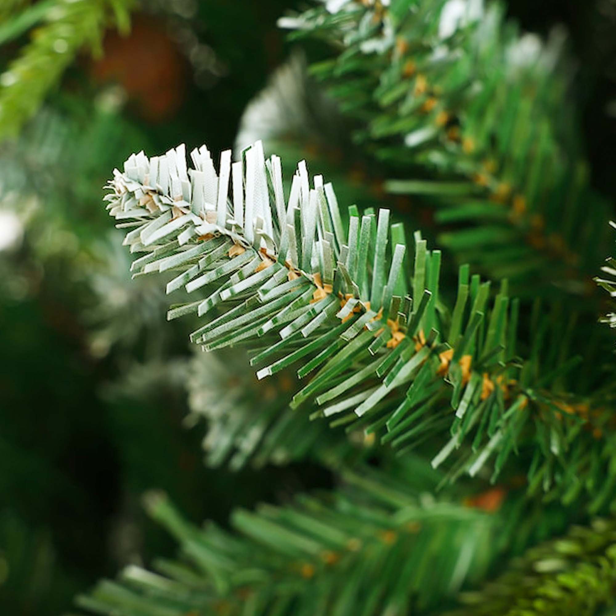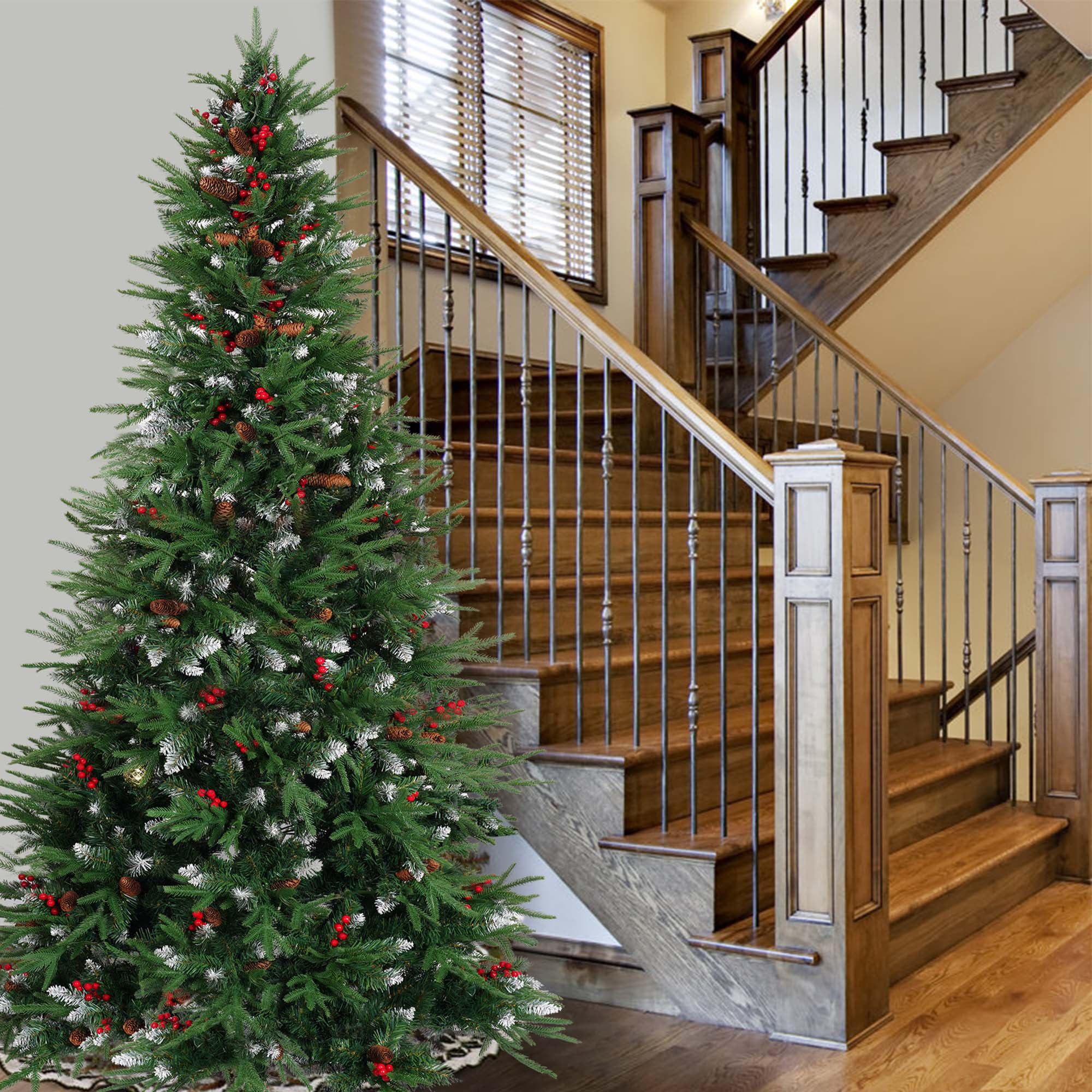 This tree features 1600 branches, made up of 1300 high-quality realistic PVC and 300 PE pieces. It has a full, natural appearance with lifelike texture and shape. 1300 PVC branches are coated with a snowy white effect, adding a romantic winter atmosphere. Equipped with 75 pinecones and 75 red berries pre-decorated among the branches, offering a simple and elegant look that enhances natural texture and festive atmosphere Pre-installed with 450 LED lights and built-in 8 lighting modes for easy switching, creating a festive Christmas atmosphere. The metal frame structure is sturdy and stable, ensuring the tree stands firmly. Its simple design allows for easy assembly, making setup quick and effortless—even for first-time users. Features a hinged structure where branches are pre-attached to the trunk. Each branch automatically falls into place and opens up, making setup quick and forming a natural pine tree shape. Includes a dedicated storage bag for easy organization and protection, keeping the Christmas tree dust-free and safe for long-term storage and repeated use. Three Size Options:Each size comes with warm white lights, a large storage bag, and a variety of decorative accessories. – 6FT Christmas Tree:800 Branches(600PVC+200PE), 300 LED Lights,55 Long Pinecones,55 Red Berries,1 Large Storage Bag(48*15*20 IN) – 7.5FT Christmas Tree:1600 Branches(1300PVC+300PE), 450 LED Lights,75 Long Pinecones,75 Red Berries,1 Large Storage Bag(48*15*20 IN) – 9FT Christmas Tree:2000 Branches(1550PVC+450PE), 700 LED Lights,90 Long Pinecones,90 Red Berries,1 Large Storage Bag(65*15*30 IN)
