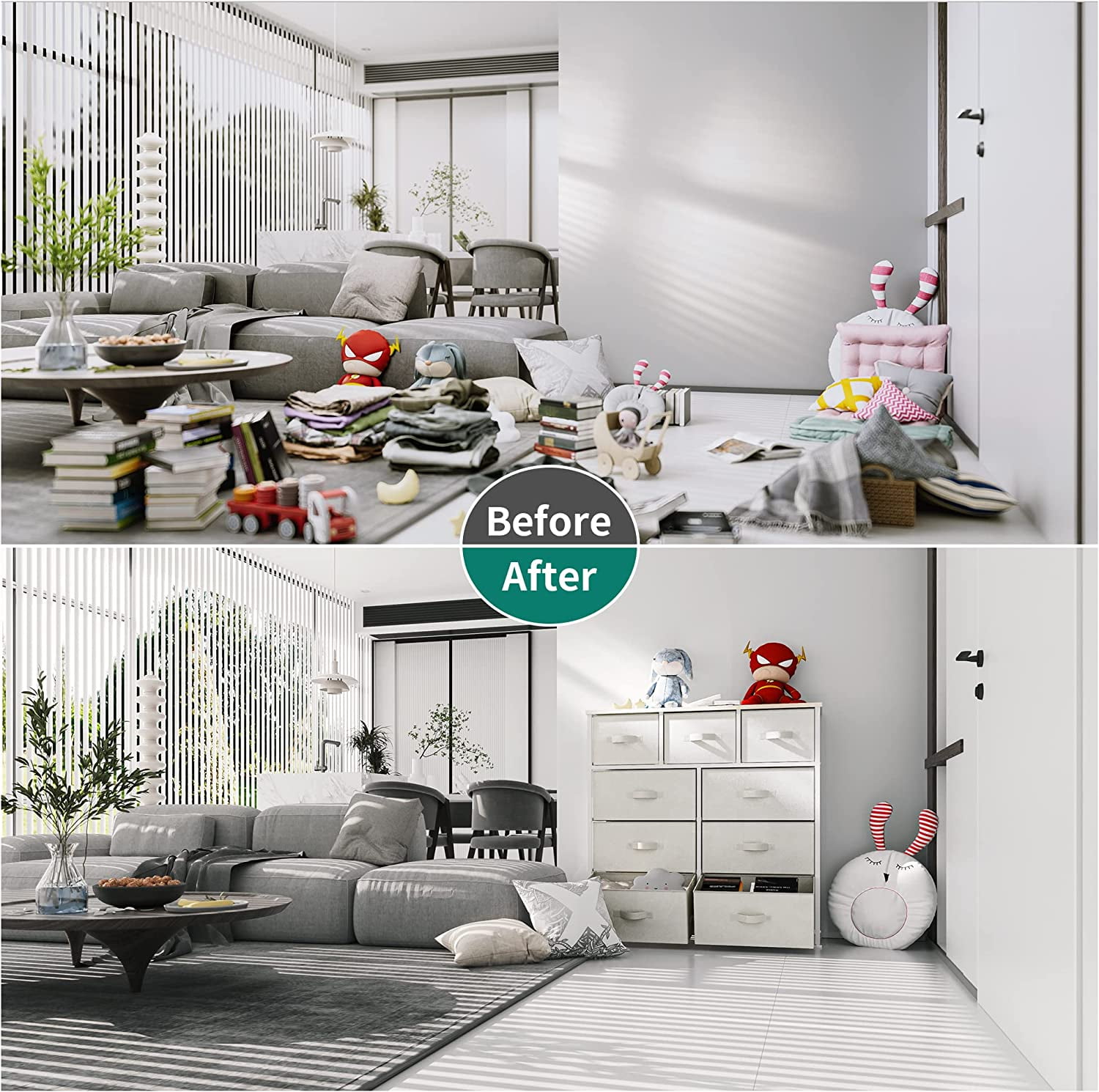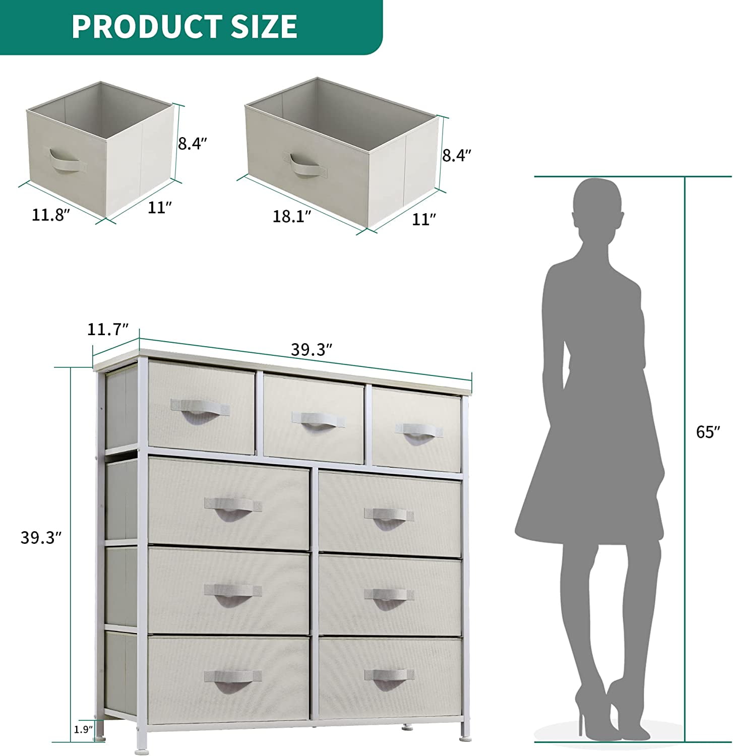 QUALITY CONSTRUCTION- Structured with a powerful metal frame and a durable MDF wooden top; Contains 9 removable drawers with easy-to-pull wooden handles; Held up by 4 adjustable plastic legs that prevent scratches to your floor; The innovative crossbar design on the back enhances product stability; The dresser can be secured to a wall with screws DURABLE FABRIC- The drawer’s front side is constructed with premium cationic polyester fabric; The surrounding sides are covered by breathable, non-woven synthetic fabric; Allows for easy care – simply wipe clean with a damp cloth and let air dry EASY ASSEMBLY- Comes with detailed instructions for a hassle-free installation; All pieces and accessories are included in the package; Assembly only requires you to fasten a few screws VERSATILE COLOR SCHEME- Highlights a sleek, modern design combining premium dark gray fabric drawers, a sturdy black metal frame, and a wooden tabletop; Perfect for living rooms, bedrooms, hallways, entryways, closets, nurseries, etc. LARGE STORAGE CAPACITY- The Dextrus 9-Drawer dresser conveniently organizes your clothes, scarves, socks, T-shirts, pants, sunglasses, books, small toys, etc.; Overall dimensions: 39.4″ L x 11.8″ W x 39.4″ H; Large drawer dimensions: 18.1″ L x 11″ W x 8.5″ H; Small drawer dimensions: 11.8″ L x 11″ W x 8.5″ H Fixing the fabric dresser to the wall is well recommended. Please follow the instructions.