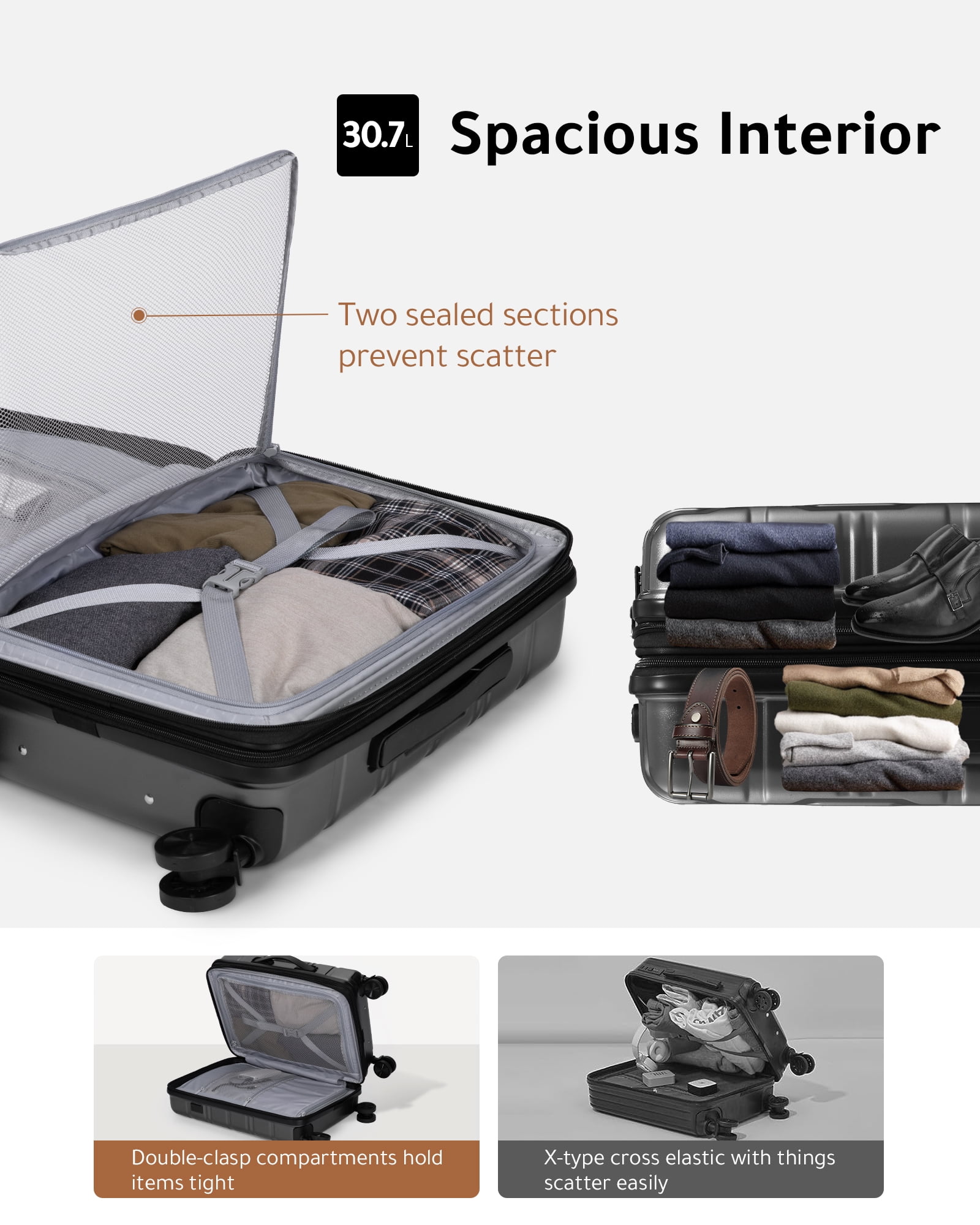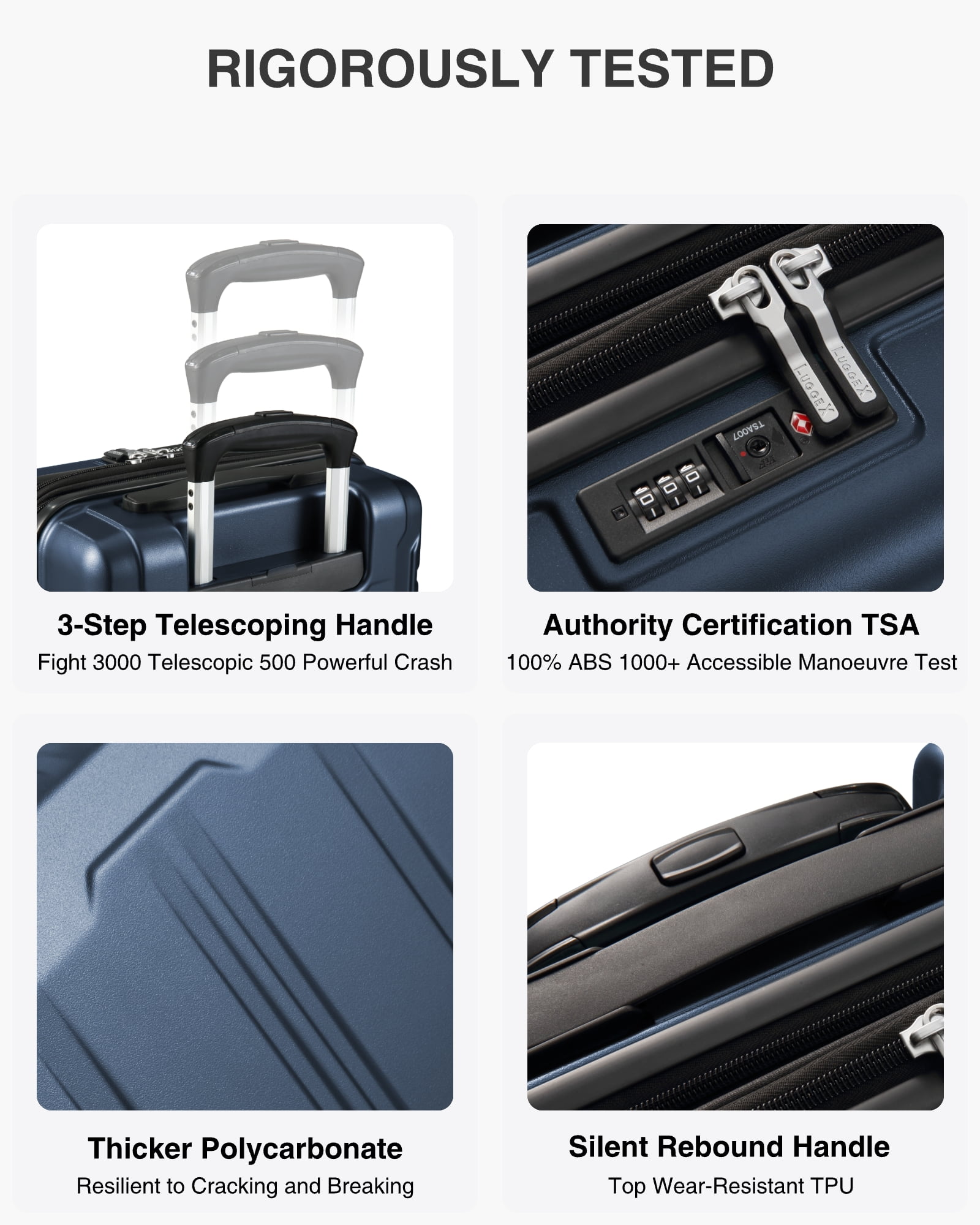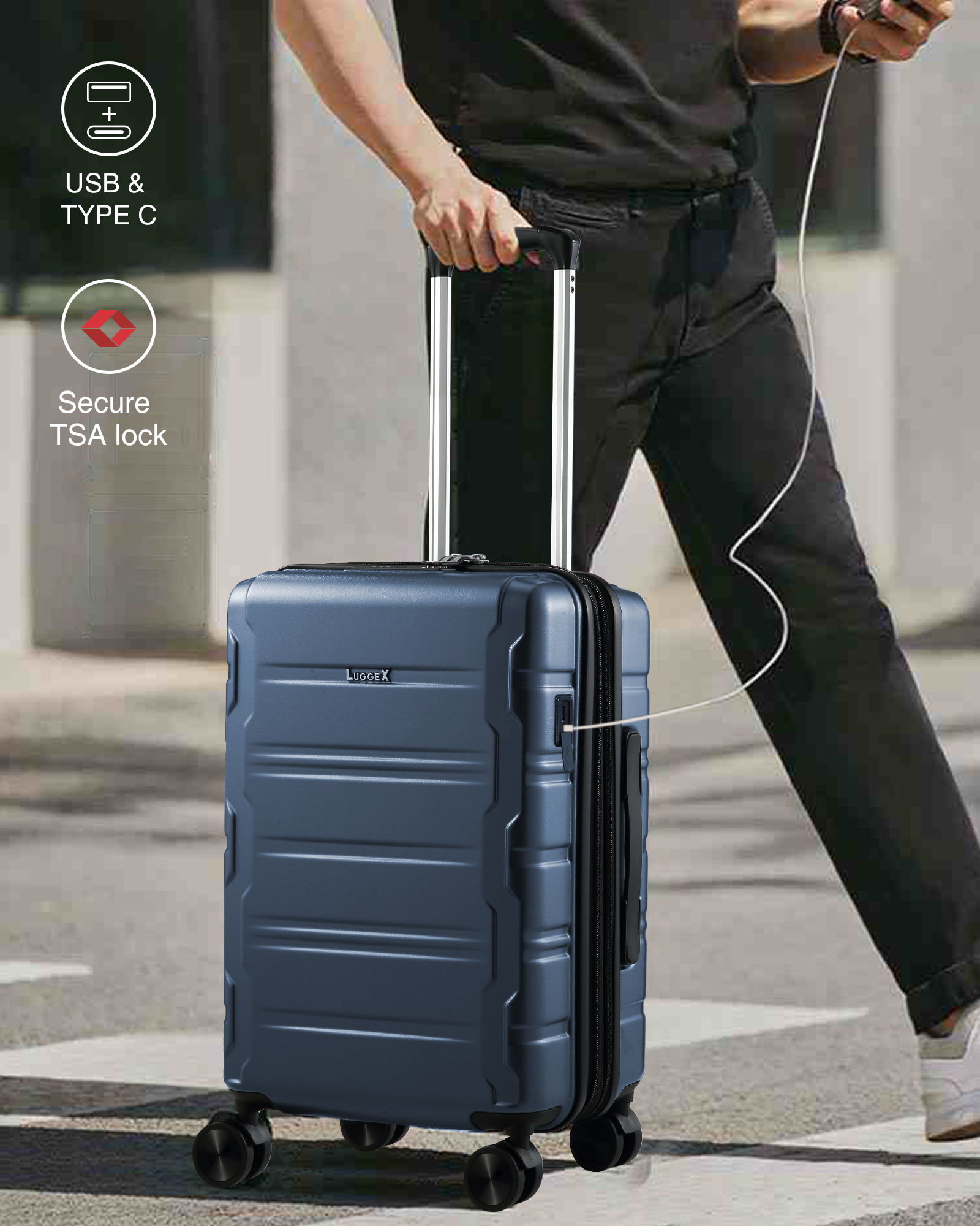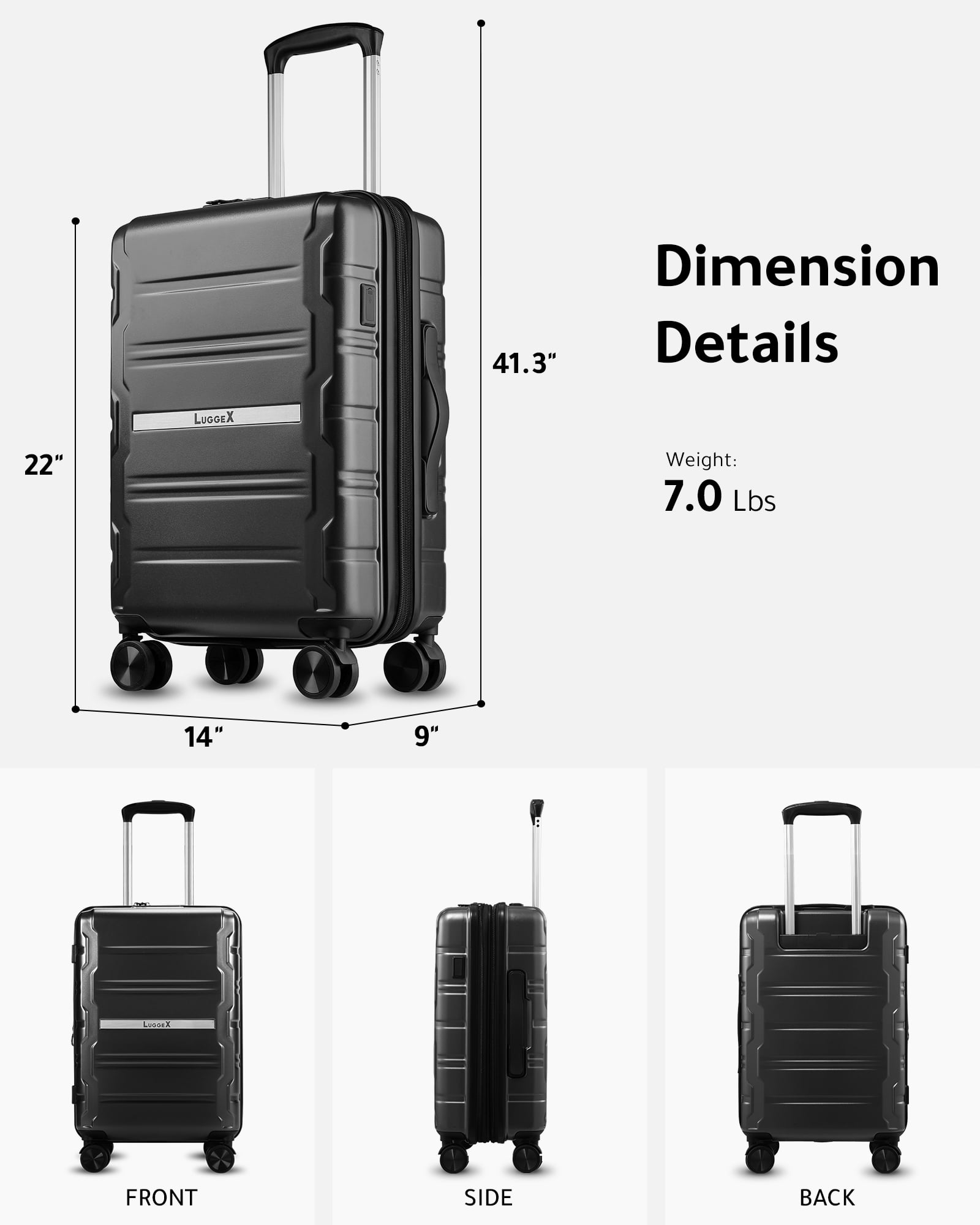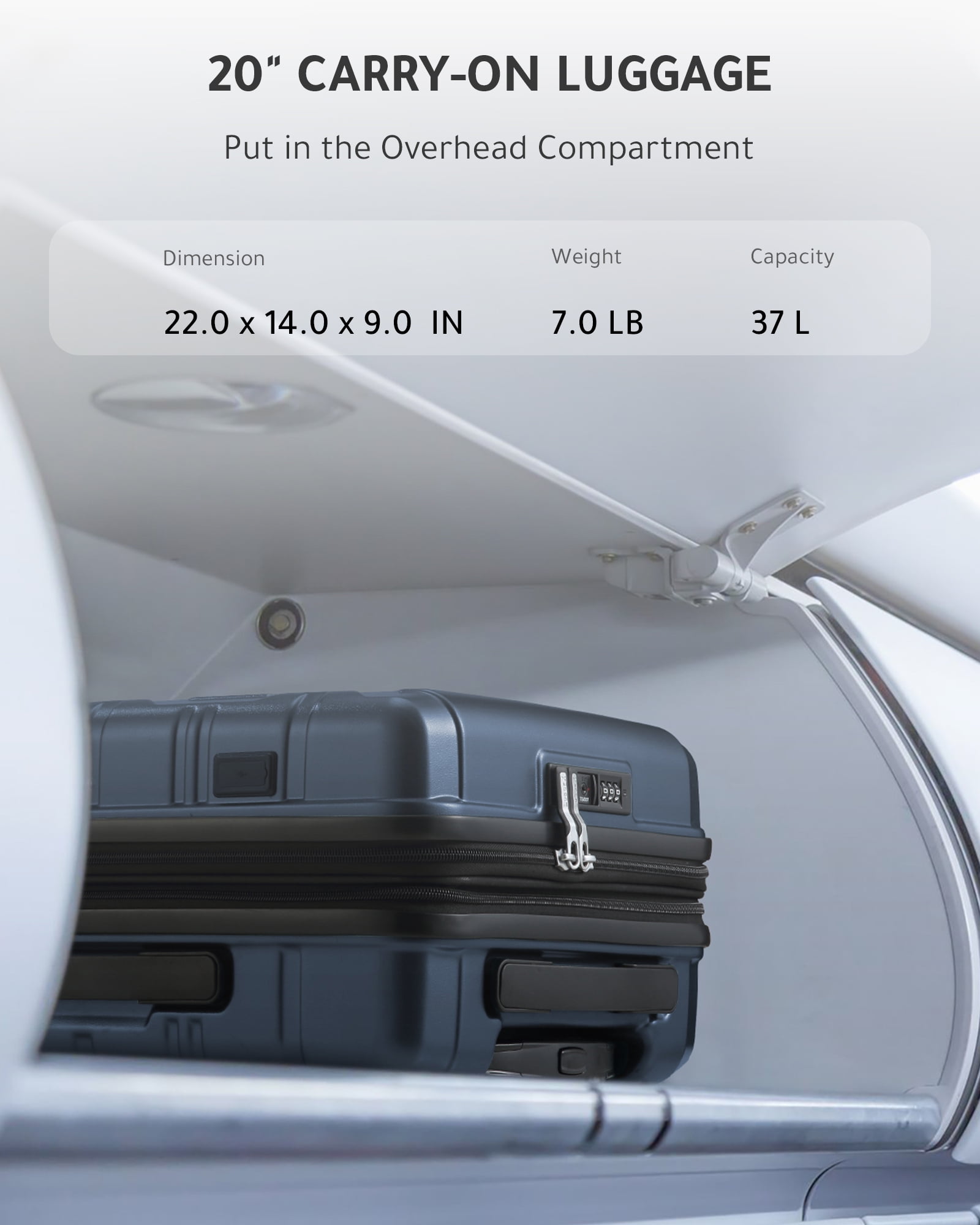 YOETEY —— Your Choice of Fashionable Travel YOETEY Carry on Luggage 22x14x9 Airline Approved, 100% Polycarbonate Hard Shell Luggage with USB Port 20 inch Expandable Lightweight Suitcase with Spinner Wheels TSA Lock – Suitable for Back to School, College and Travel Trip ✅20-INCH SIZE:21.4 x 13.7 x 8.4 IN, Weight:7.0 LB, Capacity:30.7L【After Expansion:35.2 L】 ✅Color Choice:Gun-Black / Navy-Blue / Teal ⭐How do I set the code when I first get it? 1. Turn the dials to the correct combination.(0-0-0) 2. Press down the button by a tool, set the new combination (e.g.:8-8-8), then pull the square part. 3. Lock the case again, and now you can open the lock with the new combination. ⭐How to use the charging port? 1. Unzip the front pocket and find the cable inside. 2. Charge it with a power bank. (The USB input only works for USB output) 3. Open the outside charge port and connect it with a cable, then connect it to your phone. ⭐If the luggage I received was damaged, who can I look for? We promise that every luggage will go through strict quality inspection before shipping. Please feel free to let us know and the related team will respond within 12H.