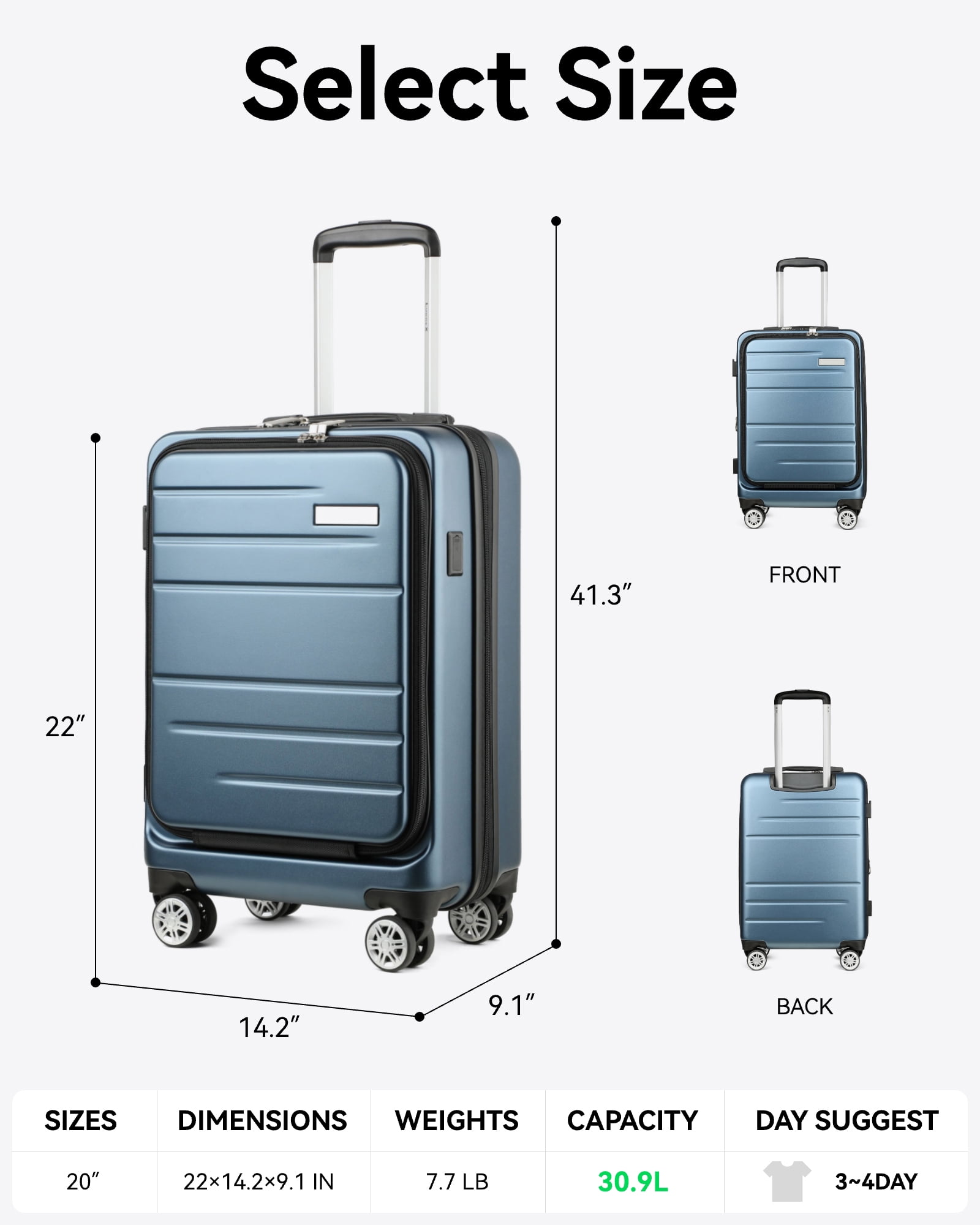 ⭐【Basic Information】√Before Expansion Size: 22.1×14.5×9.3 IN, Weight: 7.9 LB, Capacity: 36.1L √After Expansion Size:22.1×14.5×10.1 IN,Weight: 7.9 LB, Capacity: 40.5L ⭐【Maximize Packing Capacity】Our carry on suitcase 22 x 14 x 9 airline approved features a zipper-released expansion mechanism, adding 12% extra space to accommodate more travel essentials. ⭐【Front Pocket Convenience】Stay organized on the go with this black suitcase with spinner wheels featuring a spacious front pocket. Easily store and access your 15.6-inch laptop and other essentials. (When the front pocket is full, the main compartment space will be smaller) ⭐【Premium Polycarbonate Material】Crafted with lightweight and durable Polycarbonate material, our expandable suitcase is built to withstand time and impact. Enjoy a worry-free travel experience with a hard case luggage. ⭐【Quality Assurance】We stand behind the excellence of YOETEY luggage and provide a comprehensive support plan for 3 years, ensuring your peace of mind. If you encounter any issues, our dedicated customer service team will respond promptly within 12 hours.