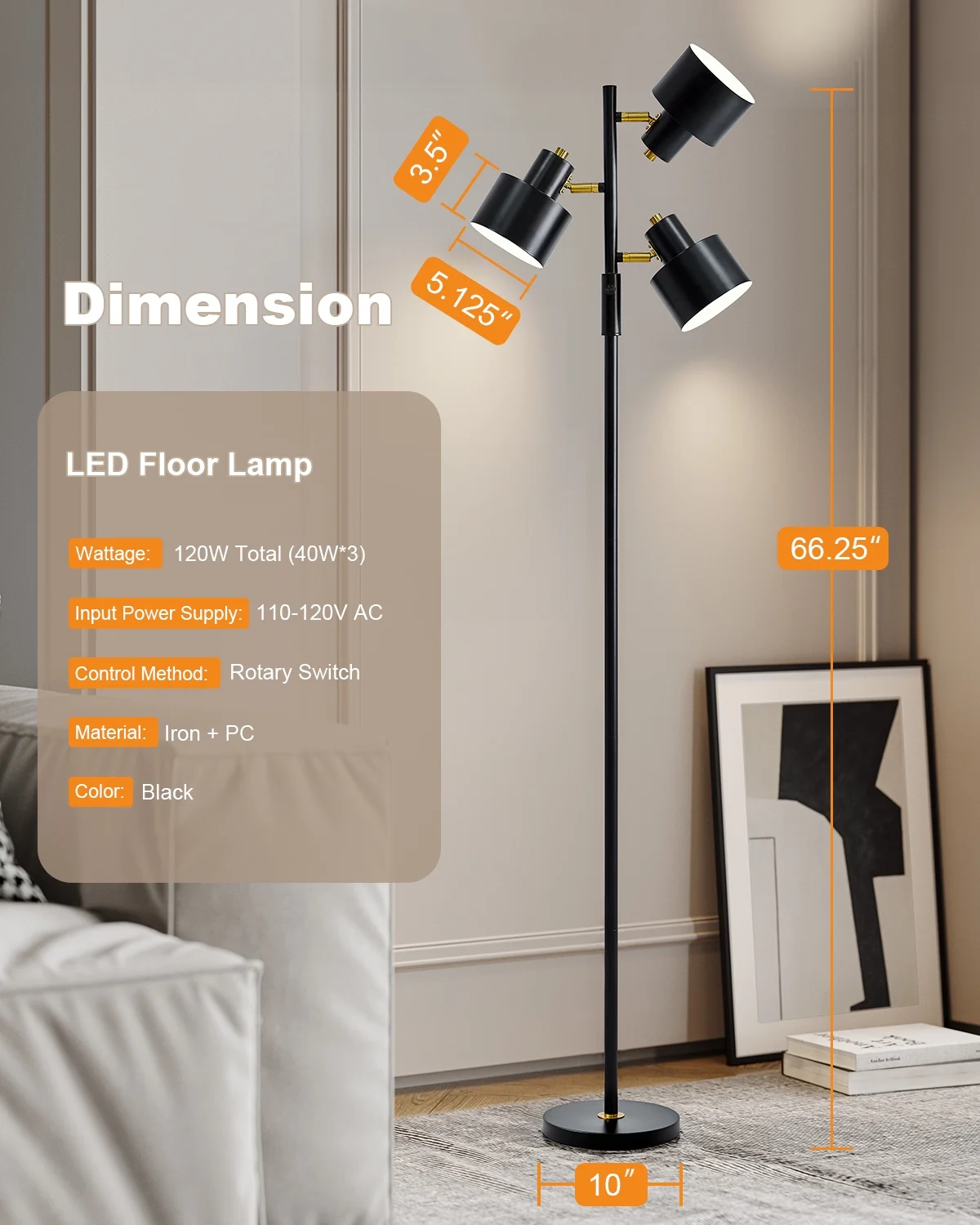 Black Floor Lamp for Living Room: Made of Black metal lamp body. In metal surface adopts advanced metal plating technology instead of the traditional method, the coating more stable and will not fall off, the coating color more uniform. This stylish floor lamp is very stable and wobble free, perfect decor for living room or bedroom, it’s easy for you to place it in corner or tight space. Standing Lamp Size(After Assembly): Standing lamp is 66.25 inch high overall. Round lamp base is 10 inch wide at bottom. The streamlined design and the sleek white metal pole make this modern floor lamp practical for smaller spaces. Its slim proportions and adjustable head make it the perfect choice for tight corners and even the smallest of rooms corner. Perfect Design Bedroom Lamp: Each floor lamp use a standard E26 bulb socket, compatible with various CFL and LED bulb, or incandescent bulb. With a shining look and an adjustable head, you can position the angle to how you need it. Provides soft yet plentiful room lighting to enlighten your indoor space, and its slender design allows it to position well near your couch, armchairs, side tables or bed. This modern floor lamp is not only a lighting lamp, but also a perfect decoration for your rooms. Industrial Floor Lamp: Rotary ON/OFF switch on the lamp-post is convenient to turn on/off the floor lamp for bedroom without having to get up and press a wall switch, it fits for any corner on your bedroom or living room. Easy Assembly: This arched floor lamp can be used for bedroom, living room, study or office lighting. The lamp poles and base, arched poles, adjustable head are need to be assembled(Bulb not included), you can follow the assembly instruction to assemble them or by yourself, you will find it’s fun and easy to assemble this floor lamp. Also, we are 100% dedicated to your complete satisfaction, so all table lamps come with 12 months warranty. Product Parameters Style: Modern Color: Black Product Dimensions: 10 x 15 x 66.25 Inches Material: Metal Lamp Type: Floor Lamp Room Type: Bedroom,Living Room,Office Shade Color: Black Shade Material: Metal Power Source: Corded Electric Switch Type: Rotary Switch