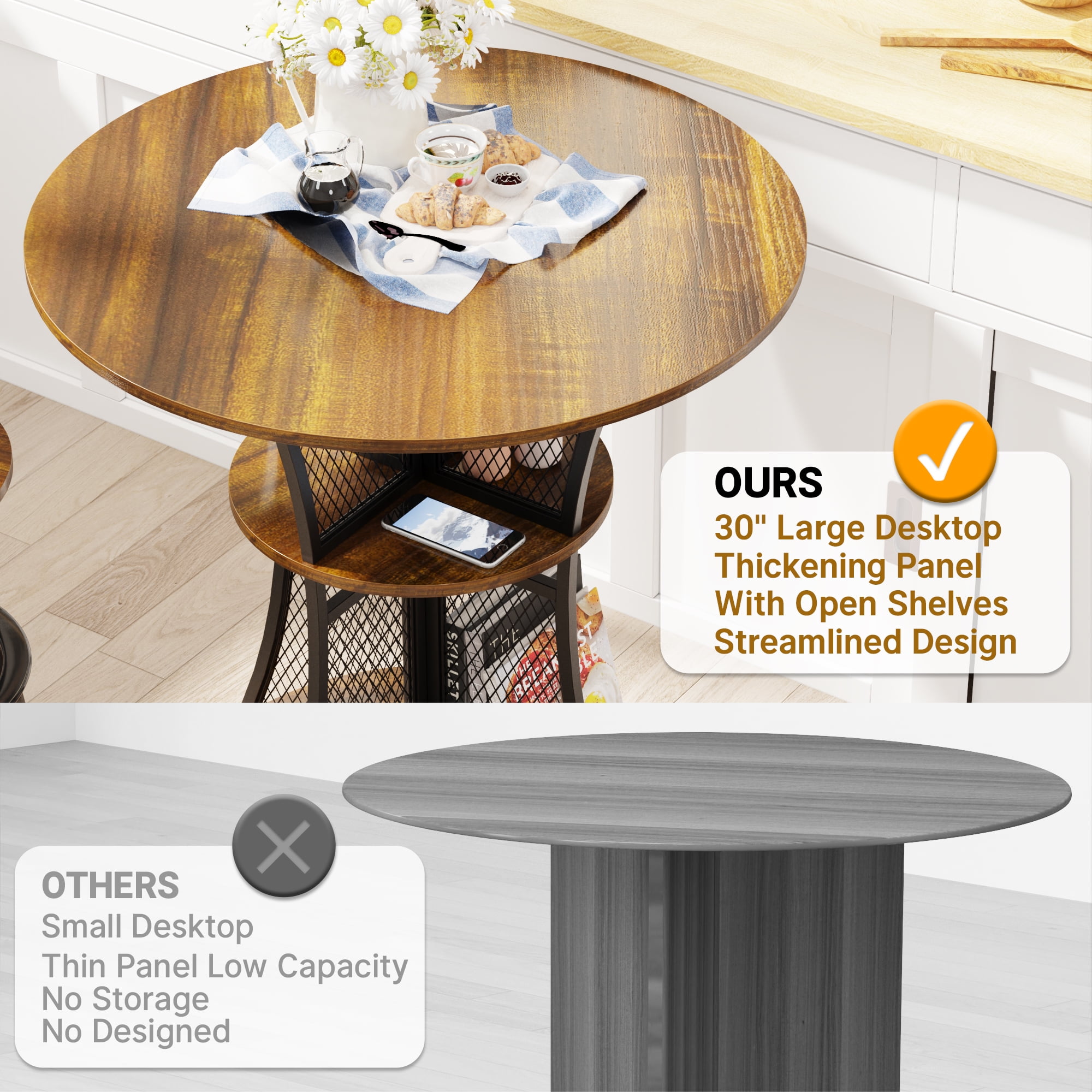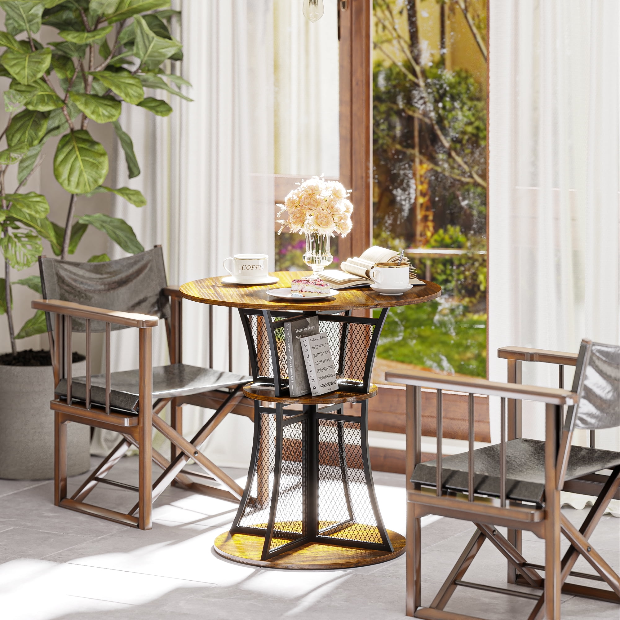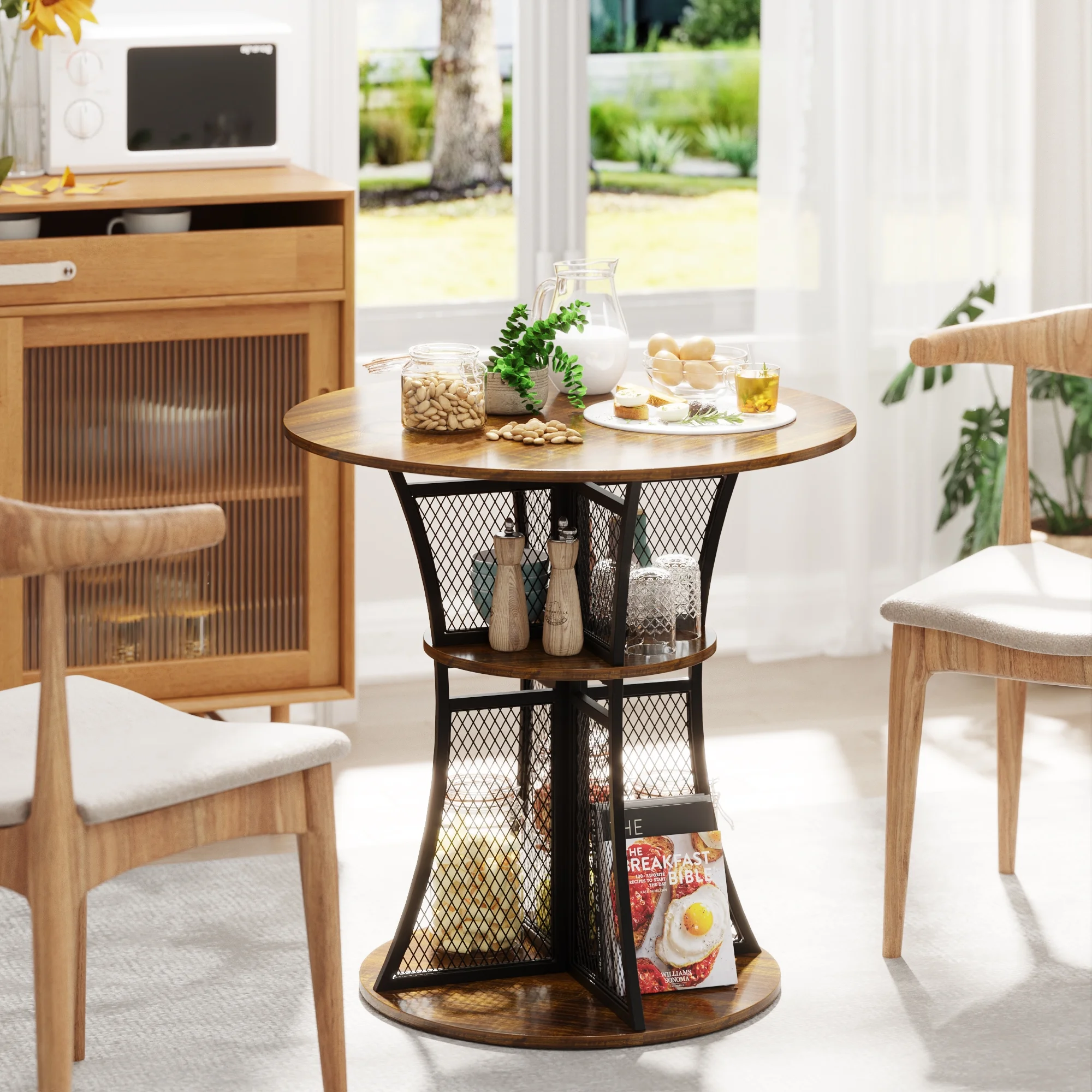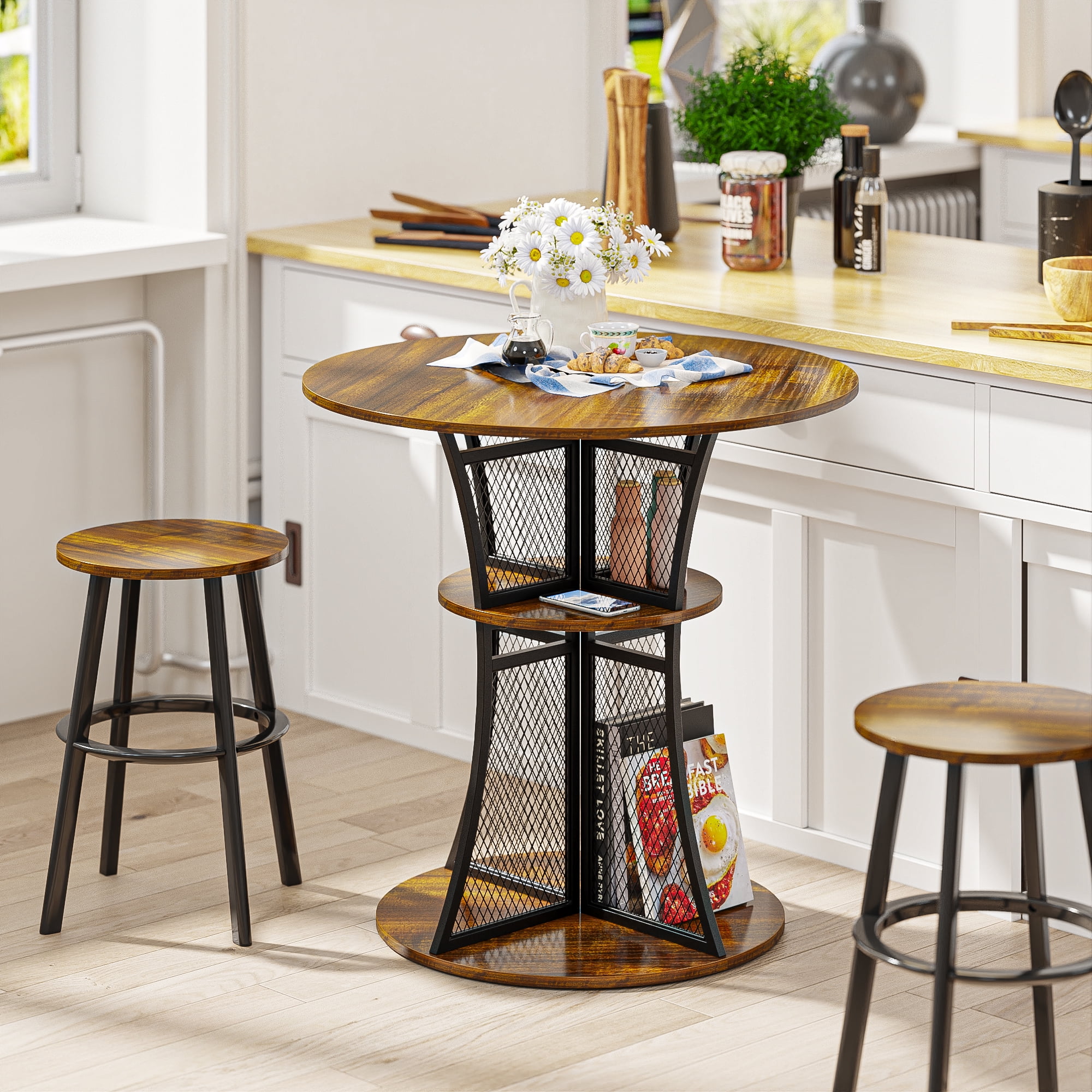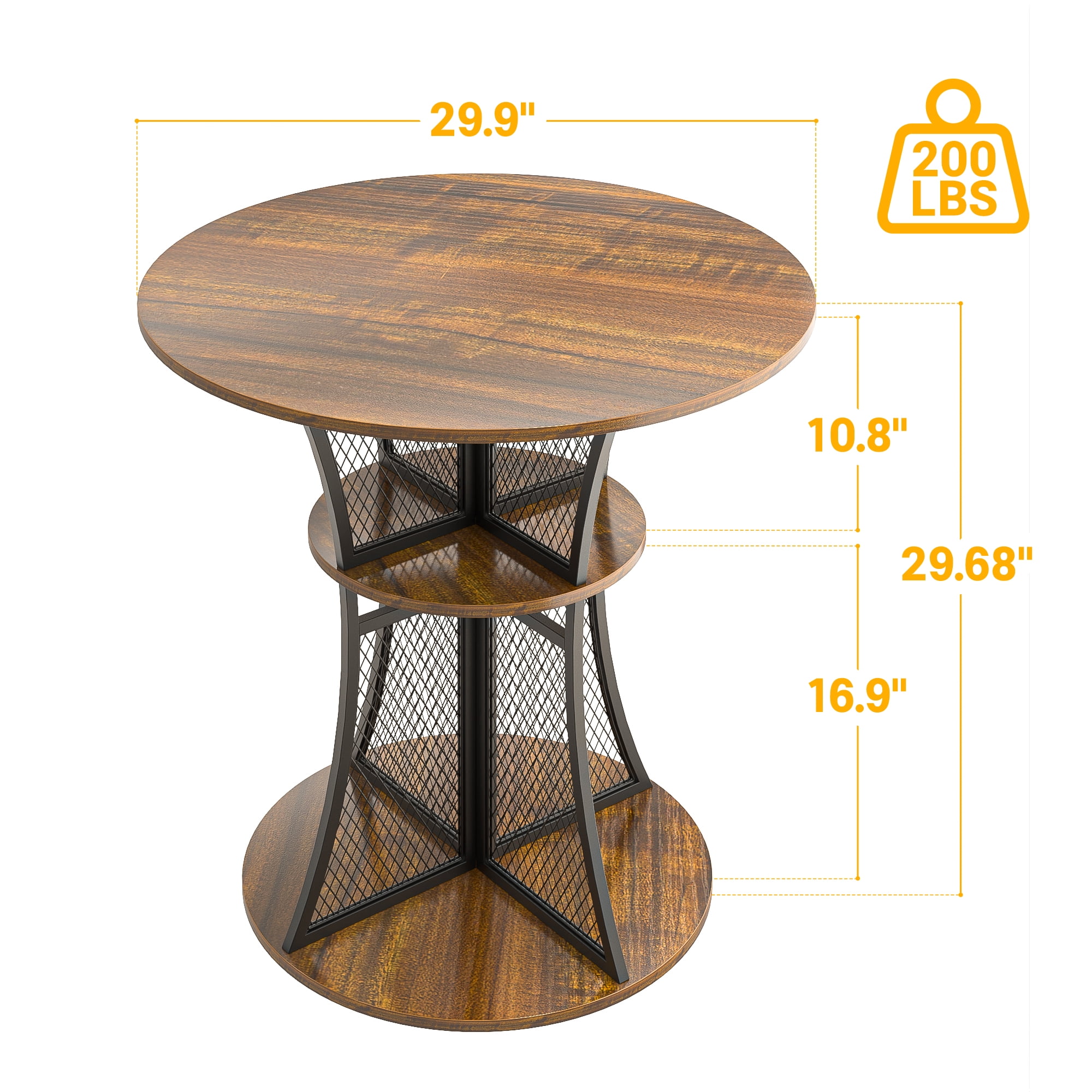 Features: EYE-CATCHING DESIGN – Our small pub table shaped like an hourglass with graceful curves, enhances the entire setting with its industrial vintage aesthetic while creating a relaxing ambiance for your leisurely space, perfect for your dining room and kitchen. STABLE & DURABLE ROUND TABLE – This unique and beautiful round dining table is made of reliable particle board and sturdy metal reinforced brackets for a sturdy and durable experience, providing enhanced support for heavy loads and everyday use. POWERFUL STORAGE FEATURES – Our bar table has a great storage function as it has 8 built-in small open shelves where you can store some of your daily used items, which not only saves space on the tabletop board, but also organizes them in a very beautiful and powerful way. MULTIPLE USAGE – It can be used not only as a kitchen table, but also as a breakfast table, coffee table, living room table, casual tea table, and outdoor dining table, and it also fits perfectly into kitchens, small-space dining rooms, patios, decks, cafes, offices, and other scenarios, and always provides a comfortable and cozy space. EASY SET-UP IN MINUTES – Assembly is easy for our small bar table, easy-to-follow instructions will help you easily finish the assembly. CONVENIENT VERSATILITY – This dining table with storage is not solely for dining purposes. The special design makes it a versatile space for work, studies, or even casual gatherings. Whether you reside in a small apartment, studio, or a cozy nook, our small dining set for 2 offers a beautiful combination of functionality and style. Specifications: Product Type: Bar Table, Dining Table, Tea table, Coffee Table Material: Particle Board, Sturdy Metal Special Feature: Strong Storage Space, Portable, Multifunctional Use Product Dimensions: 29.9″L x 29.9″W x 29.68″H Package Dimensions: 32.68″L x 31.89″W x 3.35″H Package Weight: 36.24lbs Recommended Location: Dining Room, Living Room, Kitchen, Garden Maximum Weight Recommendation: 200 lb Packages Included: 1 x 30″ Bar Table 1 x Install Manual 1 x Screw Set 1 x Components