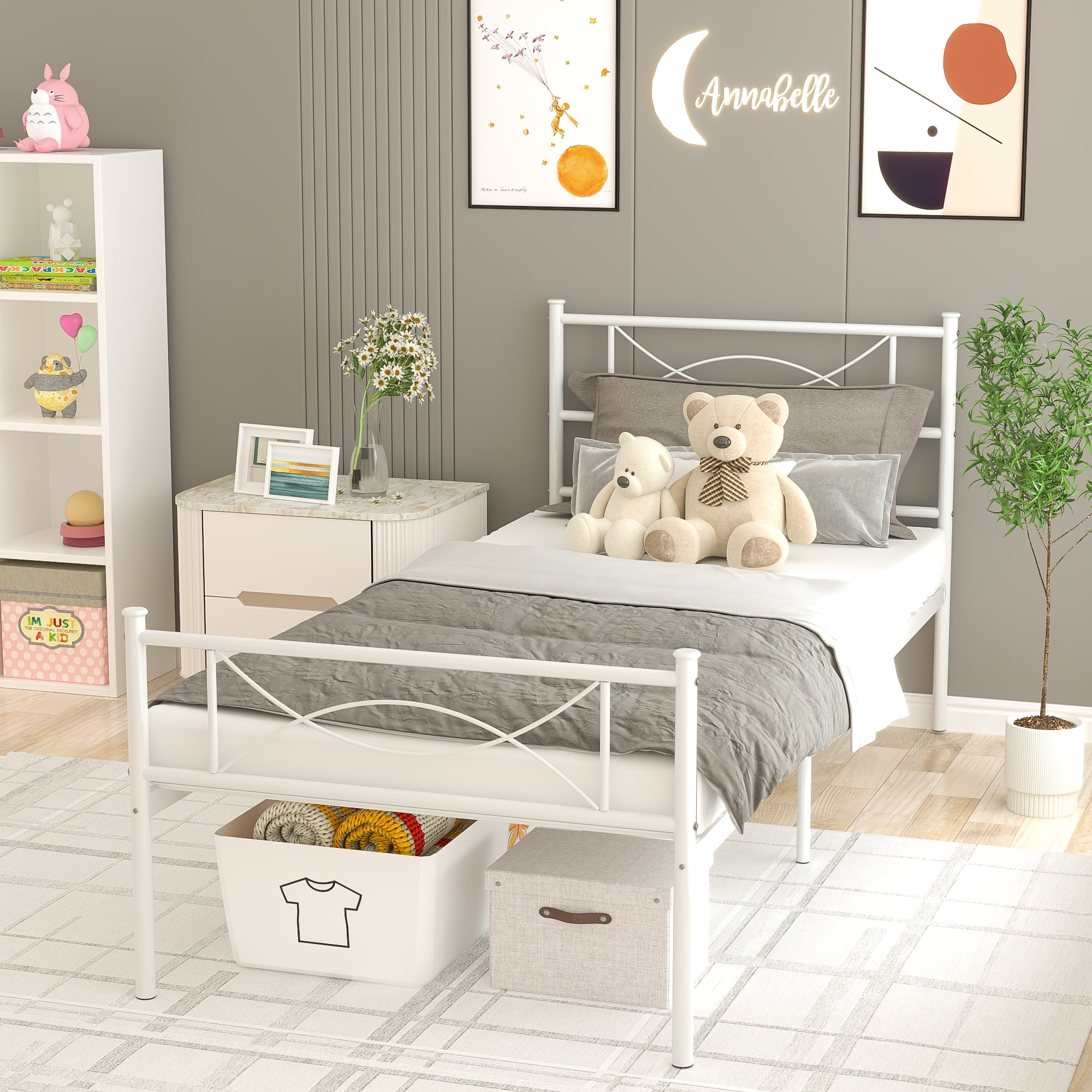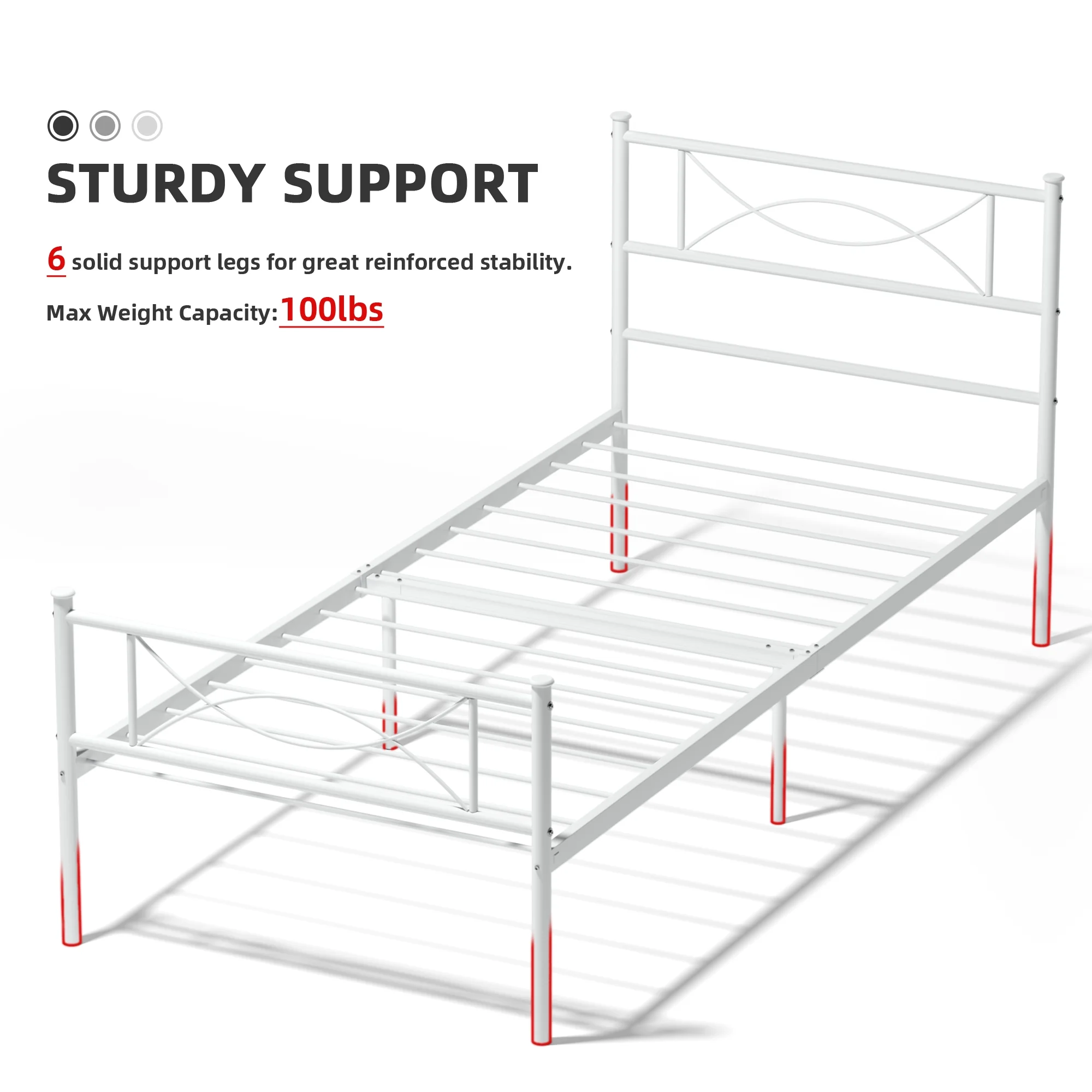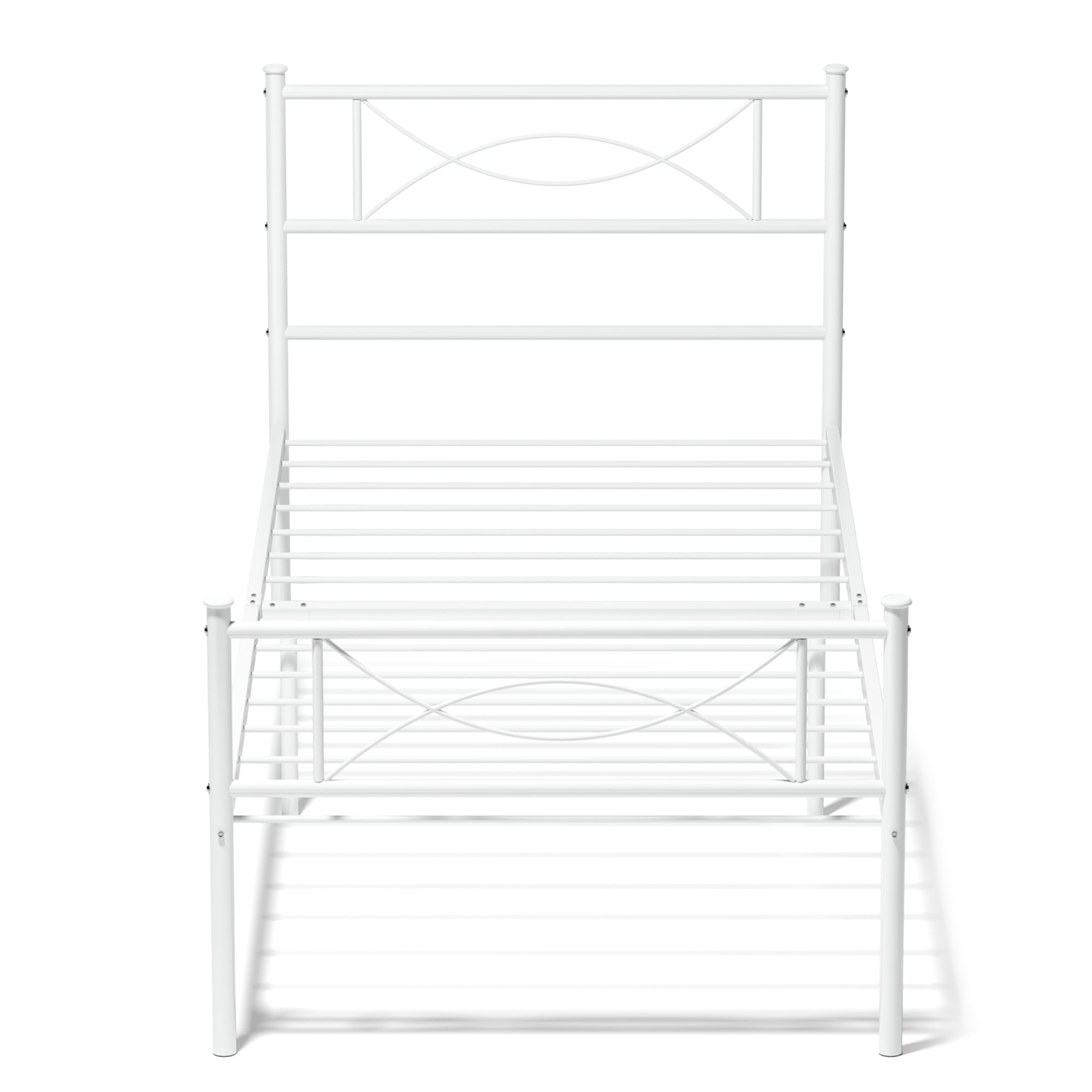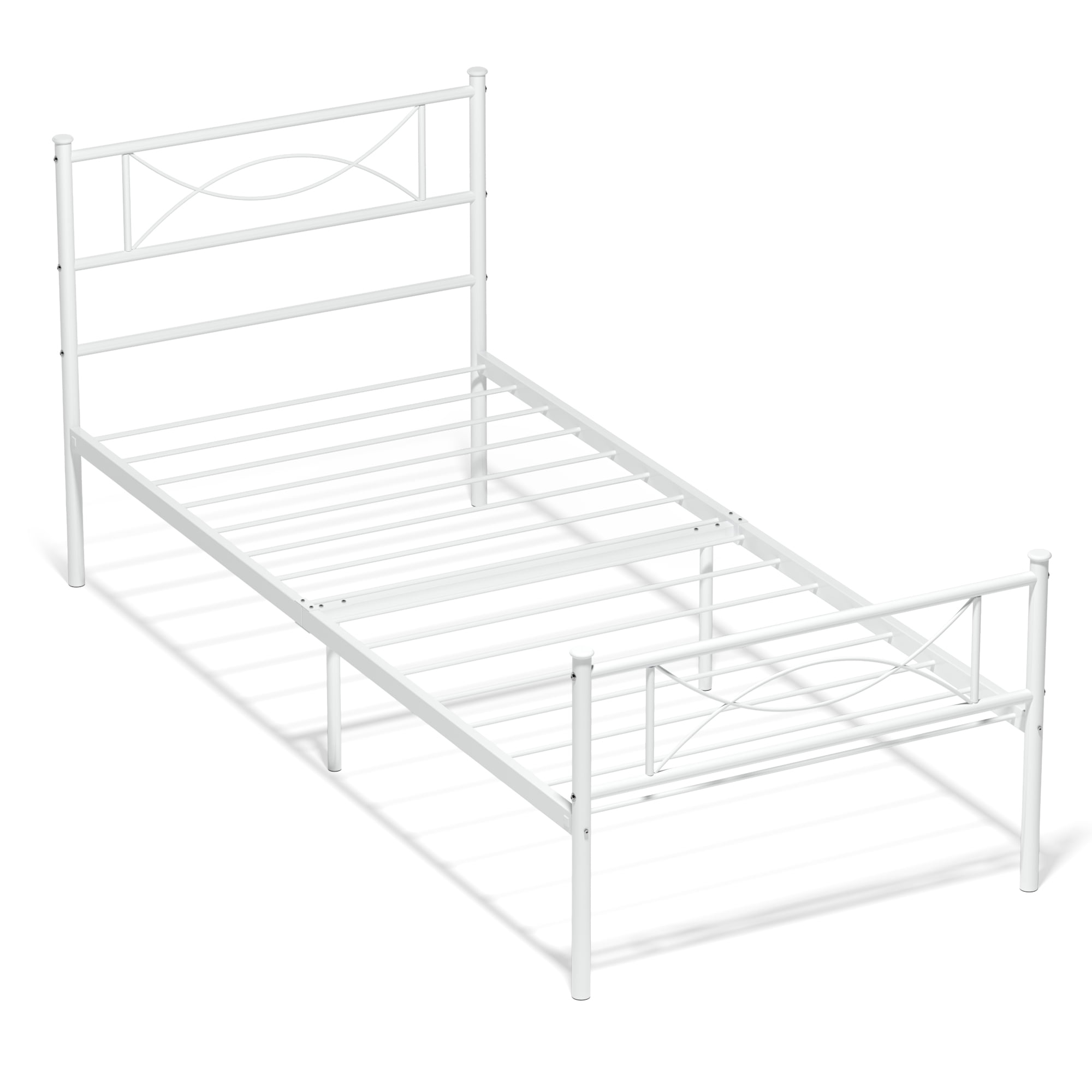 Strong steel tubing construction and Full-length provide safety comfortable sleep environment This Metal Bed Frame is a tasteful welcome to any bedroom 12.5″ high with approximately 11″ of clearance under the frame Creative extra under-bed storage space, save room Sturdily constructed, the bed frame includes metal slats and supporting legs for added support The bed frame comes flat-packed in one box, assembly required, easy and quick set-up Comes with two sturdy and sophisticated headboards The metal foundation is naturally resistant to bed bugs Environmental durable material allows this metal bed frame a longer useful life Twin Size: 77.5″ x 36″ x 34.8″ Weight Capacity Twin: 220 lbs Package Includes: 1 x Metal Bedframe 1 x Instruction for installation 1 x Polybag 1 x Screw Set 1 x Components