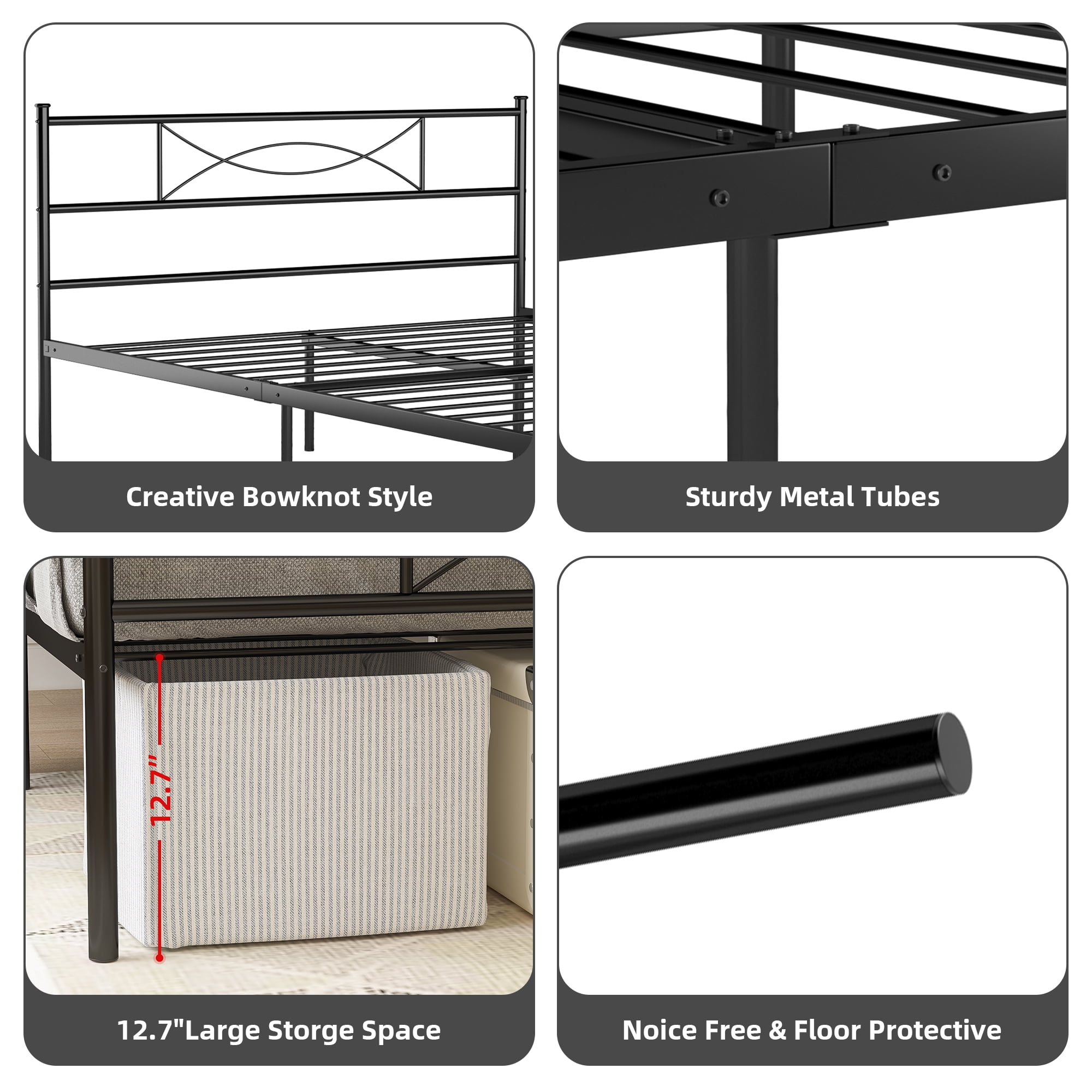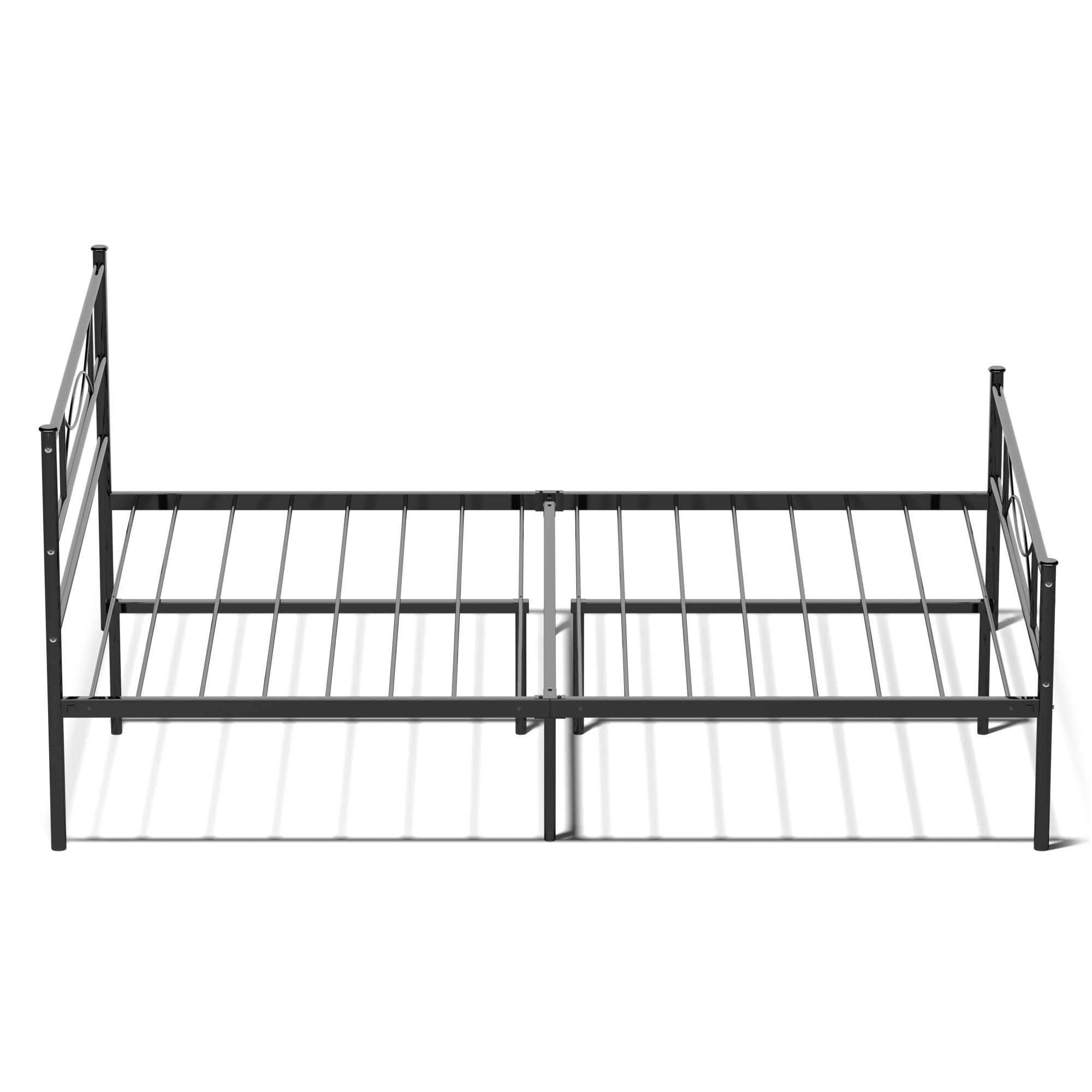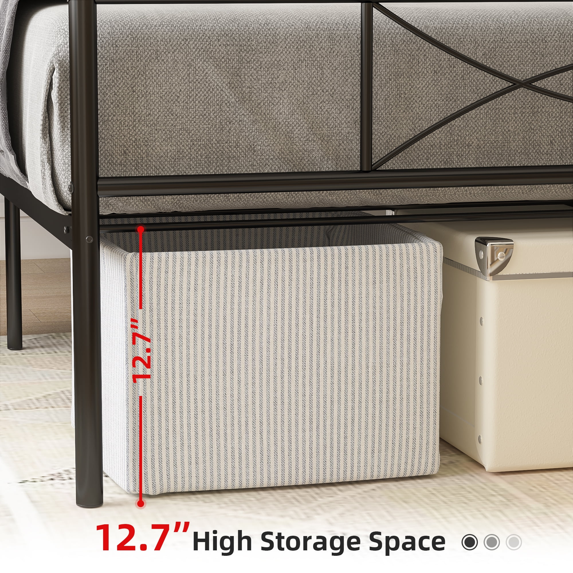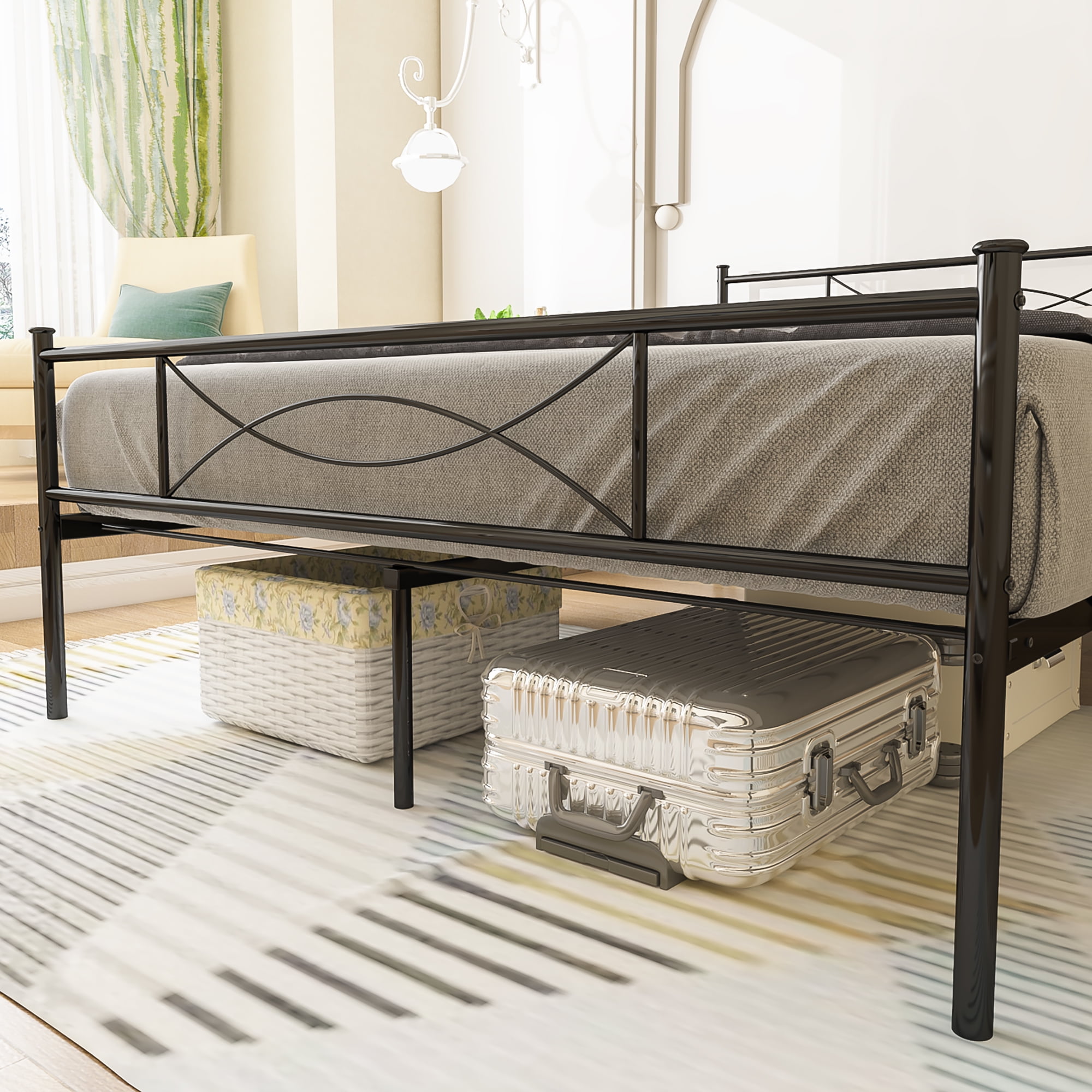 The modern design of the metal bed creates a warm and elegant feel to your sweet home. This bed frame with headboard features steel slats that provide strong support for your memory foam, hybrid, or spring mattress. A platform bed is 34.7 inches high with clearance under the frame for valuable under-bed storage. A Mattress is not included. The quick platform bed with headboard provides stylish and strong support for your mattress without the need for a box spring. 12.5 inches of clearance under the frame for valuable under-bed storage space multiple points of contact to the floor for level support/sturdy steel structure protects your mattress by providing strong level support.