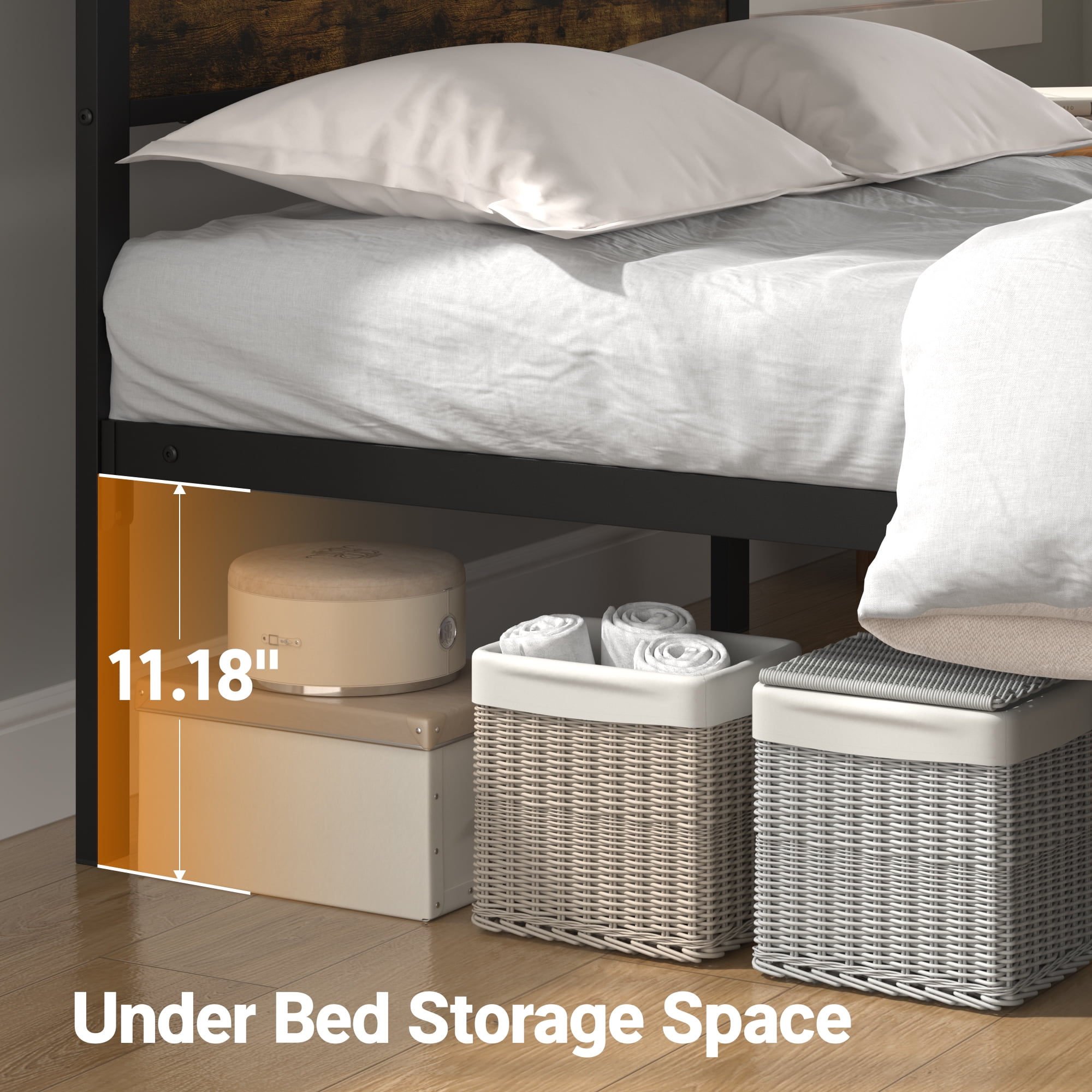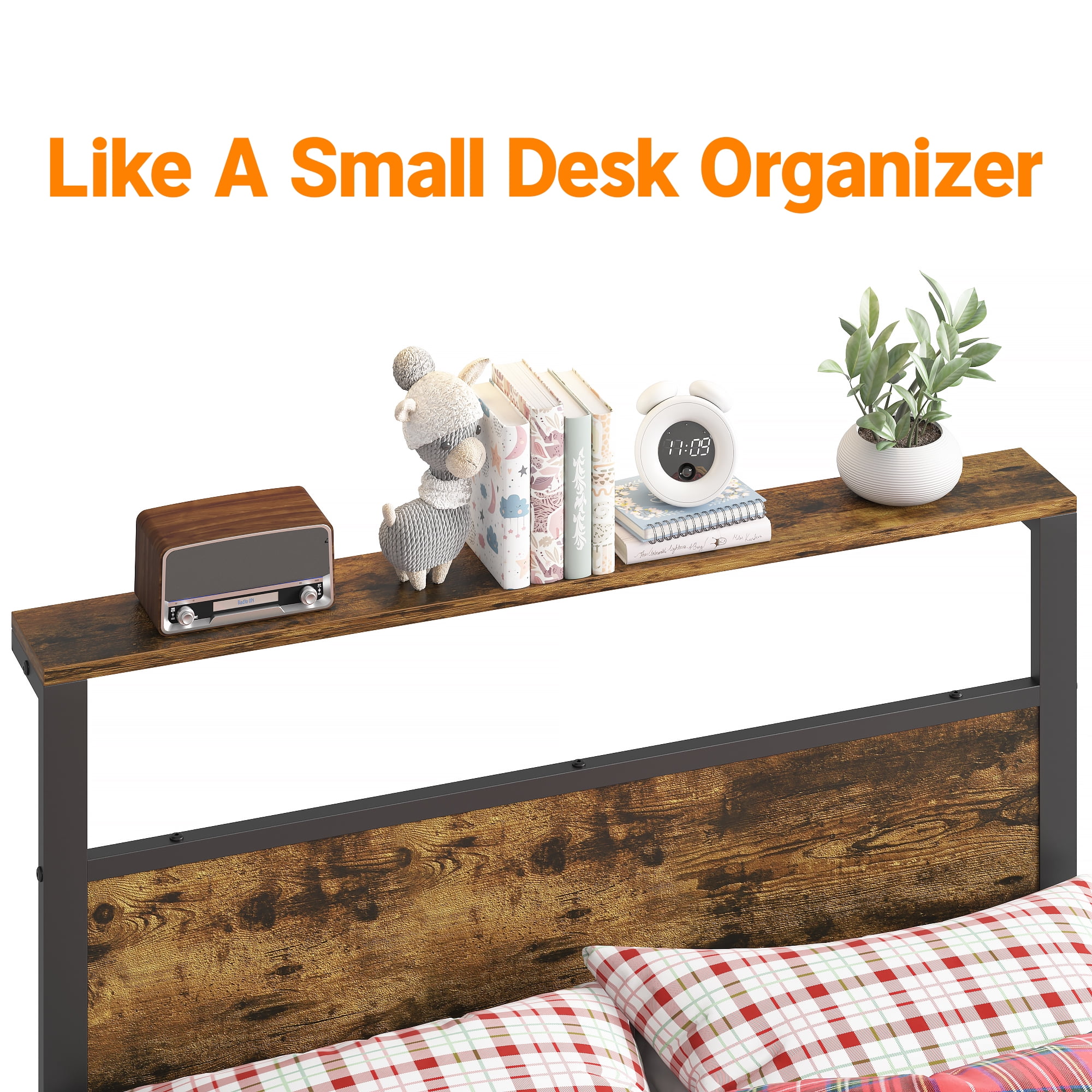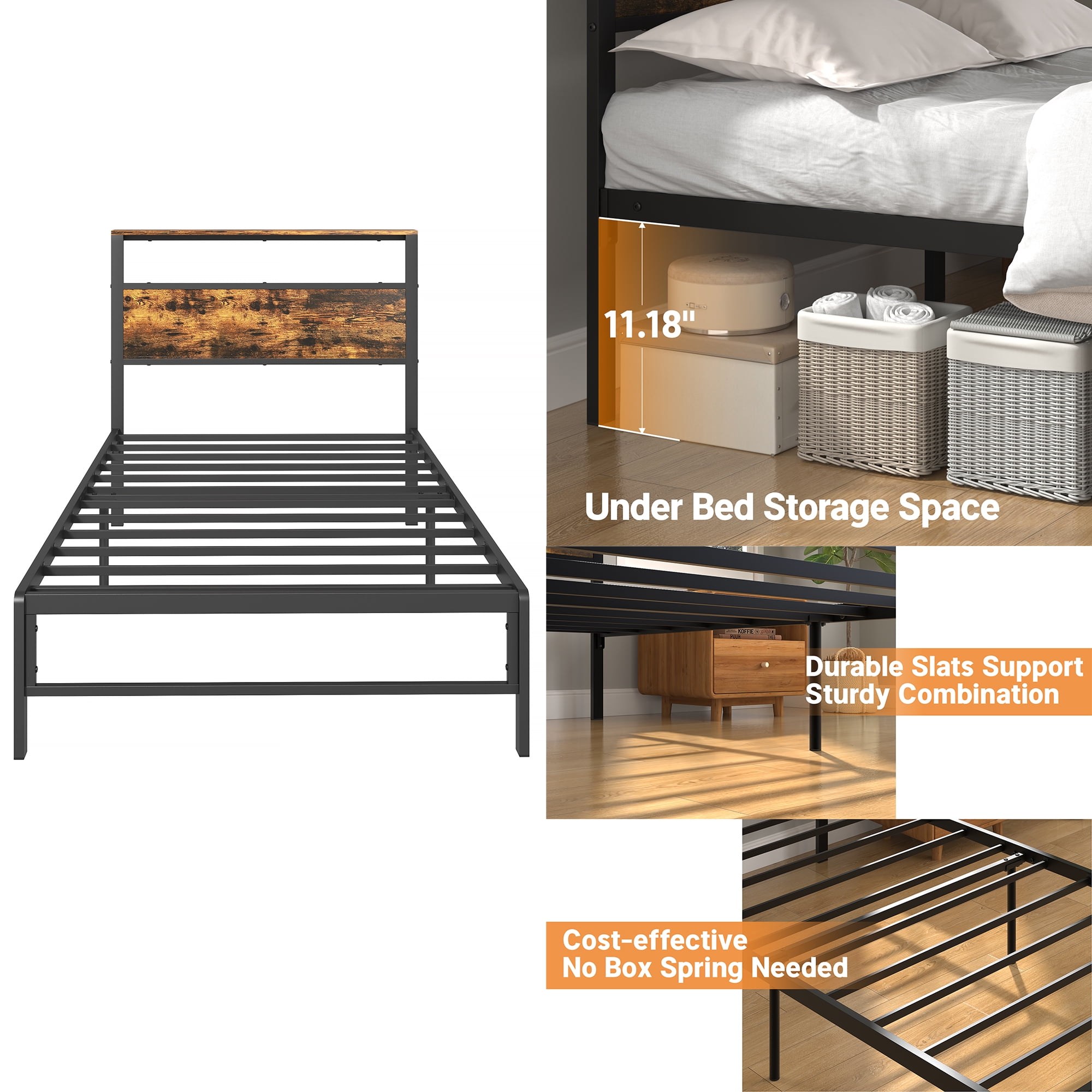 Features: 1.Modern Industrial Style Bed:The mix of black metal frame and brown wood pattern brings both unique style and versatility to bedrooms with different decor styles. 2.Sturdy and Stable: The bed frame is made of a sturdy metal frame and selected metal slats, reinforcing the sturdiness and durability of the bed structure, and providing better support for the mattress and capacity up to 600lbs. 3.Unique Headboard Storage:The kids Bed frame comes with a 3.9-inch width open storage shelf headboard for added convenience for organizing your small items such as phones, books, plants, clock etc. 4.Efficient Space Utilization: Leaving 11.8 inches of space under the bed provides additional storage space for large items or miscellaneous items, no-spring bed frame and abundant storage space will bring you a clean and tidy room. 5.Stable Leg Design:The legs of the bed are designed with unique reinforced rounded corners, which is sturdy and beautiful and avoids the collision, adding a unique charm to your bedroom. 6.Easy Assembly:The bed comes with an installation manual and a full set of necessary hardware, which allows you to do the installation yourself quickly. 7.Ideal Gift: This is the perfect gift for your new home or add this gift bed frame to your school children. This bed frame will soon give you a good night’s sleep! Specifications: Size: Twin Size Material: Sturdy Metal, MDF Board Color: Caramel Brown Product Size (Twin): 80.7 x 39.61 x 38.54 inch (L x W x H) Package Size (Twin): 46.06 x 16.14 x 3.27 inch (L x W x H) Package Weight (Twin): 37.66lbs Packages Included: 1 x Metal Twin Bed Frame with Storage Headboard 1 x Install Manual 1 x Screw Set 1 x Components