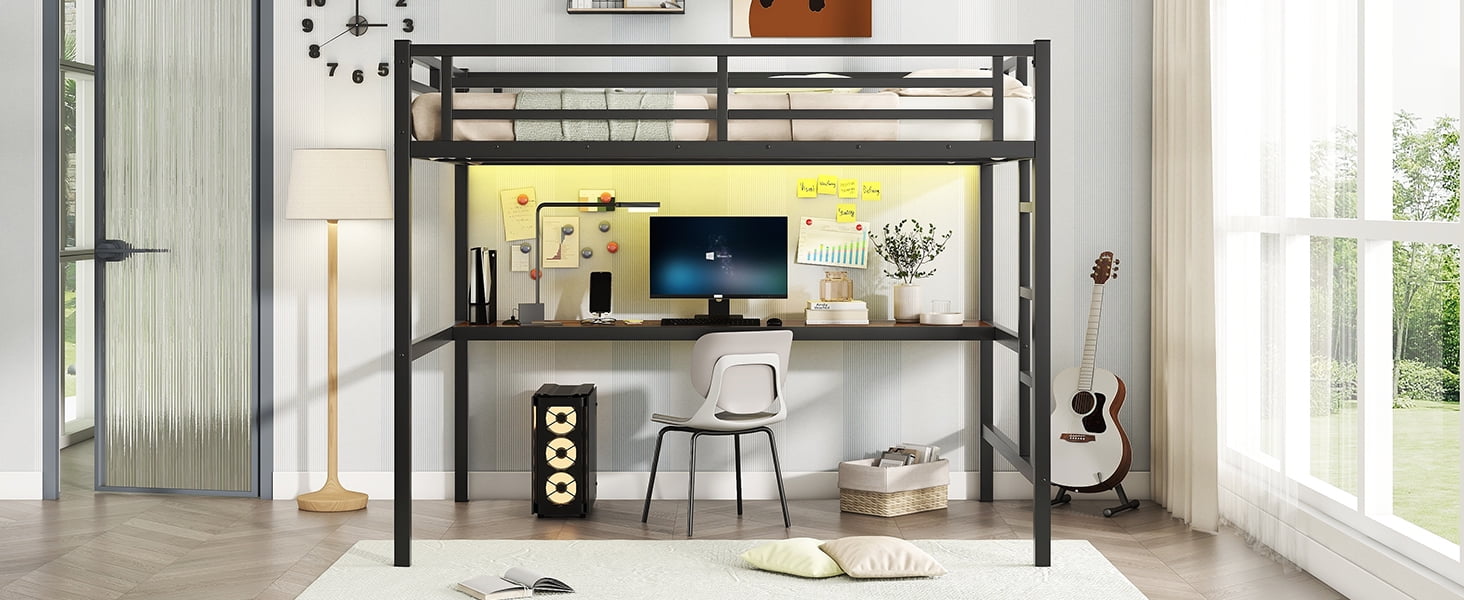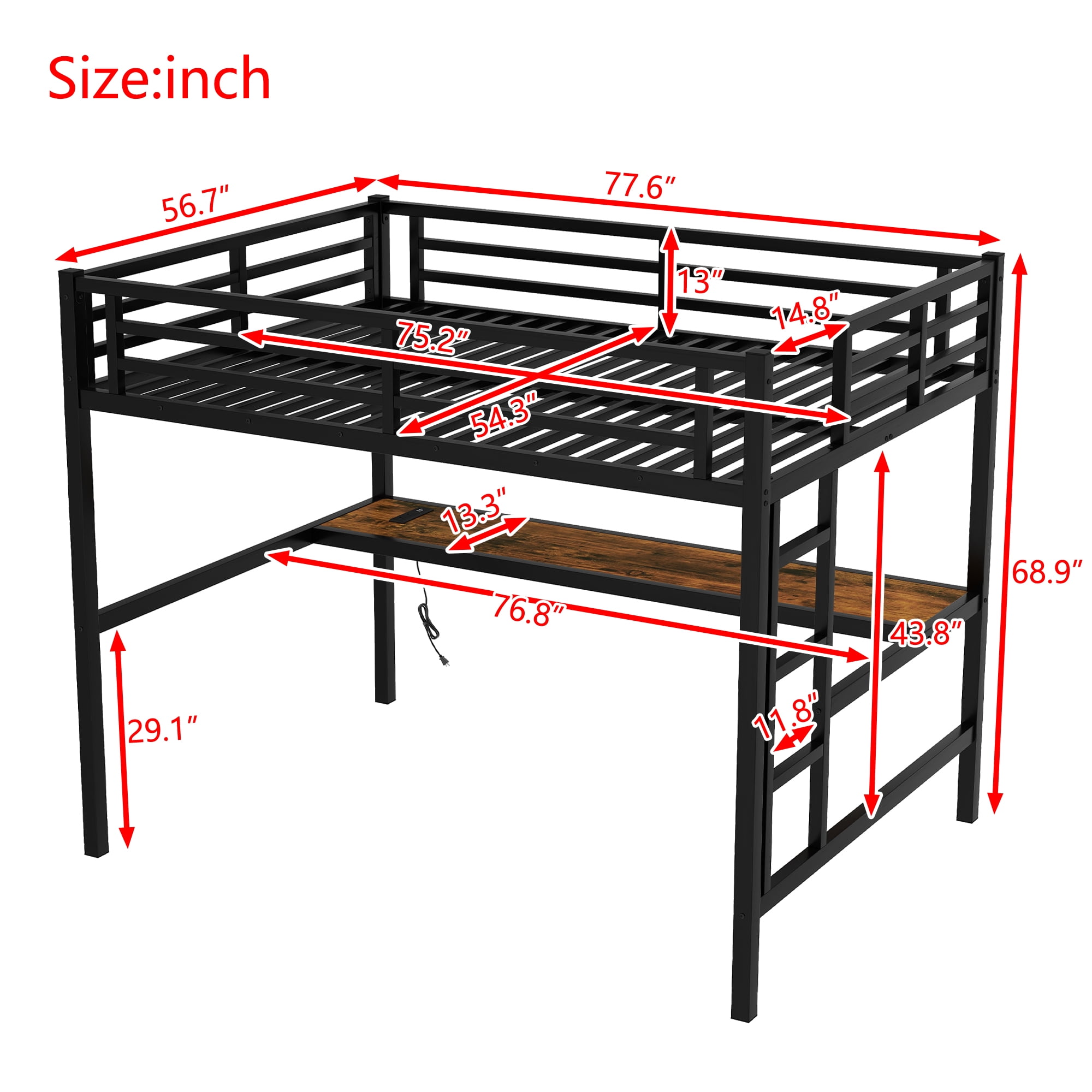 Loft Bed with Desk The loft bed can be configured as two separate spaces.Not only can meet the need for rest, while for work or leisure to provide more personal space. This loft bed comes with a desk used for work or study and a power output in front of the desk,creates a productive, simple work,study or gaming area for your child. Perfect for space-saving needs. Loft Bed with USB and LED The loft bed’s desk comes with a USB charging station for charging electronics that is convenience to your daily life.The DIY smart light comes with a variety of light modes, so feel free to design your light show and create a dreamy bedroom atmosphere. [ Sturdy Metal Frame Made of solid metal frame, the loft bed is durable and reliable for you bedroom.All four sides of the upper bed are equipped with protective guardrails to prevent little ones from accidental falls to keep them safe and secure during play or sleep. Security certificate protection This loft bed has passed the children’s product certificate (CPC) test to protect your child from accidental injuries. Easy Assembly This Metal Loft Bed comes with clear instructions that will guide you through all steps. Each part is numbered and has a clear manual, with all tools included for easy installation. Overall Product Dimension:77.6″L x 56.7″W x 68.9″H