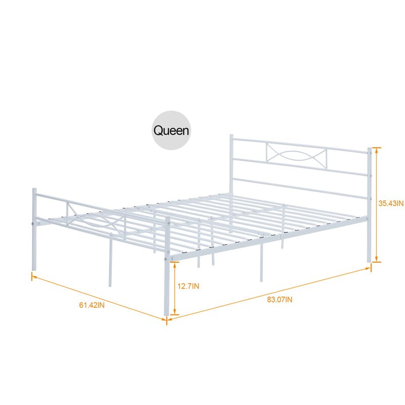 Features: Sturdy Construction Full Bed Frame – This full bed frame in good quality metal frame Strong steel tubing construction and Full-length guardrails provide a safe and comfortable sleep environment. Heavy Duty Support – The entire foundation is made from strong steel with 10 independent support legs making bedframes pretty durable. Noise Free – The center legs support not only improve the weight capacity of the bed greatly but also ensures the stableness to help you get a noise-free sweet night’s sleep. Easy to Assemble – It is easy for you to install the metal platform bed frame in a short time with all the accessories and instructions are packaged well in the product parcel. Headboard and Footboard Design – Our full metal bed frame is designed in an elegant set of headboards and footboards. Besides that, the boards could keep the mattress on the frame from sliding. No Box Spring Required – The mattress can be put on the slates directly, ideal for sleepers looking to break away from a bulky box spring. Accommodates a full or queen-sized mattress. Ample Under Bed Storage – 12.7-inch ample under bed storage space which can make it convenient to store boxes, toys, books, quilts, shoes, etc. It saves your space and makes your bedroom clean and tidy. Vivacious Bedroom Decoration – Add a touch of vivacious to your or your bedroom with this delicate detailing steel bed frame and make the most out of your bedroom space with this Multi-functional metal Bed. Specifications: Material: Durable Steel Bed Dimension: 83.07 x 61.42 x 35.43 inches Headboard Height: 34.7 inches; Footboard Height: 23.8 inches Capacity: 600 lbs Package Size: 62 x 10 x 5 inches Package Weight: 50 lbs A high headboard designed for comfortable relies on Package Included: 1 x Queen Size Metal Bedframe 1 x Instruction for Installation 1 x Poly Bag 1 x Screw Set