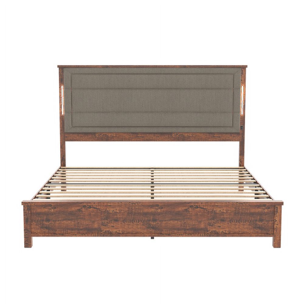 Yoneston Queen Size Bed Frame with Charging Station and LED Lights, Heavy Duty Platform Bed with Dark Gray Linen Upholstered Headboard, Brown