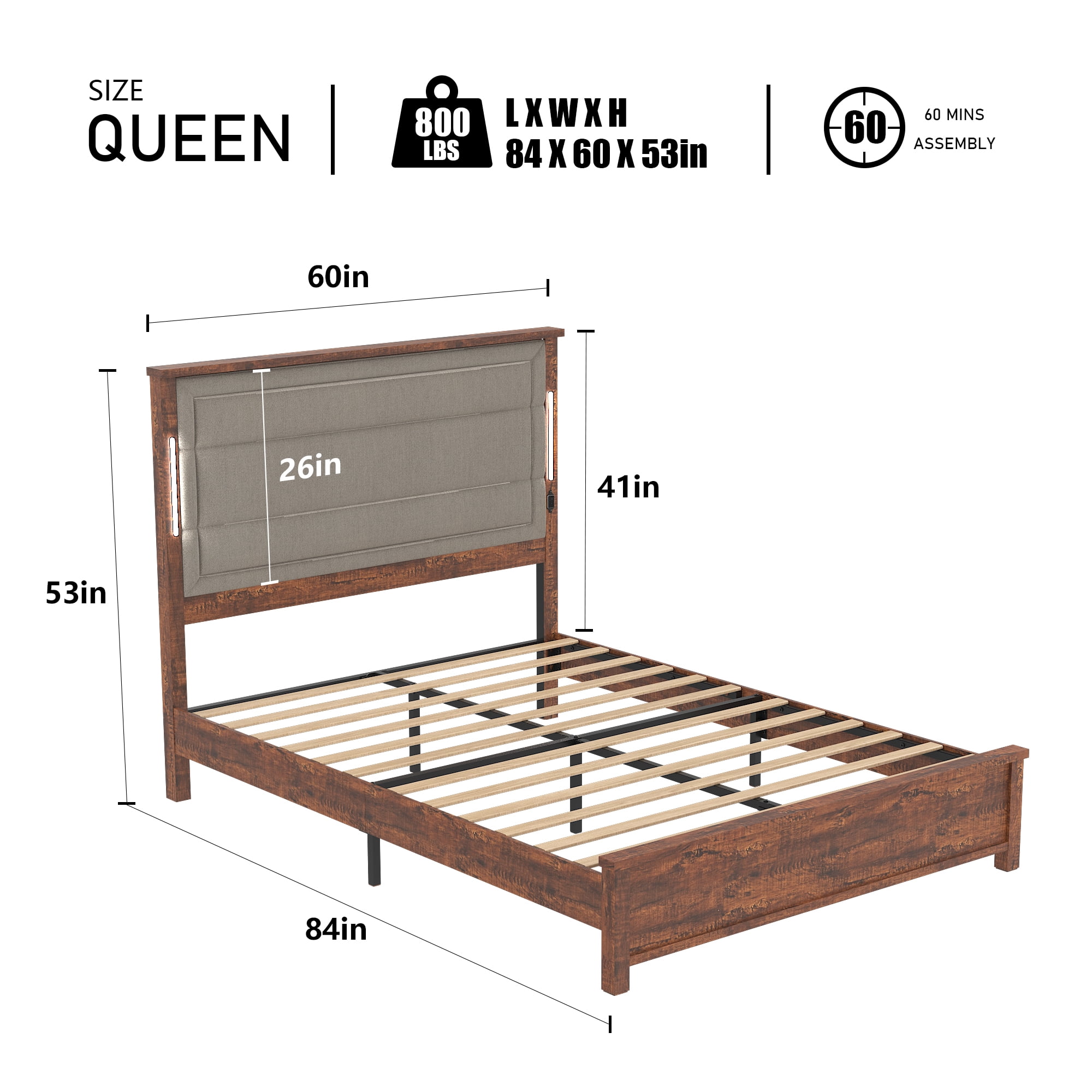 Features: 【Modern Design Style】: This wood bed with headboard combines clean lines design to deliver a natural freshness in your bedroom. 【53.15″ Tall Headboard】: Dark Gray Linen handcraft headboard of wooden bed frame adds a luxurious and sophisticated feel to your bedroom. 【Sturdy Wooden Structure】: Platform bed frame is constructed of durable MDF, bringing the beauty of natural wood grain into your home. 【Charges & Light】: The storage headboard of this bed features 1 USB ports & 1 Type C, Easily charge your devices, bed frame boasts an impressive Smart LED light bar headboard,Finger touch the light bar, the light bar full light, finger long press the light bar, the light bar brightness can be adjusted. 【No Box Spring Needed】: Solid and narrow-spaced wooden slats support this queen size bed frame to work with the mattress eliminating the need for a box spring. 【Easy Assembly】: The bed frame is quick and easy to assemble, includeing detailed instructions, assembly tools, and numbered parts. Specifications: Product Type: Queen Size Platform Bed Frame Main Material: MDF+Metal Color: Brown with Dark Gray Linen Product Assembled Size (inch): 84.76”L x 60.91”W x 53.15”H Product Weight (lbs.): 92 Package Size (inch): 64.57”L x 13.58”W x 10”H Package Weight (lbs.): 100 Packages Included: 1 x Queen Size Platform Bed Frame 1 x Assembly Kit 1 x Manual