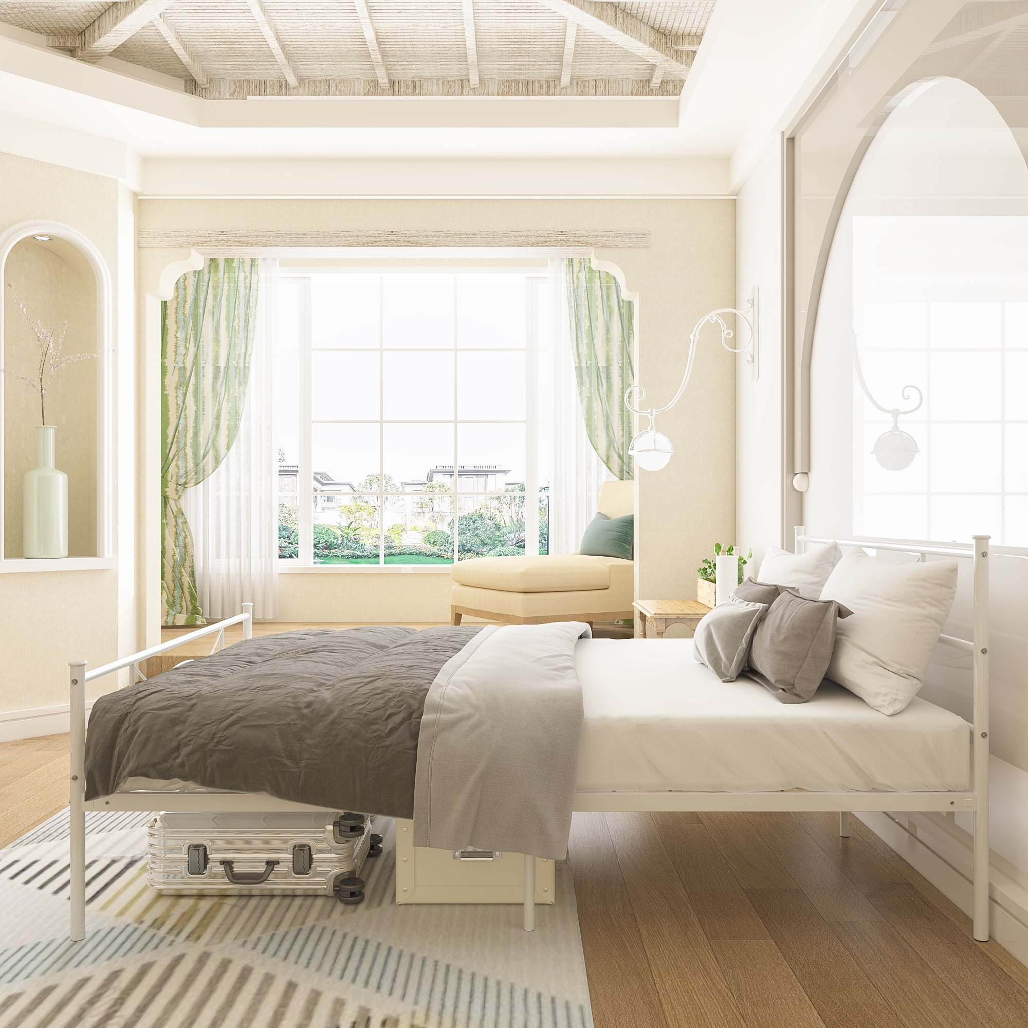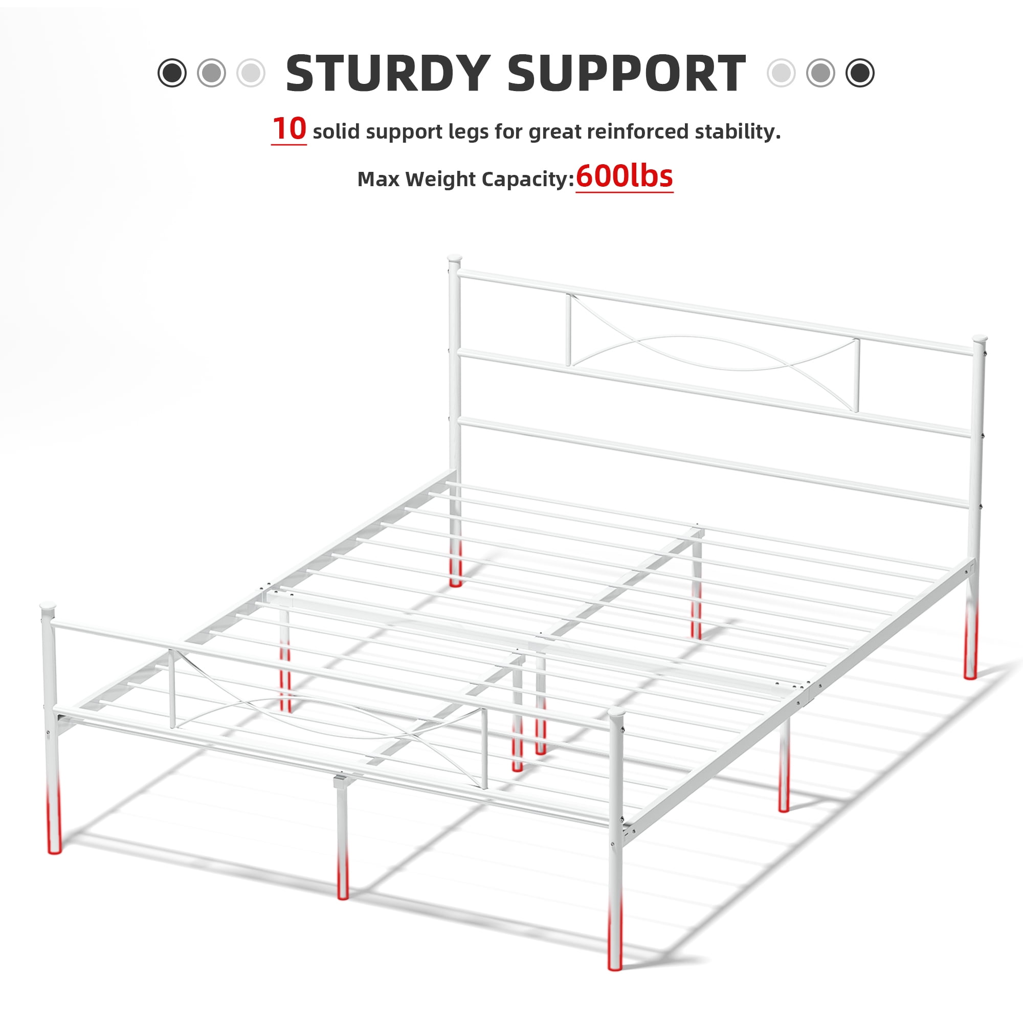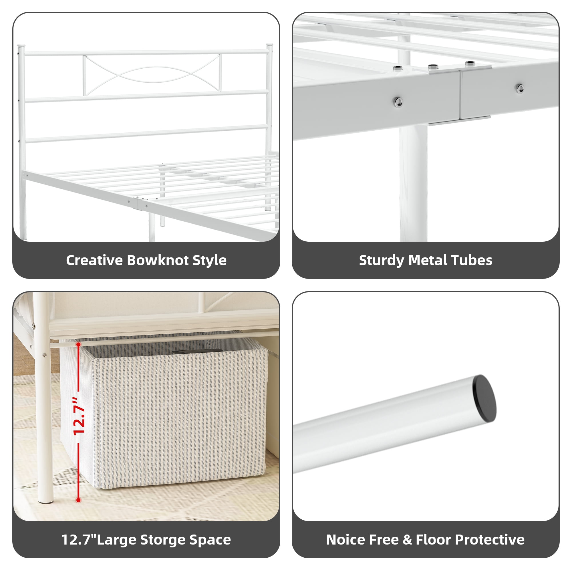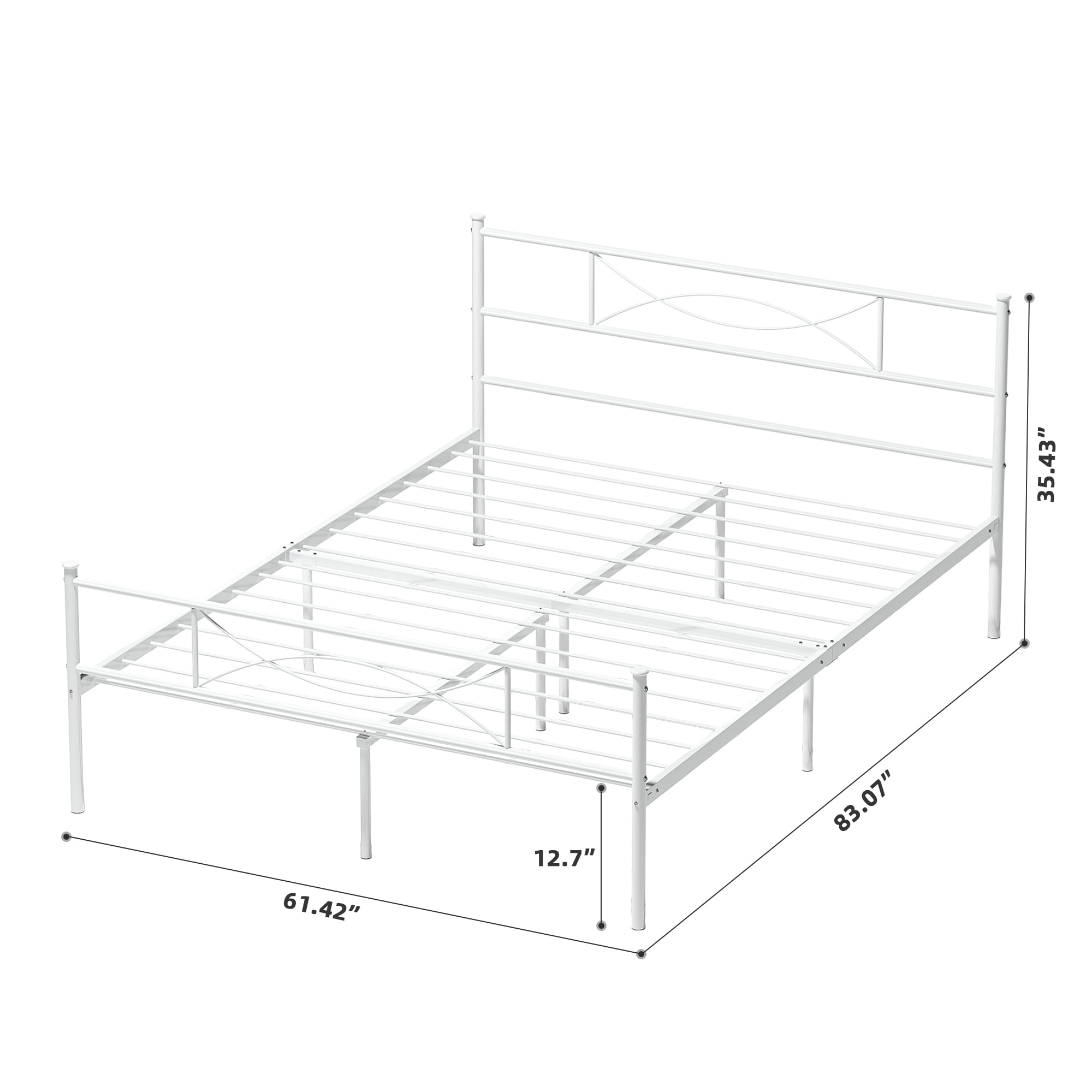 Features: Added Style: Combining clean lines, a matte white metal frame, and modern-style patterns result in a platform bed with a headboard and footboard that exudes the classy character and touch of vintage style your bedroom is yearning for. Sturdy and Stable: This bed frame built with 10 legs and heavy-duty steel slats, adds better supports to your mattress. Max weight capacity up to 600 lbs. The sturdy construction also makes falling asleep more comfortable at night and turning over without any noise. Ample Storage Space: There are 12.5 inches of storage space for metal platform metal bed frame. It will provide enough storage space for you to tidy your sundries, toys, or something else and keep your bedroom look more neat and clean. No Box Spring Needed: This sturdy bed frame is the perfect platform to hold your standard queen size mattress and eliminates the need for a box spring. Easy to Assemble: The bed frame comes flat-packed in one box for easy home assembly. All parts with clearly label, easy to assemble with very clear instructions for installation. A Perfect Gift: The perfect gift for those who need a beautiful bed frame or want to upgrade the current bed frame. Exquisite wedding gifts can be used for birthdays, wedding beds, holidays or special anniversary gifts. Specifications: Material: Metal Size: Queen Color: White Product Size: 211*155*90 CM / Approx. 83″ x 61″ x 35.4″ Product Weight: NW:19.00 KG GW:20.00 KG. Package Size: 62″ x 10″ x 5″ Package Weight: 50lbs Package Inlcudes: 1 x Metal Bed frame 1 x Instruction For Installation 1 x Poly Bag 1 x Screw Set 1 x Components