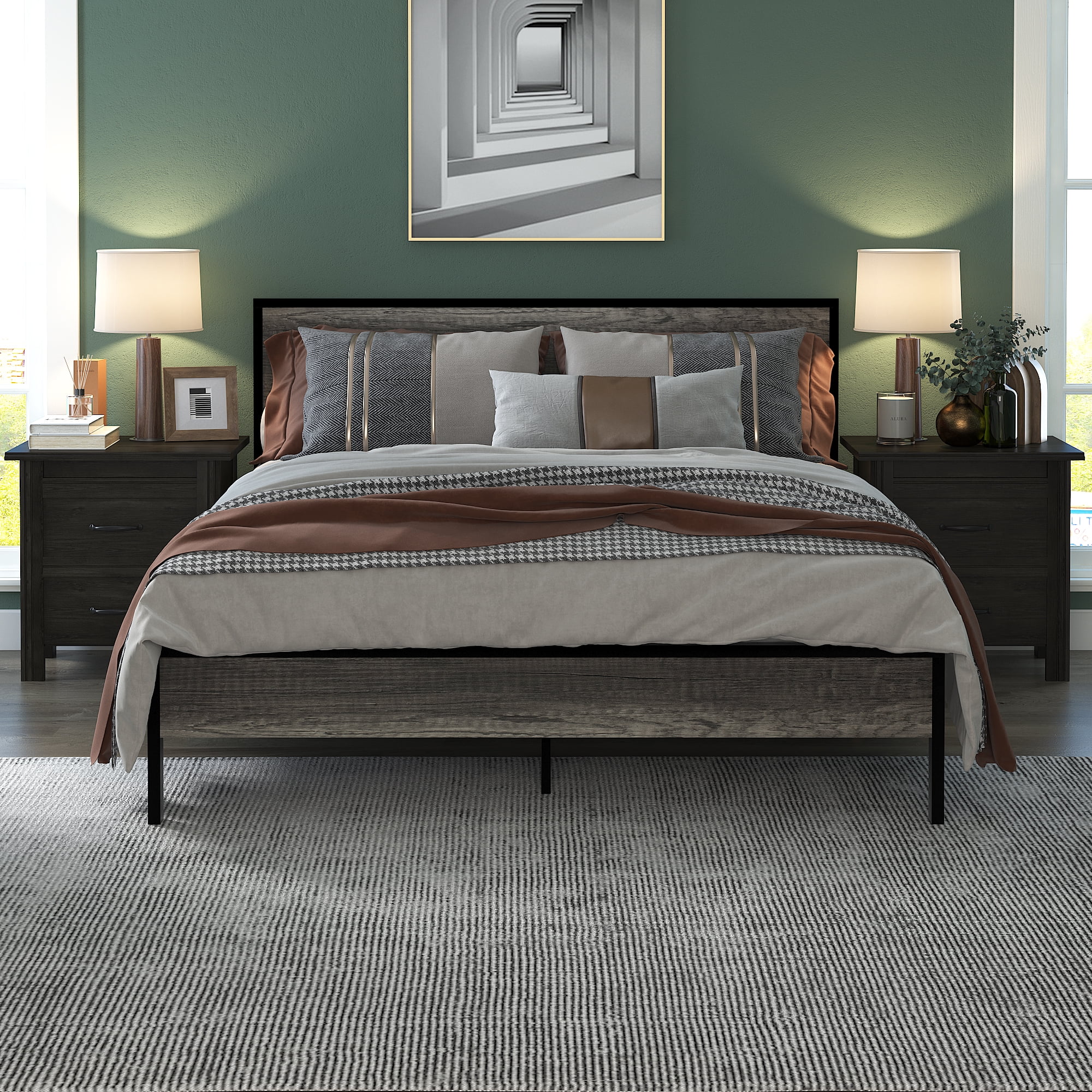 Yoneston Retro Queen Metal and Wood 14″ Platform Bed with Headboard for Adults, Heavy Duty Metal Bed Frame with Metal Slat Support, Black Oak