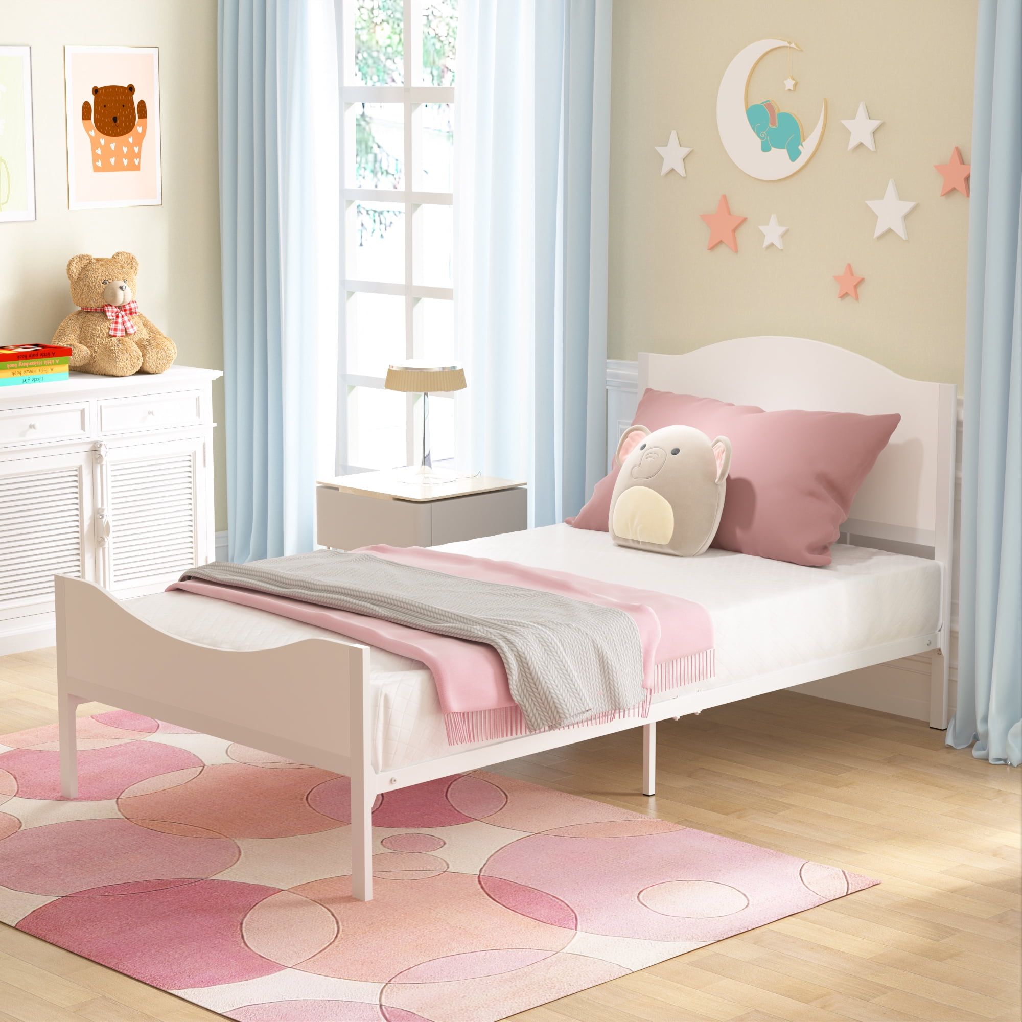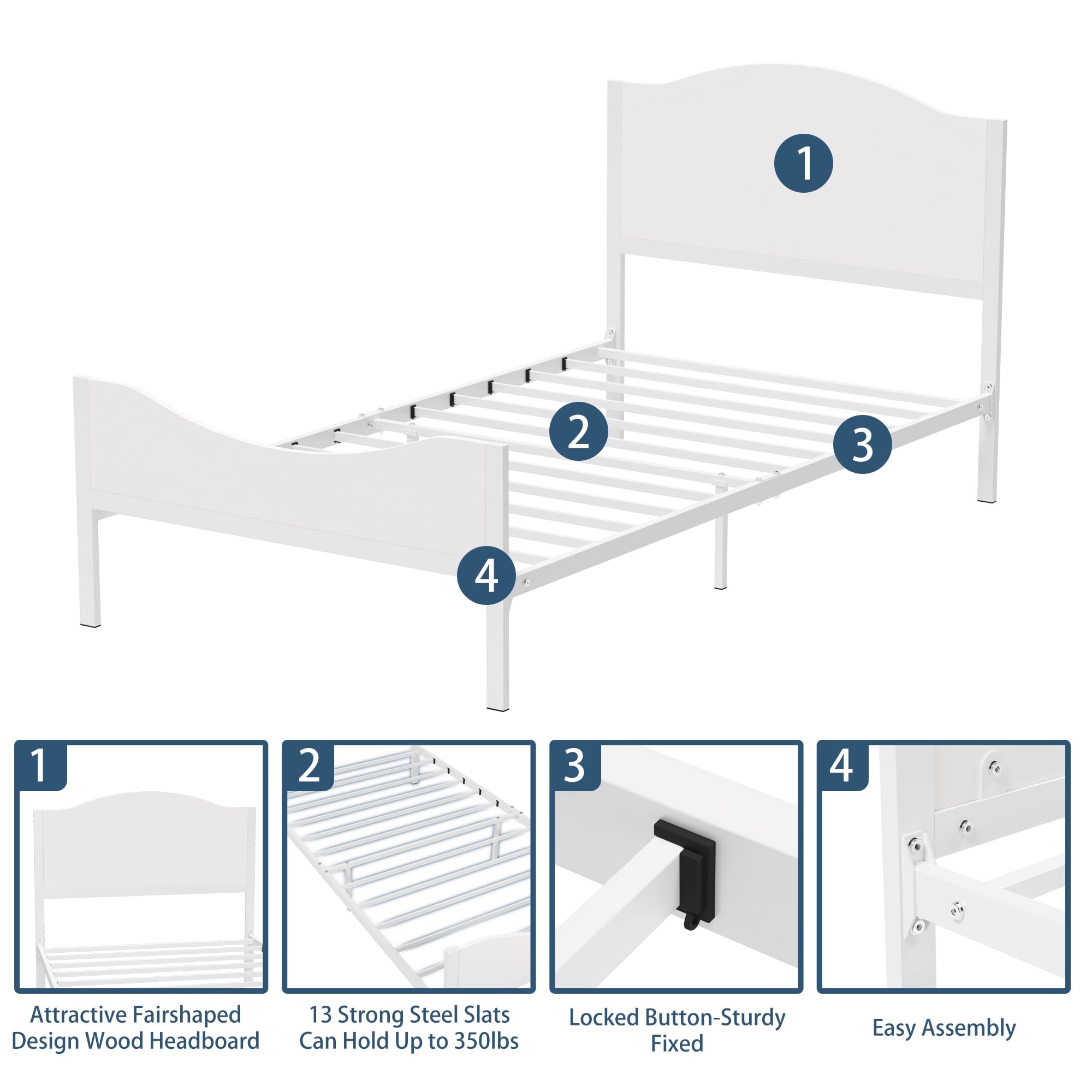 Yoneston Twin Kids Metal Platform Bed Frame with Wood Headboard for Children, Teens & Adults, No Box Spring Needed, White