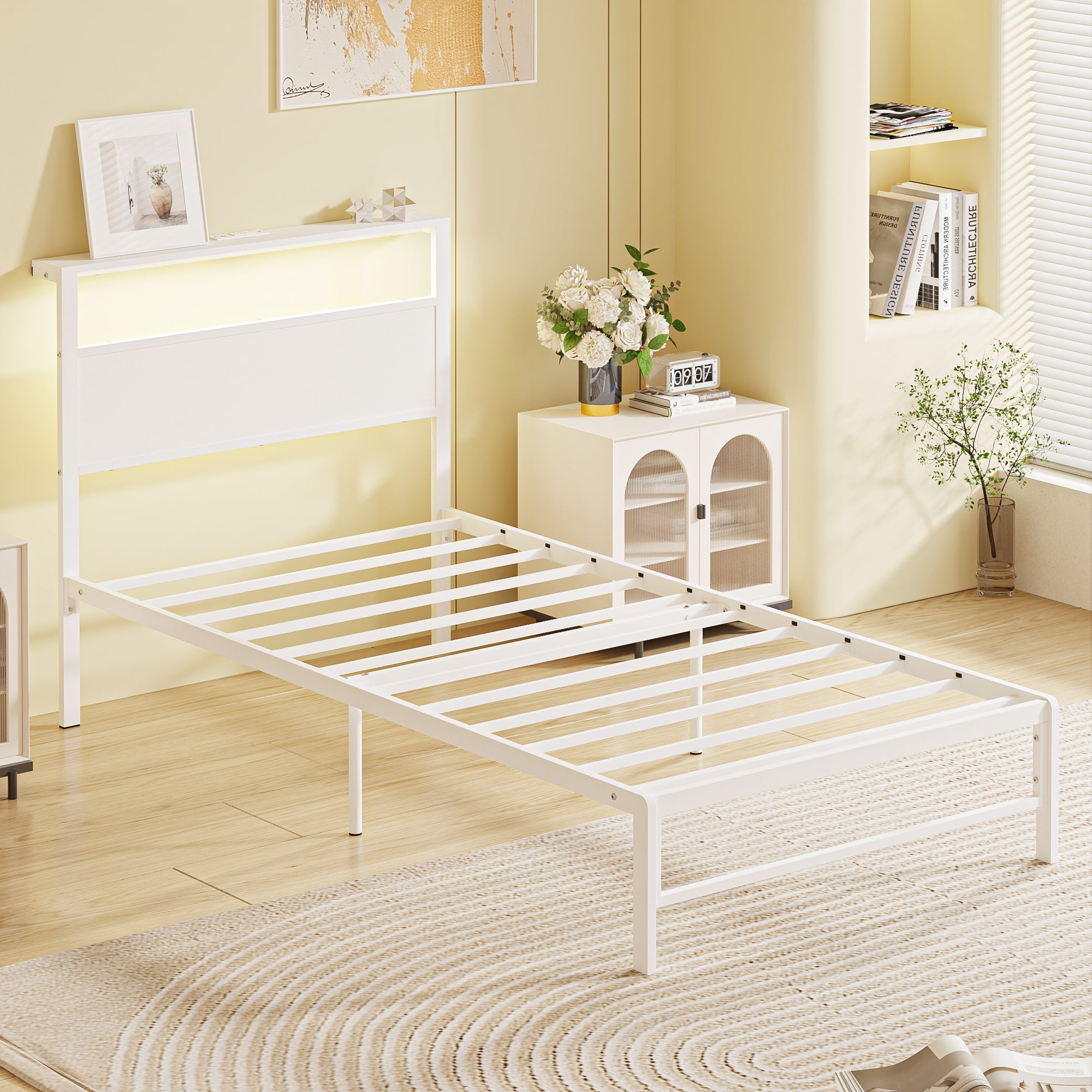 Yoneston Twin Metal Platform Bed Frame with LED Light and USB Port Charging Station Storage Headboard for Kids Boys Girls Adults, White