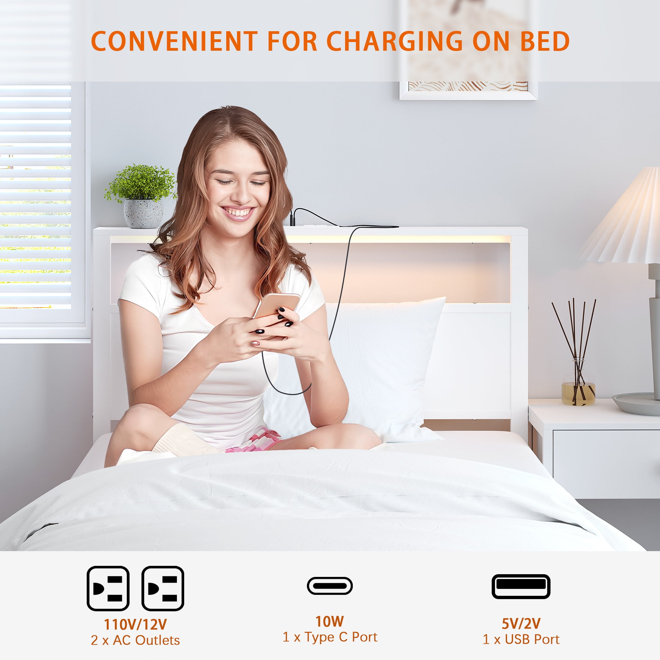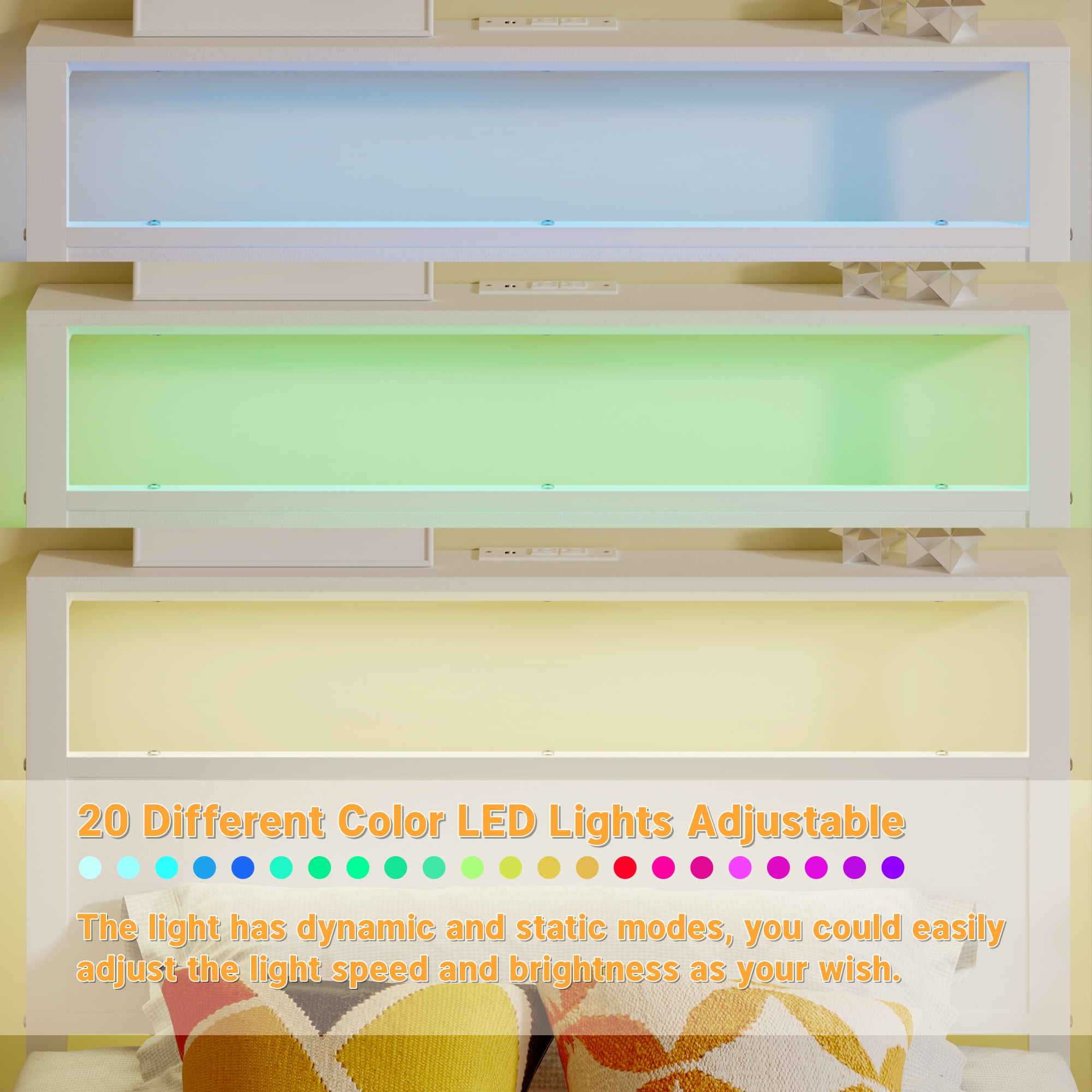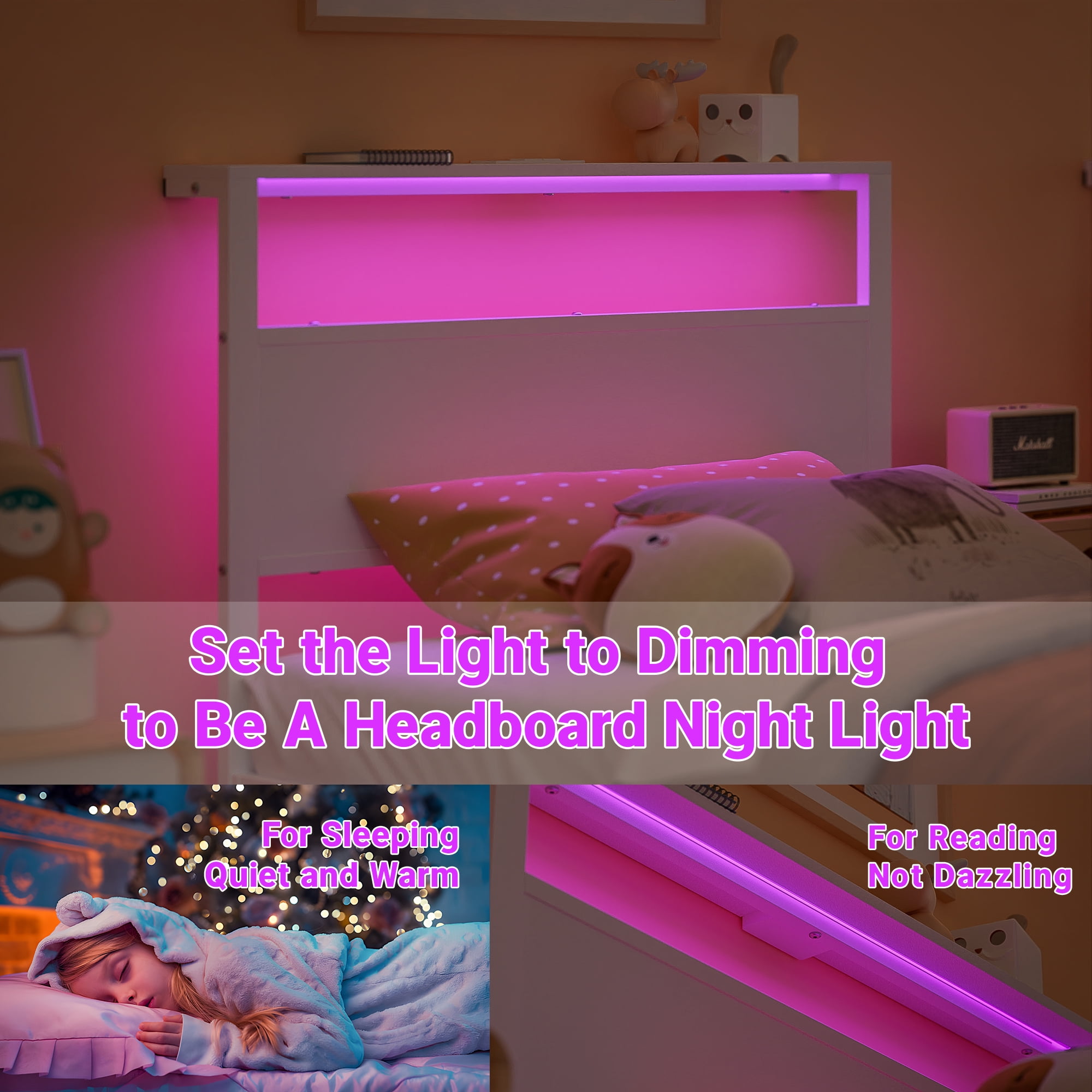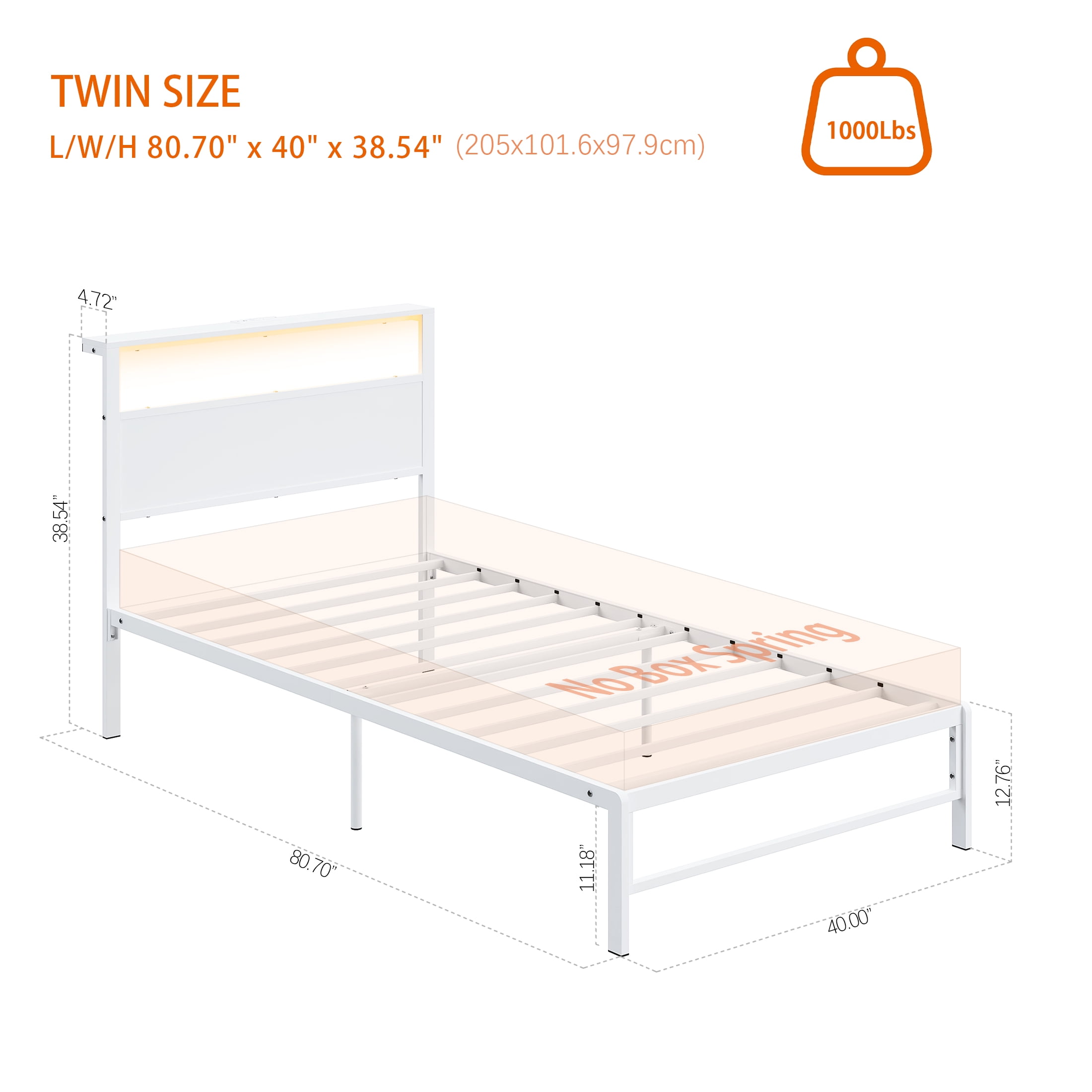Features: STORAGE HEADBOARD SHELF – Our twin bed frame with storage headboard shelf perfect to hold your phone, clock, glasses, books, headphone, decorations. Just like a small nightstand. CHARGE AT ANY TIME – The Kid’s bed frame is built-in with 1 USB Ports & 1 Type C Port & 2 Standard Plug Outlets, solves the low battery issue for your electronics while you’re comfortably lying in bed. MULTI-FUNCTION RGB LED LIGHTS – The headboard featured RGB LED lights create a relaxing ambiance for your night. With 20 color changes, 21 dynamic modes, 8-speed levels adjustment, and 8 brightness modes to customize your loved bed lights and enjoy the sweet sleep atmosphere. DURABLE & STURDY – The bed frame is made of a sturdy metal frame and selected metal slats, reinforcing the sturdiness and durability of the bed structure, and providing better support for the mattress and capacity up to 1000lbs. EASY TO ASSEMBLE – The bed comes with an installation manual and a full set of necessary hardware, which allows you to do the installation yourself quickly. NOICE FREE – Anti-slip strips between the bed slats are designed to help eliminate noise. No box spring needed; Corner guards suitable for the bed frame size can prevent sharp collisions. UNDER-BED STORAGE – 11.18-inch ample under bed storage space which can be convenient to storage sundries, boxes, toys, books, quilts and shoes etc. It’s saved your space and makes your bedroom clean and tidy. IDEAL BEDROOM GIFT – This sturdy kids metal platform bed frame with LED & outlets storage headboard is the perfect gift for your new home or add this gift bed frame to your school children. This bed frame will soon give you a good warm and romantic night’s sleep! Specifications: Size: Twin Size Material: Sturdy Metal,Particle Board Color: White Capacity: 1000lbs Product Size: 80.7 x 40 x 38.54 inch (L x W x H) Package Size: 50 x 16.14 x 3.27 inch (L x W x H) Package Weight: 39.02lbs Packages Included: 1 x Twin Bed Frame with Storage Headboard and LED Light and Charging Station 1 x Remote Controller 1 x LED Light Strip 1 x Install Manual 1 x Screw Set 1 x Components