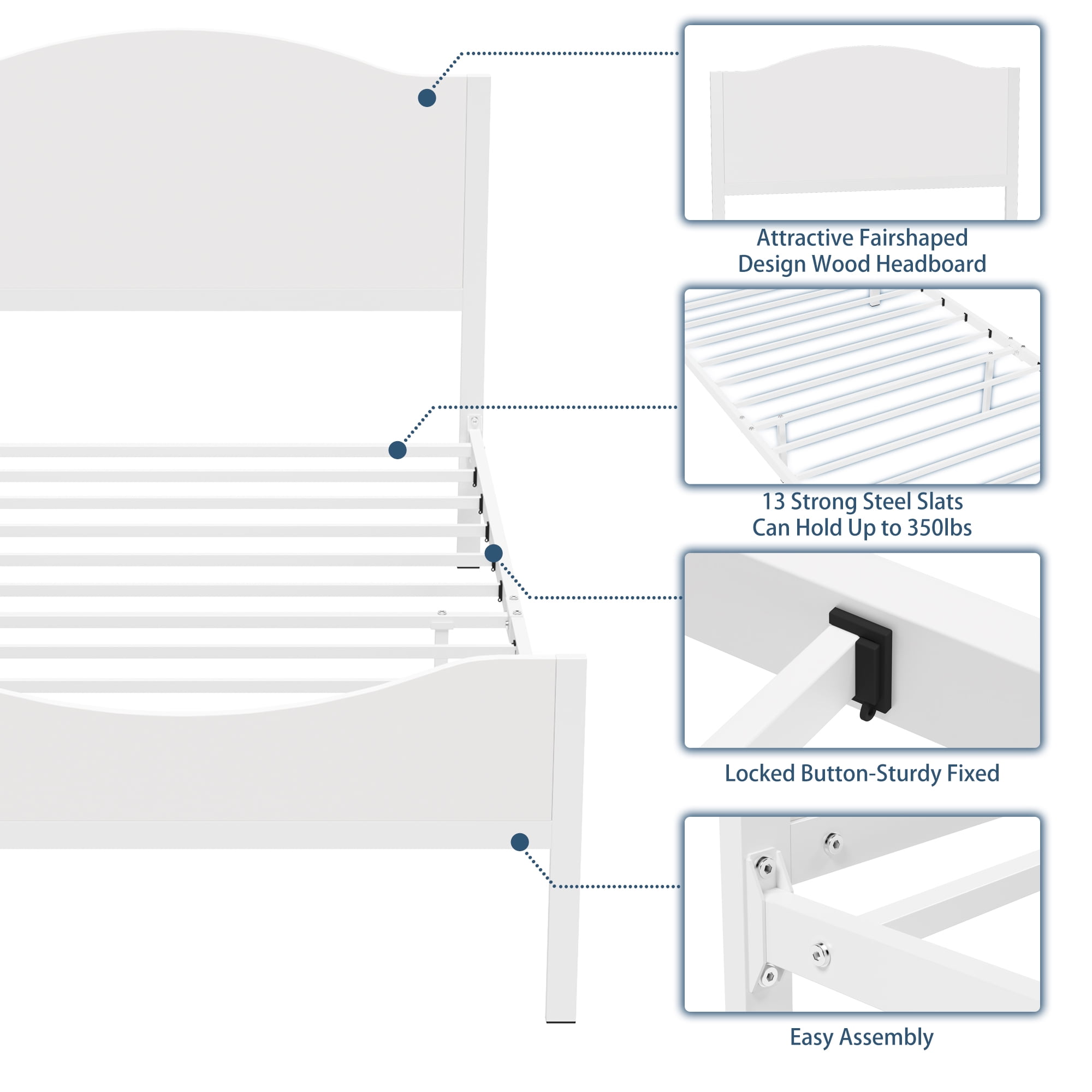 Features: HEALTH AND COMFORT – Our metal bed frame for kids made of health MDF Board and pure steel, it’s clean, no odor, give your child a comfortable sleep and spend their sweet dreams with them. STRONG AND DURABLE – The simple yet elegant teen’s bed frame is sturdy with 13 reinforced slats that support up to 350lbs, and ensures air moves freely around your mattress to keep it fresh for years to come. NO BOX SPRING NEEDED – The mattress can be put on the slates directly, ideal for sleepers looking to break away from a bulky box spring. EASY TO ASSEMBLE – It is easy for you to install the metal bed frame in short time with all the accessories and instructions are packaged well in the product parcel. BEST BEDROOM GIFT – Best Gift for Birthday, New House, Christmas, and Thanksgiving. Perfect for Bedroom, Apartment, School Dormitory, Hotel, Kid’s room. WORRY-FREE WARRANTY – Comes with 180-day extending warranty for any quality issue, please feel free to contact us no matter what problem you meet, our customer service will help for all your concerns. Specifications: Material: MDF Board, Durable Steel Bed Dimension: 76.97 x 41.54 x 8.46inches Headboard Height: 37.64inches; Footboard Height: 20.47inches Capacity: 300-350lbs Package Size: 44.1x 20.48 x 4.14 inches Package Weight:47.4lbs(21.5kg) No box spring needed High headboard designed for comfortable rely on Package Included: 1 x Twin Bed Frame with Wood Headboard 1 x Instruction 1 x Screw Set 1 x Components