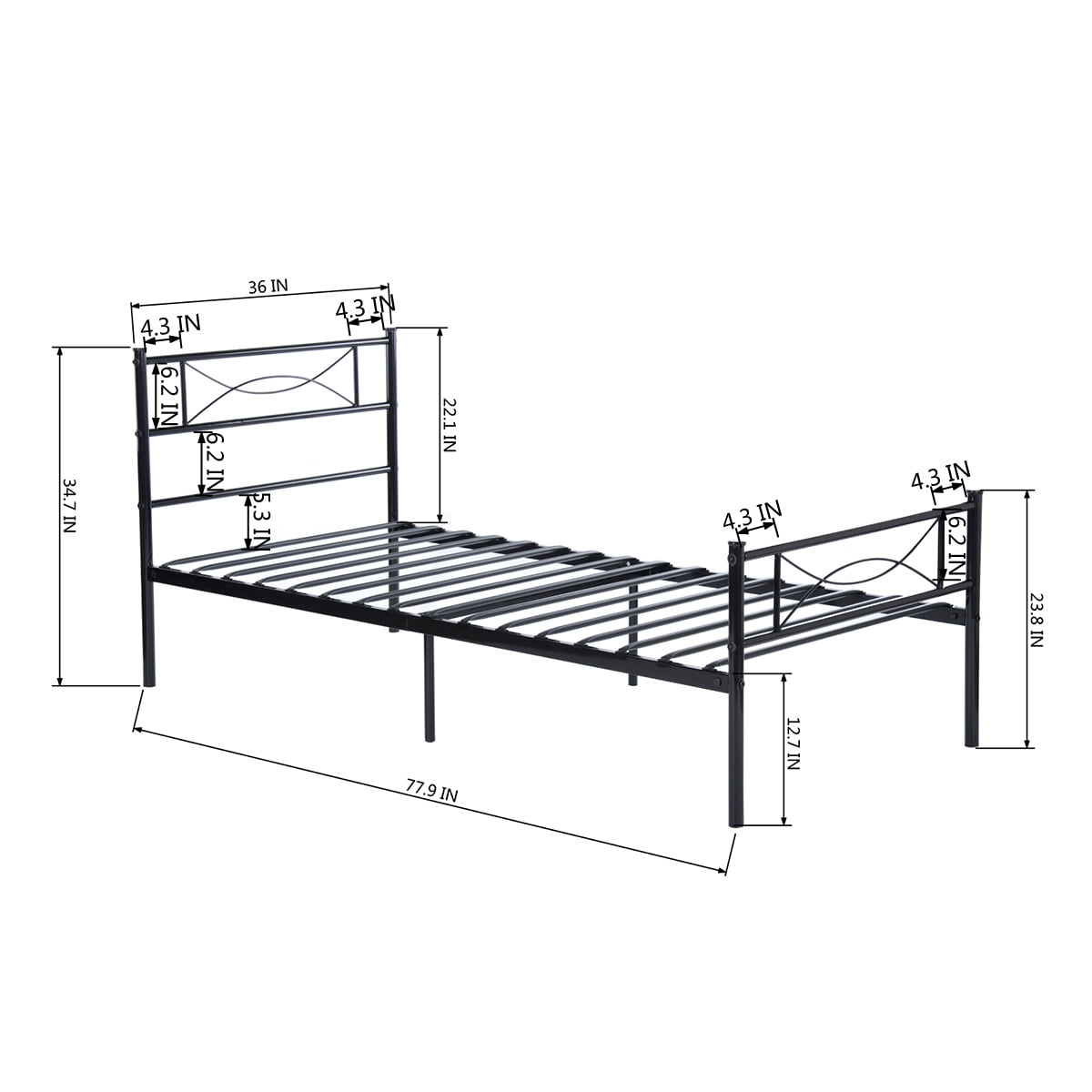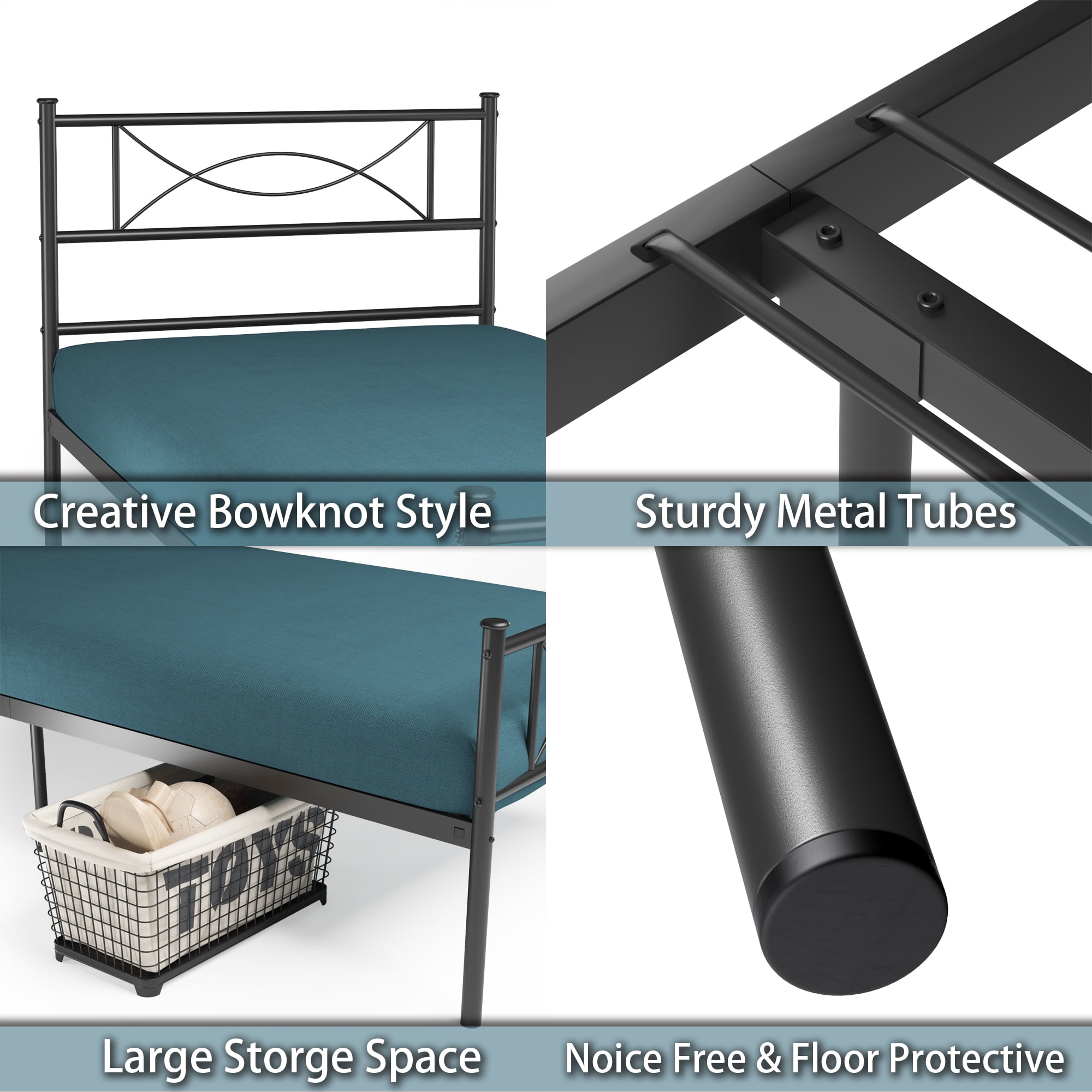 Features: Sturdy Construction Bed Frame – This twin bed frame in good quality metal frame Strong steel tubing construction and Full-length guardrails provide the safety and comfortable sleep environment. Heavy Duty Support – The entire foundation is made from strong steel with 6 independent support legs made bedframes pretty durable, can support up to 450lbs. Easy to Assemble – It is easy for you to install the metal platform bed frame in short time with all the accessories and instructions are packaged well in the product parcel. Headboard and Footboard Design – Our kids metal bed frame designed in elegant a set of headboard and footboard. Besides that, the boards could keep the mattress on the frame from sliding. The bowknot pattern just like a smile, give you happy mood every day. No Box Spring Required – The mattress can be put on the slates directly, ideal for sleepers looking to break away from a bulky box spring. Ample Under Bed Storage – 12.7-inch ample under bed storage space which can make convenient to storage boxes, toys, books, quilts and shoes ect. It’s save your space and makes your bedroom clean and tidy. Vivacious Bedroom – Add a touch of vivacious to your or your kid’s bedroom with this metal bed frame and make the most out of your bedroom space with this Multi-functional Twin Bed. Specifications: Material: Durable Steel Bed dimension: 77.9 x 36 x 34.7inches Headboard Height: 34.7inches; Footboard Height: 23.8inches Capacity: 300 – 450lbs Package Size: 40 x 10 x 5 inches Package Weight: 33lbs No box spring needed High headboard designed for comfortable rely on Package Included: 1 x Twin Bed frame with headboard and footboard 1 x Instruction for installation 1 x Poly bag 1 x Screw Set 1 x Components