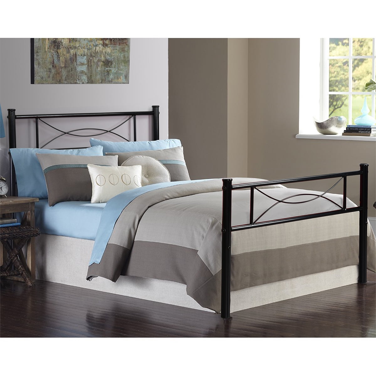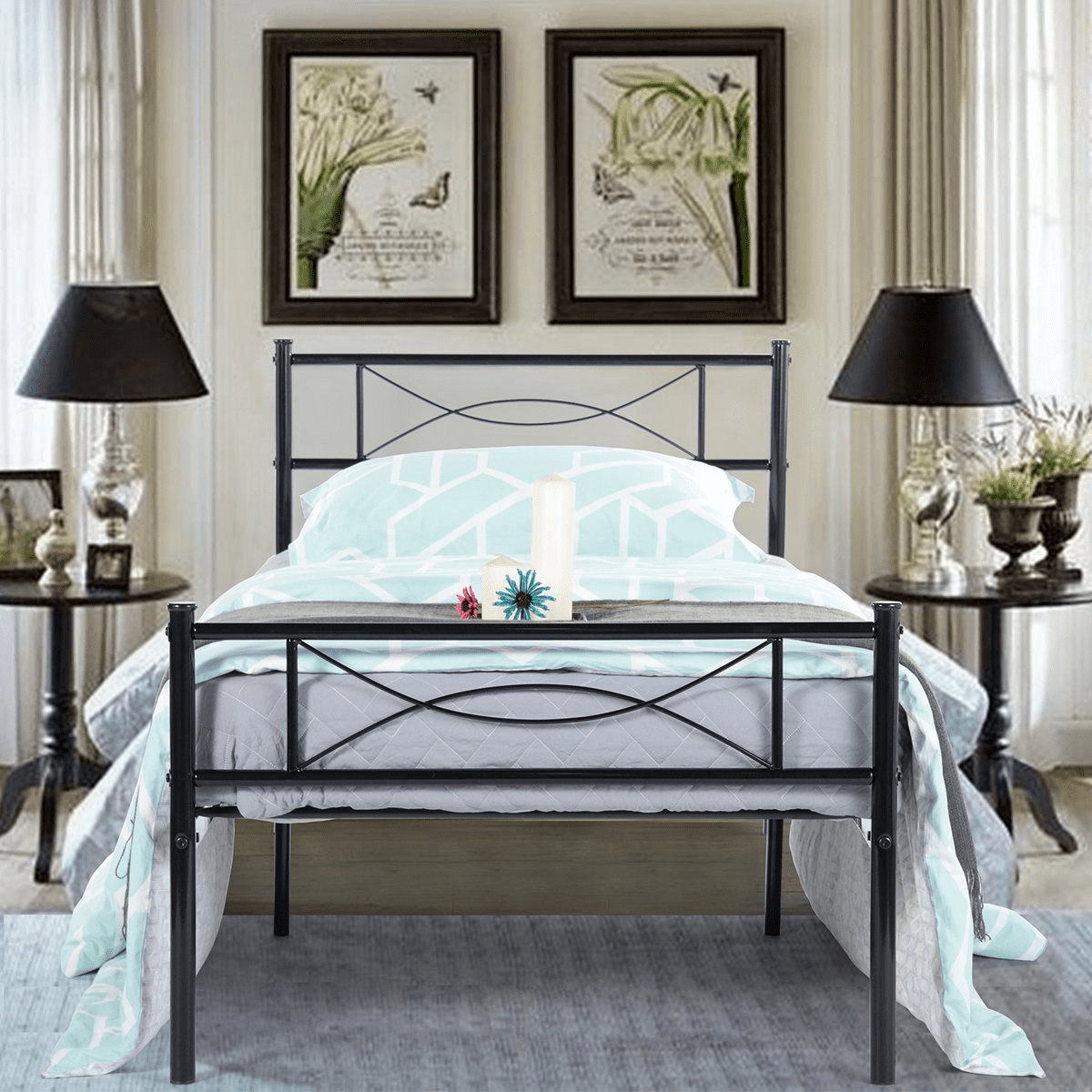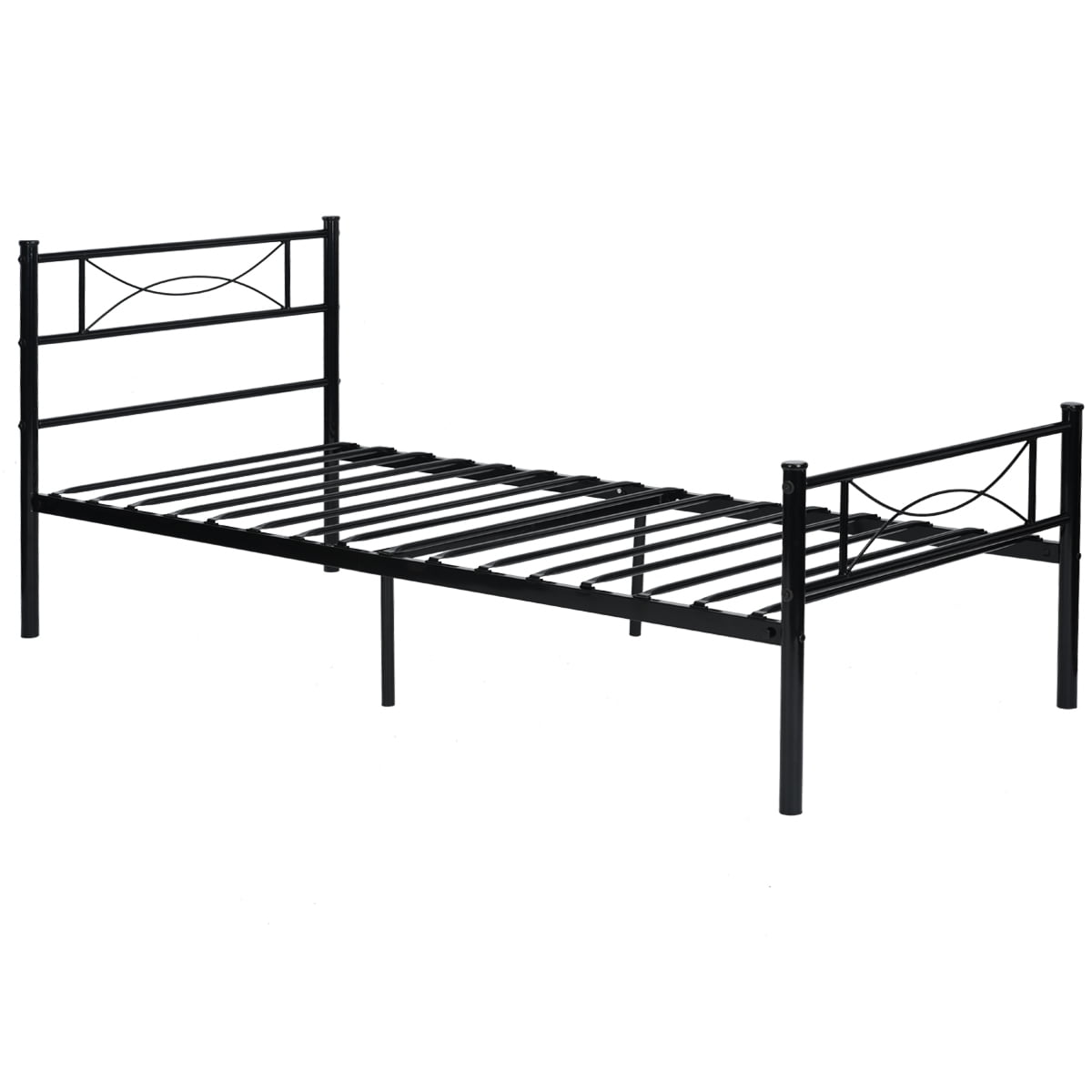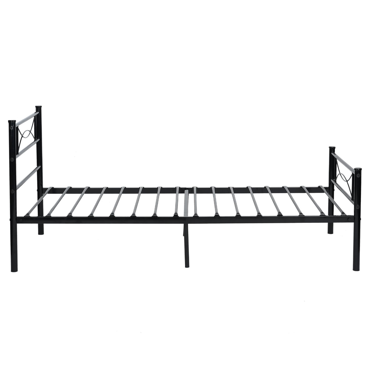 BEST fit for average weight people, Hold up to 176LBS.No tools are required, assembles in minutes Provides extra under-the-bed storage space with a vertical clearance of about 12.7 inches Twin platform bed Design noise-free, supportive foundation for a mattress; no box spring needed Mattress, box spring, and bedding (comforter, sheets, pillows, etc.)are NOT included. Features: This sturdy bed frame is the perfect platform to hold your standard twin-size mattress and eliminates the need for a box spring. The steel bed frame features provide a solid support for the mattress as well as even body distribution for a restful night’s sleep. The metal slats can curve downwards and adjust to fit your body and your sleeping position. The standard height is suitable for a standard-size bed skirt. The bed frame benefits from a strong steel frame, steel legs including extra side legs, and a middle support beam. Holds up to 180 pounds (80 kg). Assembly required. Takes less than 60 minutes to assemble.Specifics: Material: Metal Color: Black Item Size: 77.5″ x 36″ x 34.8″ (L * W * H) Weight: NW: 29.9 lb GW: 32.6 lb