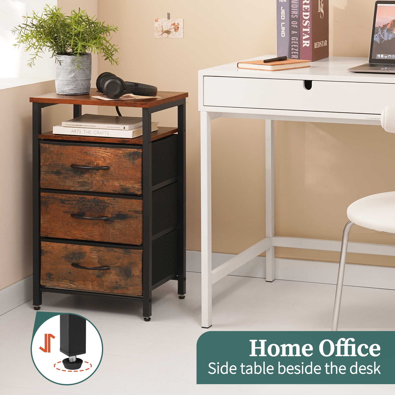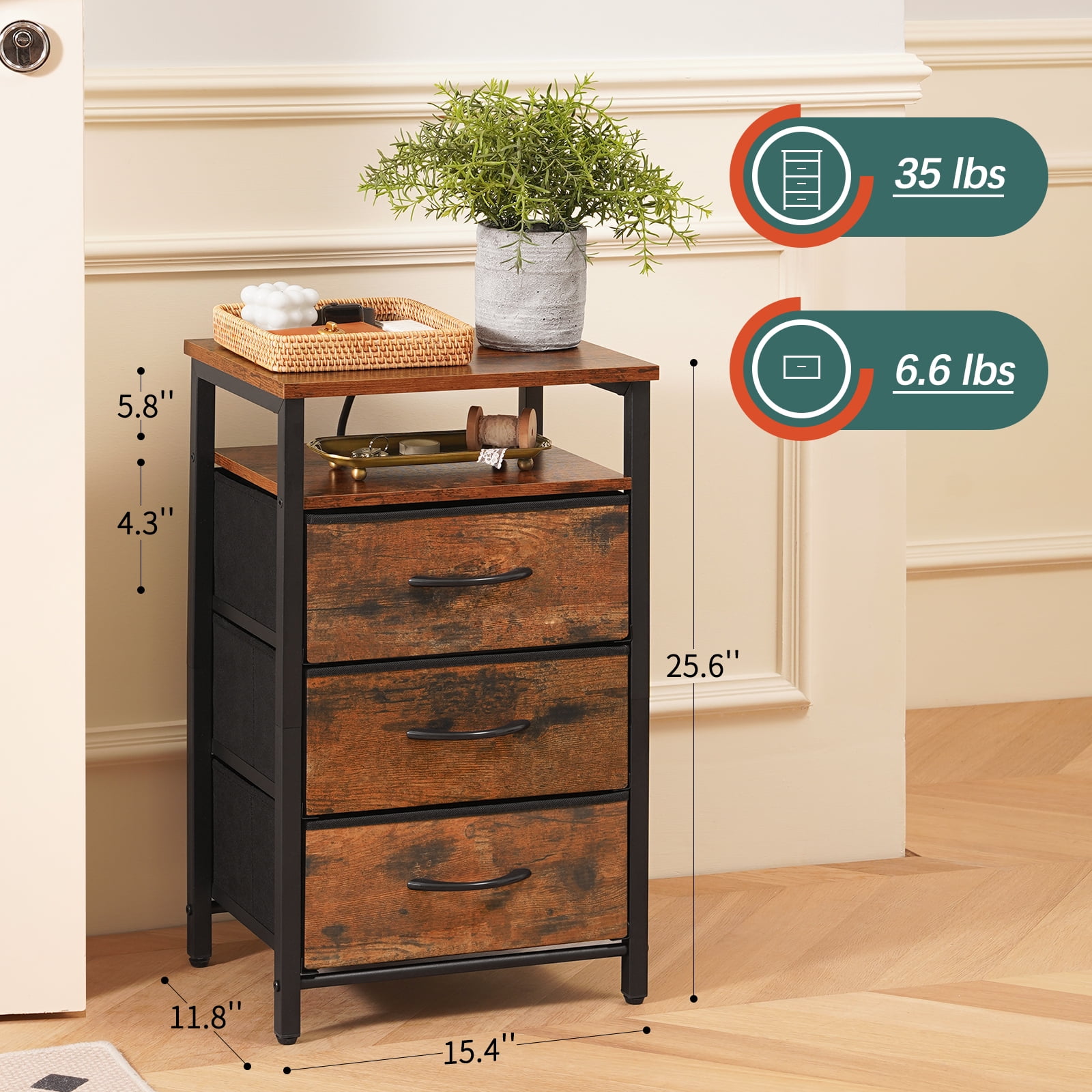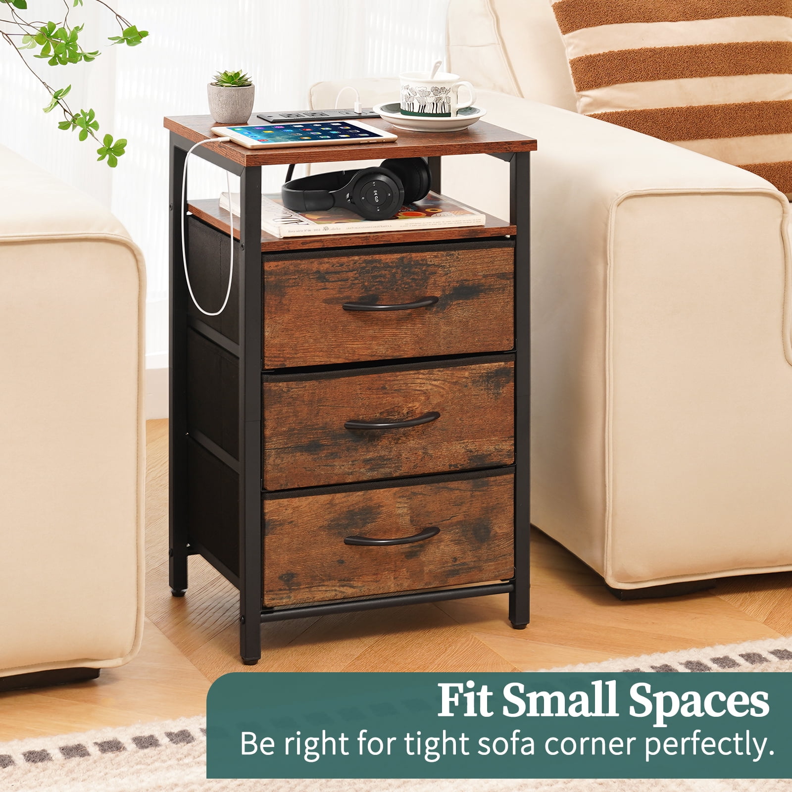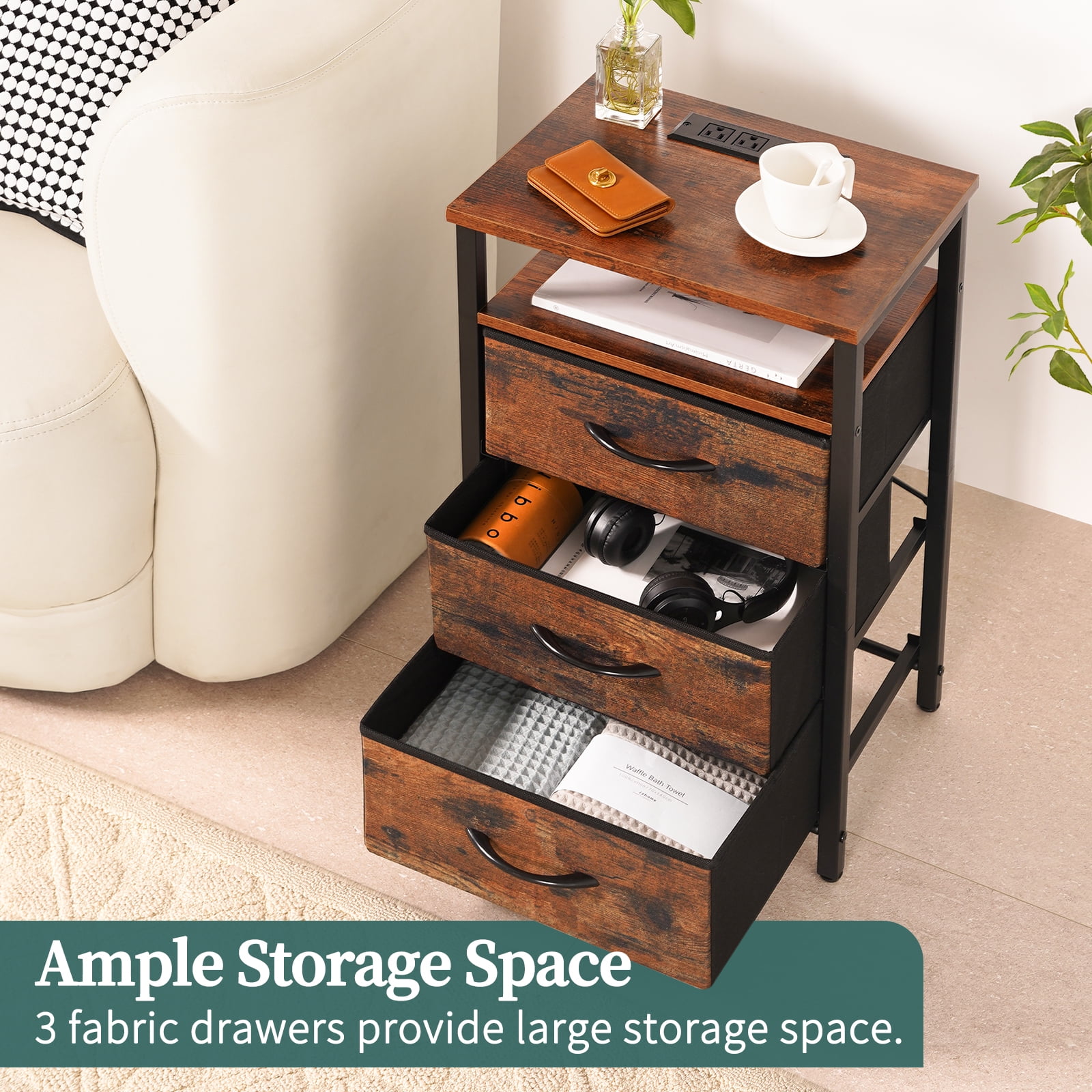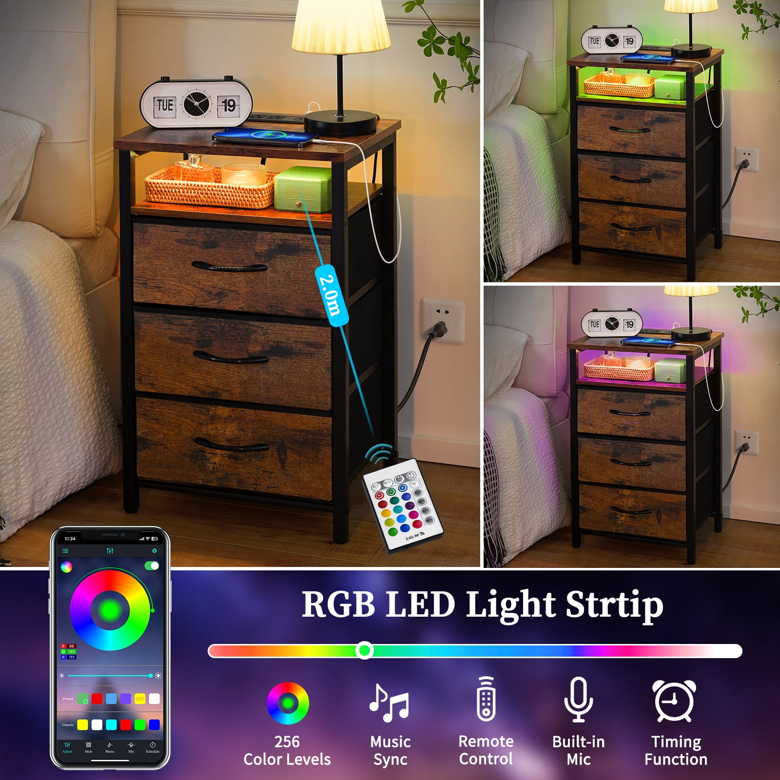 Yoobure bedside table with LED light is your faithful partner in falling asleep. Featured with 20 RGB colors, 22 dynamic modes, the LED light can adjust color, brightness by remote or APP as you go. the end tables with Type C, USB ports and 2 AC outlets, the side table can easily charge your phone or iPad. The built-in outlet is upgraded with a more user-friendly layout to avoid cable mess.Featured with 5 storage parts, the small table can keep your areas clutter-free. 3 fabric storage drawers provide generous space to organize odds and ends such as remote, keys or glasses.Yoobure night stand is made of sturdy frame, robust wood board and non-woven fabric. The durable and lightweight fabric drawer of side tables bedroom can bear 6.6 lbs and the table top of the nightstand with charging station can hold up to 35 lbs. The end tables living room are compact to perfectly fit into tight space. And their light selfweight helps to easy moving. The small nightstand can seamlessly blend with bedroom, living room or college dorm. Product Parameters : Color: Berry Brown/White/Black Material : Steel Frame,Wooden Board, Fabric Drawer,Led Strip Load Capacity of the Table Top :35 lbs Load Capacity of Each Drawer : 6.6 lbs Overall Table Size :15.4”Lx11.8”W x25.6”H Size of Fabric Drawer :13.2”Lx10.8”Wx5.8”H