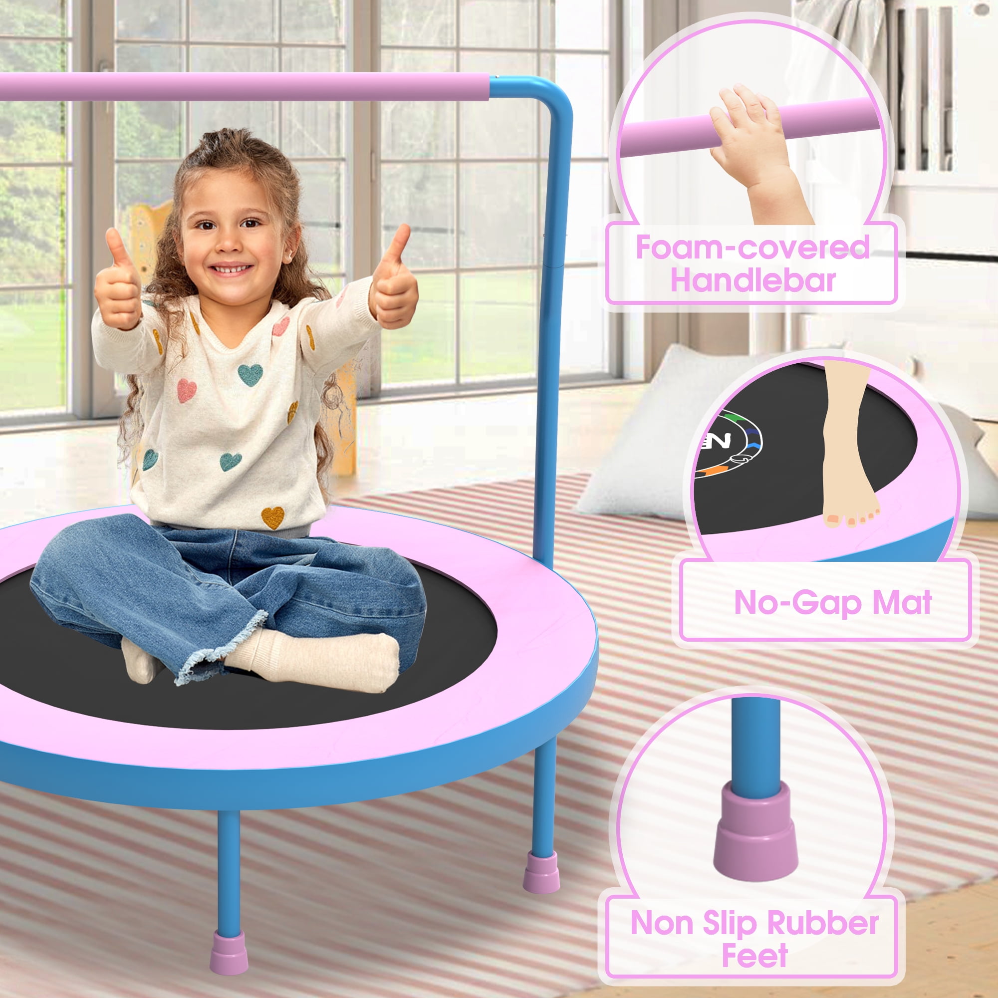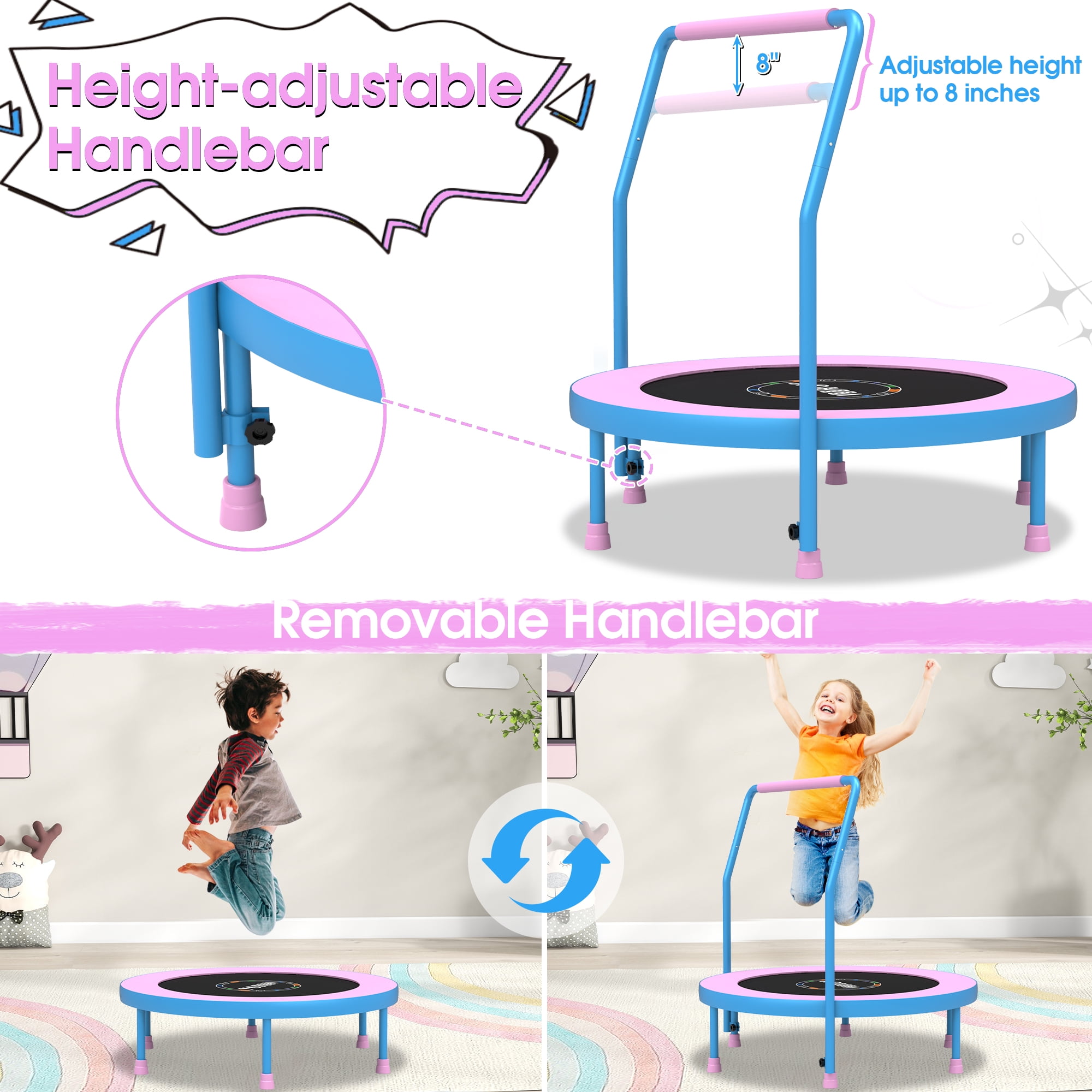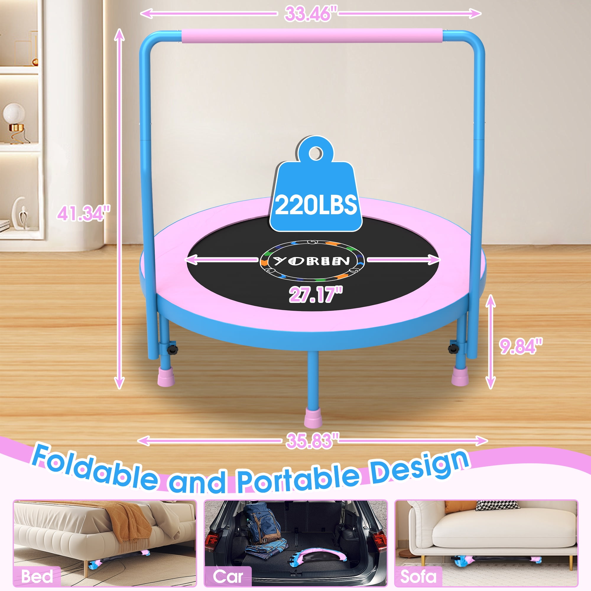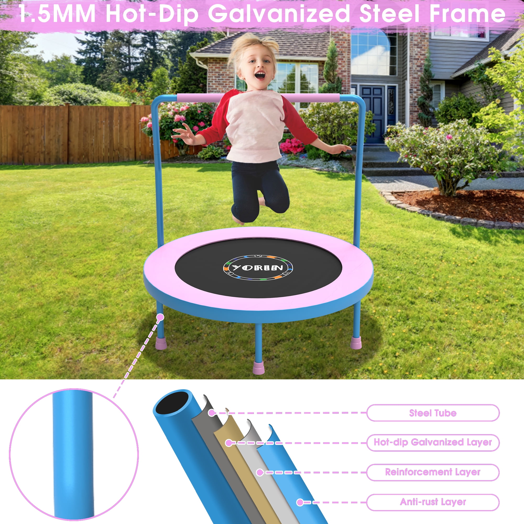 YORIN 36IN Mini Trampoline: YORIN mini trampoline is designed for children aged 1-6 years. It features 6 thickened legs with non-slip and silent foot covers, effectively reducing noise, enhancing stability, and ensuring safety by securely gripping the ground, offering comprehensive safety protection. Not just for fun, our trampoline helps increase bone density, enhance muscle control and coordination, promote circulation, and combat childhood obesity, fostering a closer bond between parents and children. Adjustable Height and Removable Handlebar: The YORIN toddler trampoline is designed with an adjustable handlebar to accommodate children of different heights, it can be adjusted between 33 inches and 41 inches in height. The handlebar is wrapped in thick foam cover to prevent injuries from bumps during jumping, ensuring comfort and safety. If your child prefers to jump without it, the handlebar can be easily removed, making the trampoline adaptable as your child grows. Springless and Foldable Design: YORIN foldable trampoline features a springless design, using elastic bands instead of traditional springs. These elastic bands have undergone 20,000 extreme bounce tests, providing excellent bounce while ensuring safety and durability, eliminating the risk of spring-related injuries for safer use by children. The trampoline’s foldable design allows for easy storage, folding down to a compact size of 16 x 10 inches, making it perfect for tight spaces or on-the-go families. YORIN vs. Other Products: YORIN’s 36-inch trampoline frame adopts 1.5mm thick full galvanized and full spray steel, offering stronger support and longer durability compared to the 1mm standard steel used in other trampolines. It features a 2-in-1 elastic jump mat with a thickened cover pad that fully covers the elastic bands, preventing any gaps to ensure safe bouncing. The trampoline has a 220lbs weight capacity, with an EU-standard polypropylene bounce surface providing unmatched bounce quality. Easy Assembly and After-Sales Service: YORIN indoor trampoline comes partially pre-assembled, allowing for quick and easy installation in just minutes. YORIN provides a detailed manual with illustrated instructions, with all parts and steps clearly labeled and numbered. One adult can complete the assembly in about 10 minutes. YORIN 36-inch trampoline includes an 18-month warranty. If you have any questions, feel free to email us for further assistance; we will respond within 12 hours.