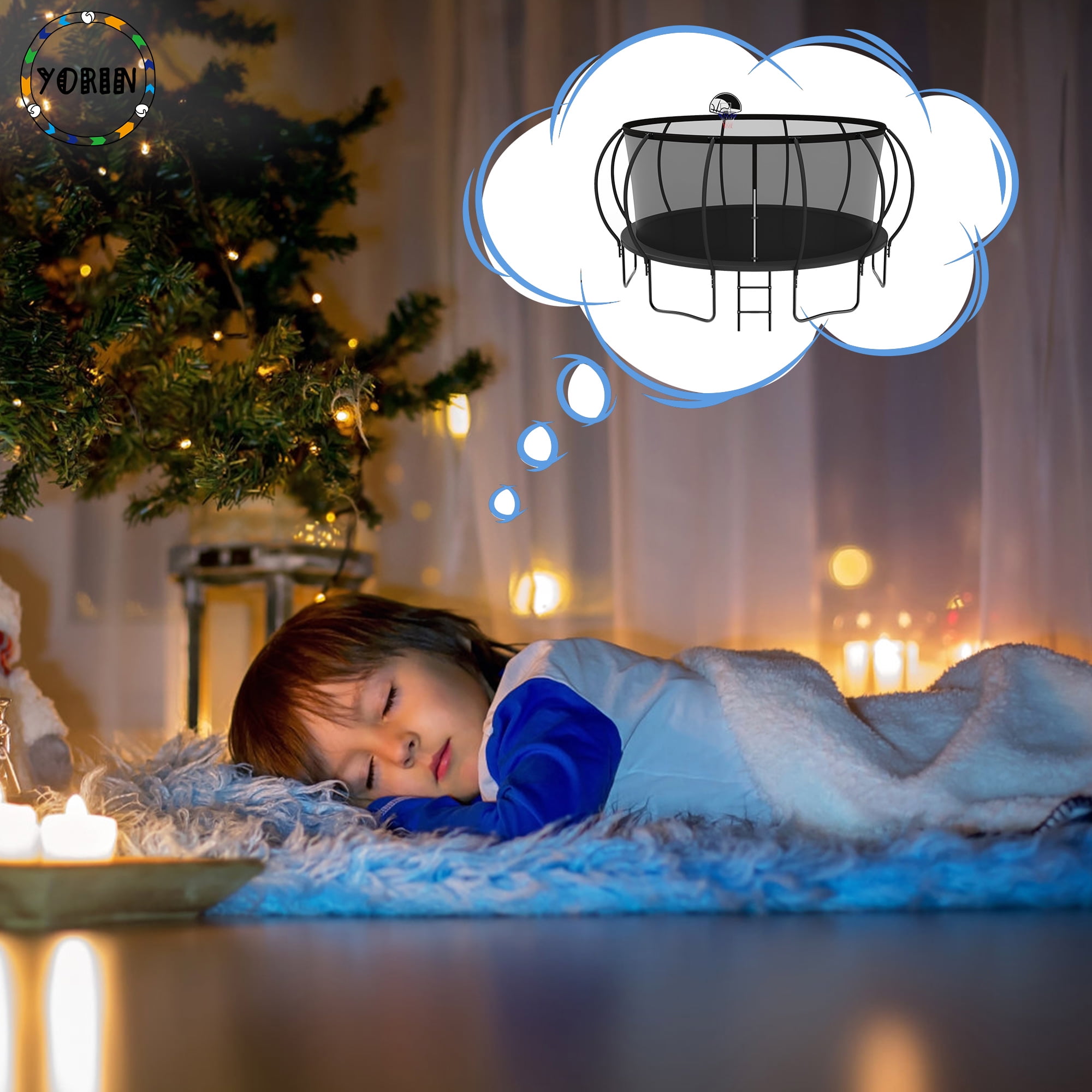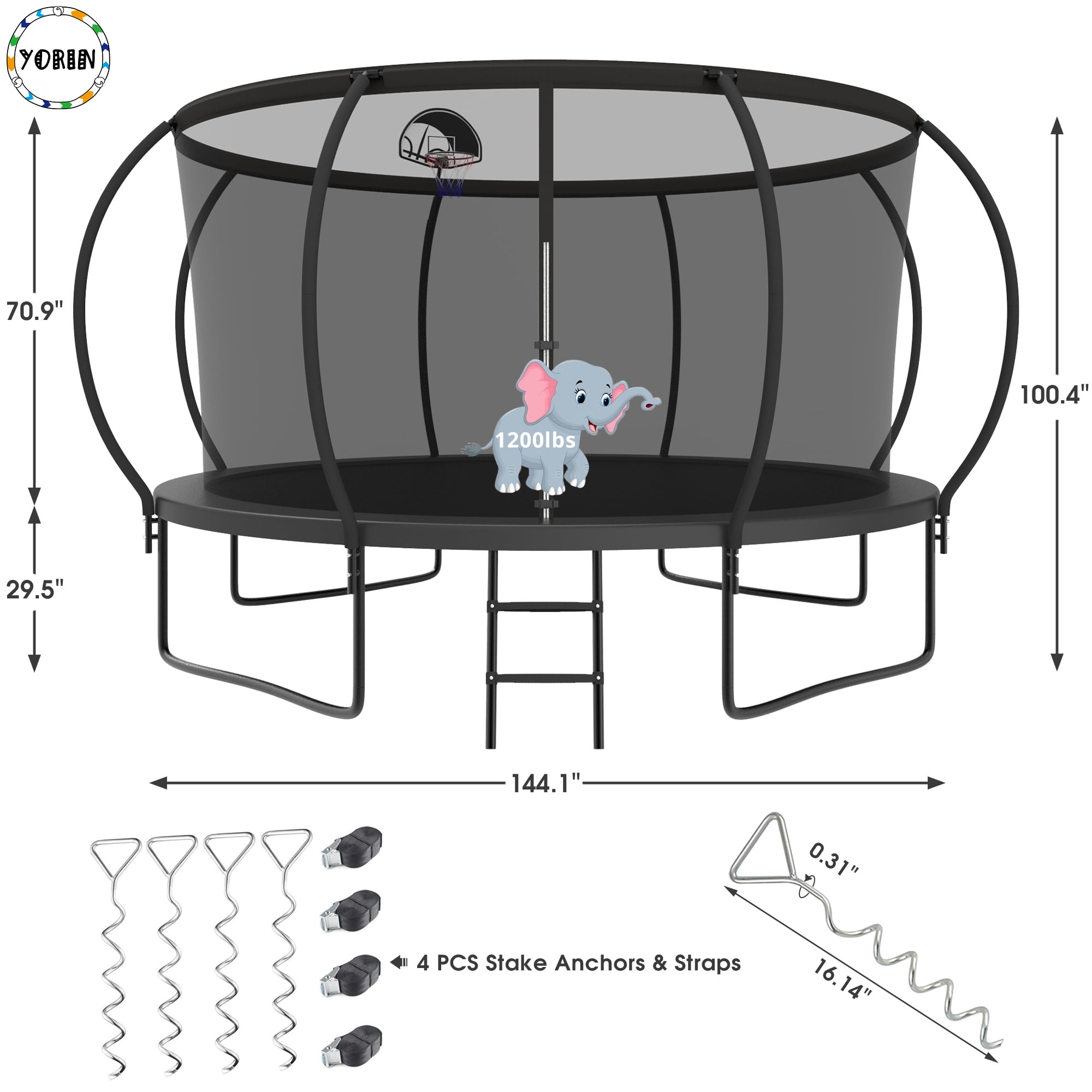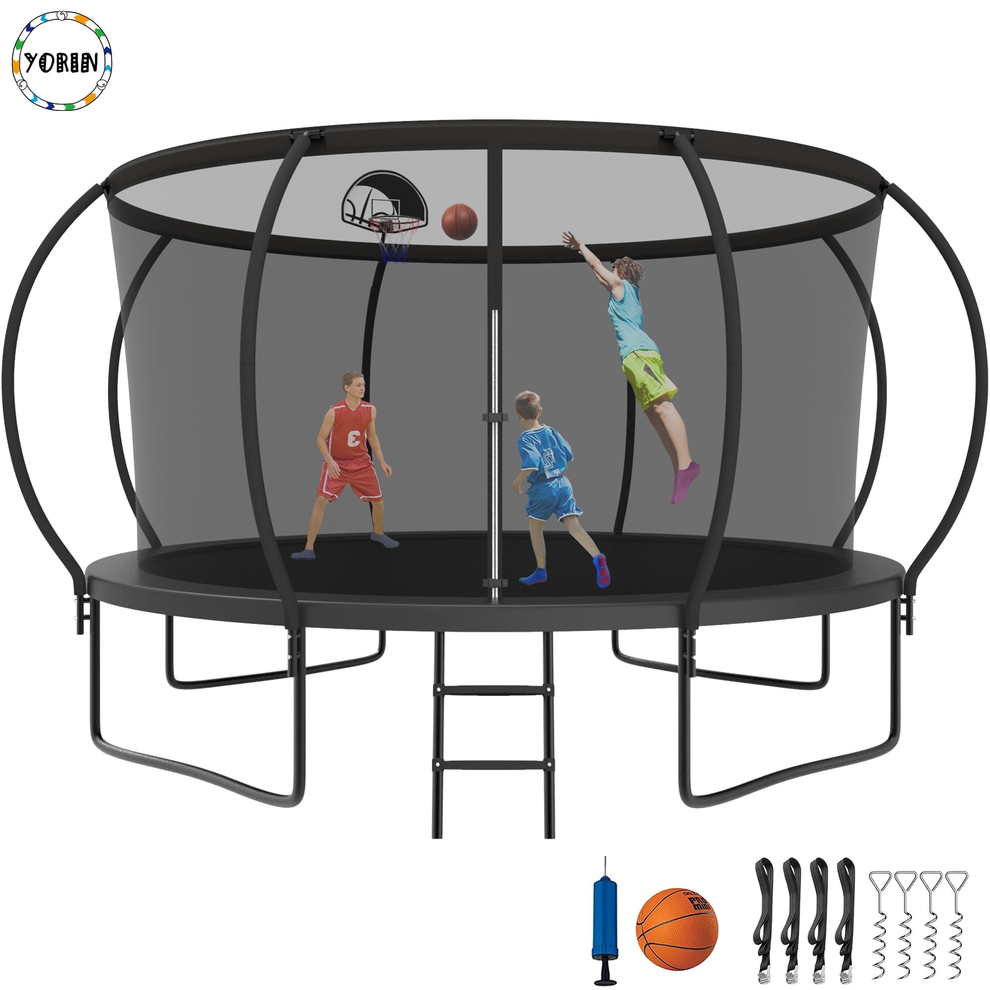 YORIN Trampoline for 5-6 Kids, 12 FT Trampoline for Adults with Enclosure Net, Basketball Hoop, Ladder, 1200LBS Weight Capacity Outdoor Recreational Trampoline, Heavy Duty Trampoline