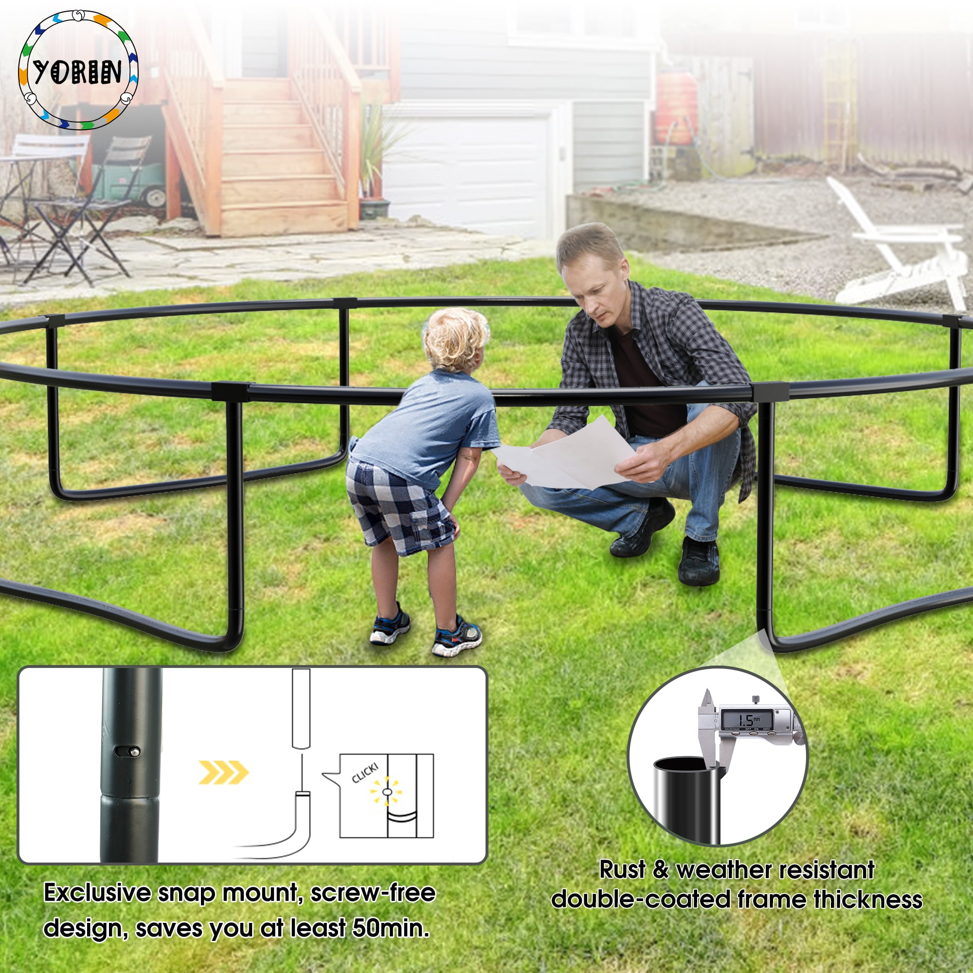 2025 Upgrade Curved Poles Trampoline – Black trampoline 12ft with curved poles increased the distance between poles and nets(up to 21.5 inches), which is double of an ordinary trampoline(only 9-12 inches). Eliminating the possibility of injuries effectively. Full Spray Trampoline Frame Tubes – All 12 ft trampoline frame tubes(leg base, circle frame and net poles) are full sprayed for 100% anti-rust and anti-corrosion, making this trampoline last longer in bad weather. One trampoline serves years. Best gift for your family and kids. 12FT 1200LBS Trampoline for kids and Adults – Whole trampoline frame tube is made of 1.5mm cold-rolled steel, ensuring heavy-duty trampoline quality. 4 W-shaped base legs and 8 enclosure net poles provide ensured trampoline stability. 64 galvanized trampoline springs have been tested for more than 2000 times without deformation. All premium designs support excellent jumping performance. Outdoor Trampoline with Basketball hoop – The flexible trampoline basketball hoop is made of weather-resistant material that will not easily get damaged. Jumping and shooting at ease and double the pleasure of family outdoor backyard playtime. Easy to Install within 2 Hours – 12 ft trampoline with net provides a detailed instruction manual for quick installation, which covers all installation steps. 2 trampoline spring loading hook comes with this backyard trampoline for easy spring loading. 2 adults can finish the installation within 2 hours. NOTE: all trampoline springs should be installed in X-shape. 100% Worry-free After Sales Service – Outdoor trampoline 1200lbs comes with 30-day money back for no reason, 18-month warranty including all trampoline accessories. Please email us to get more help if you have any concerns, we will give you a prompt reply within 12 hours. Note: sprinkler and light are in a separate parcel to avoid being damaged in transit.